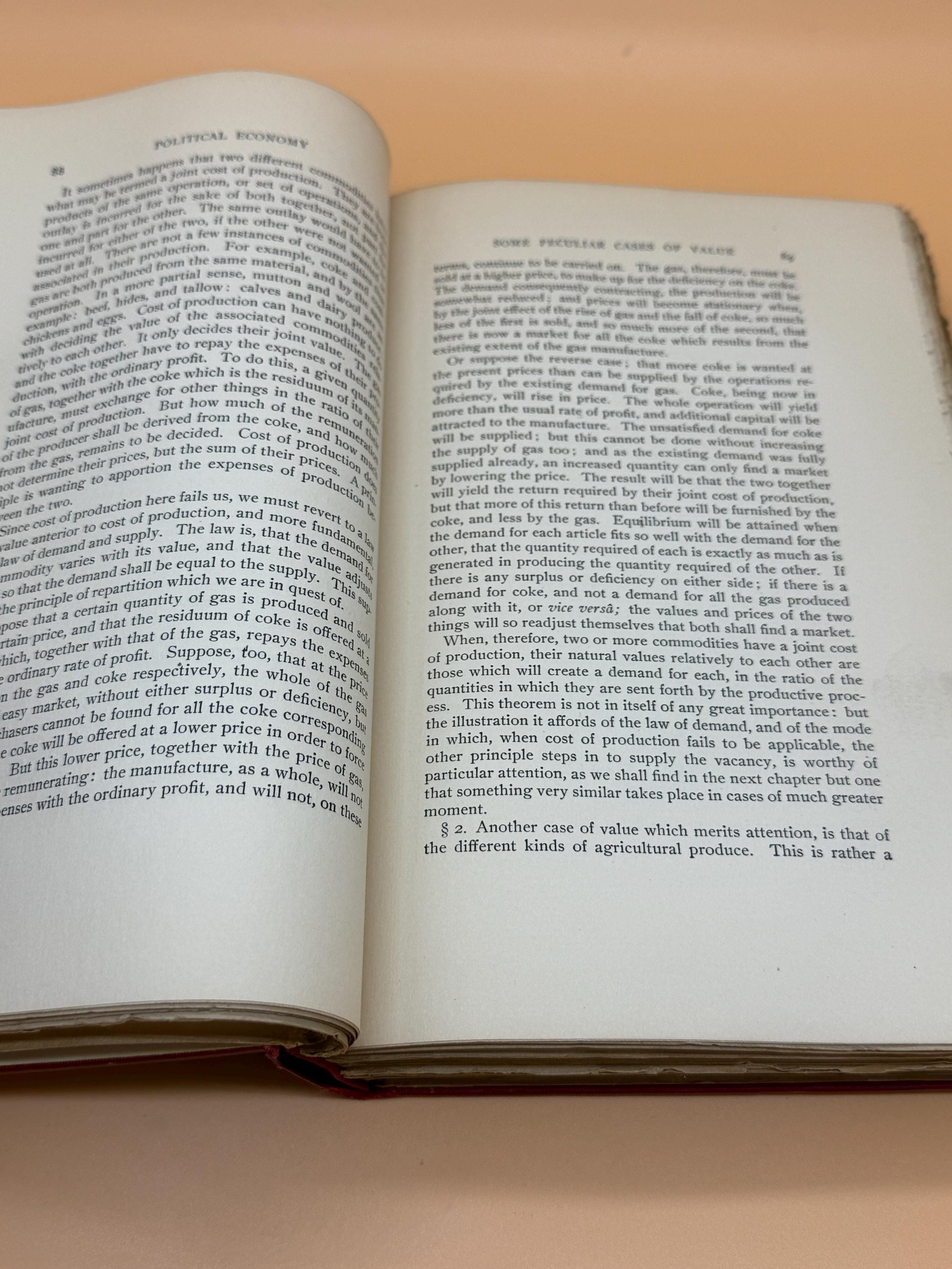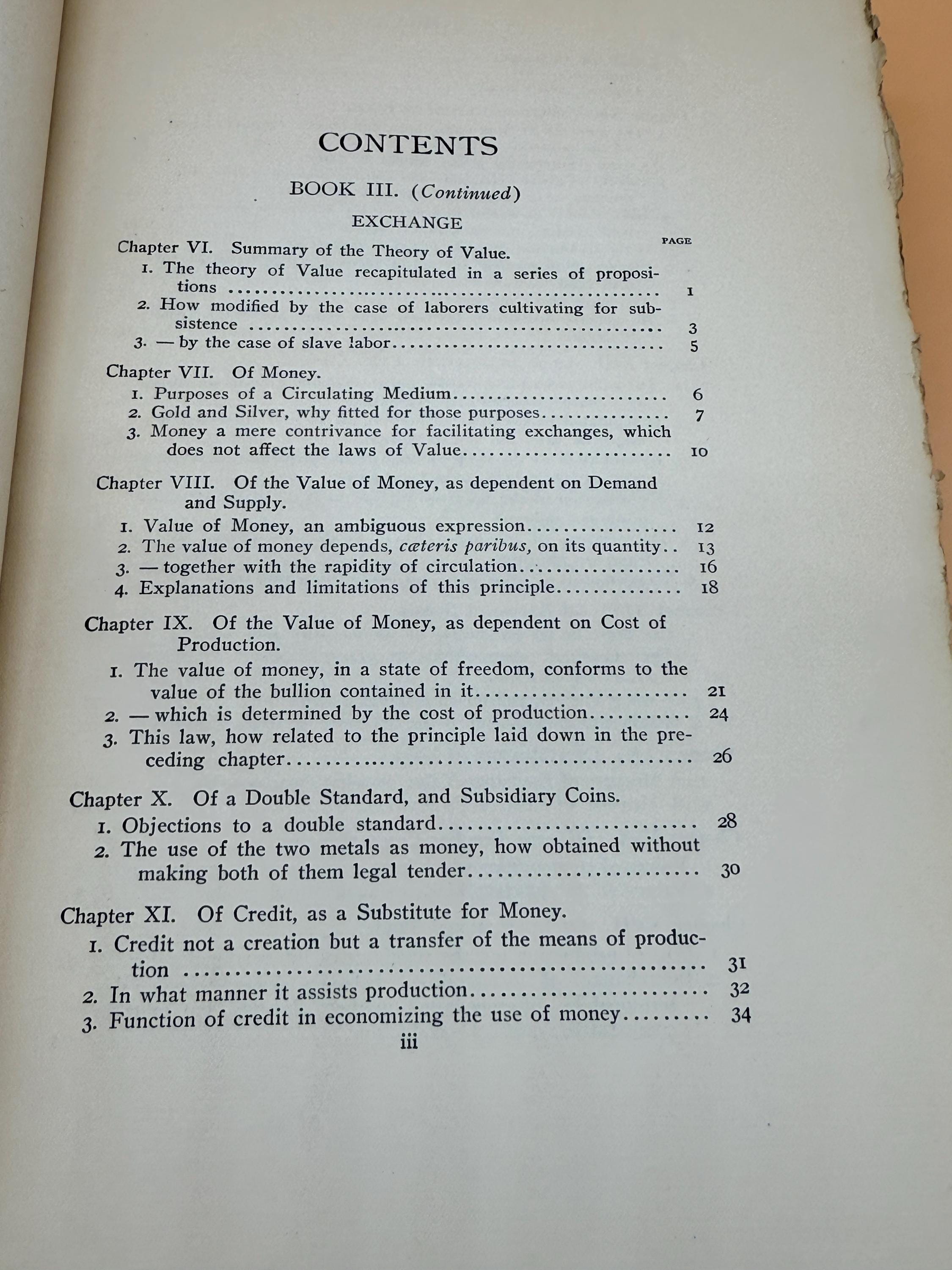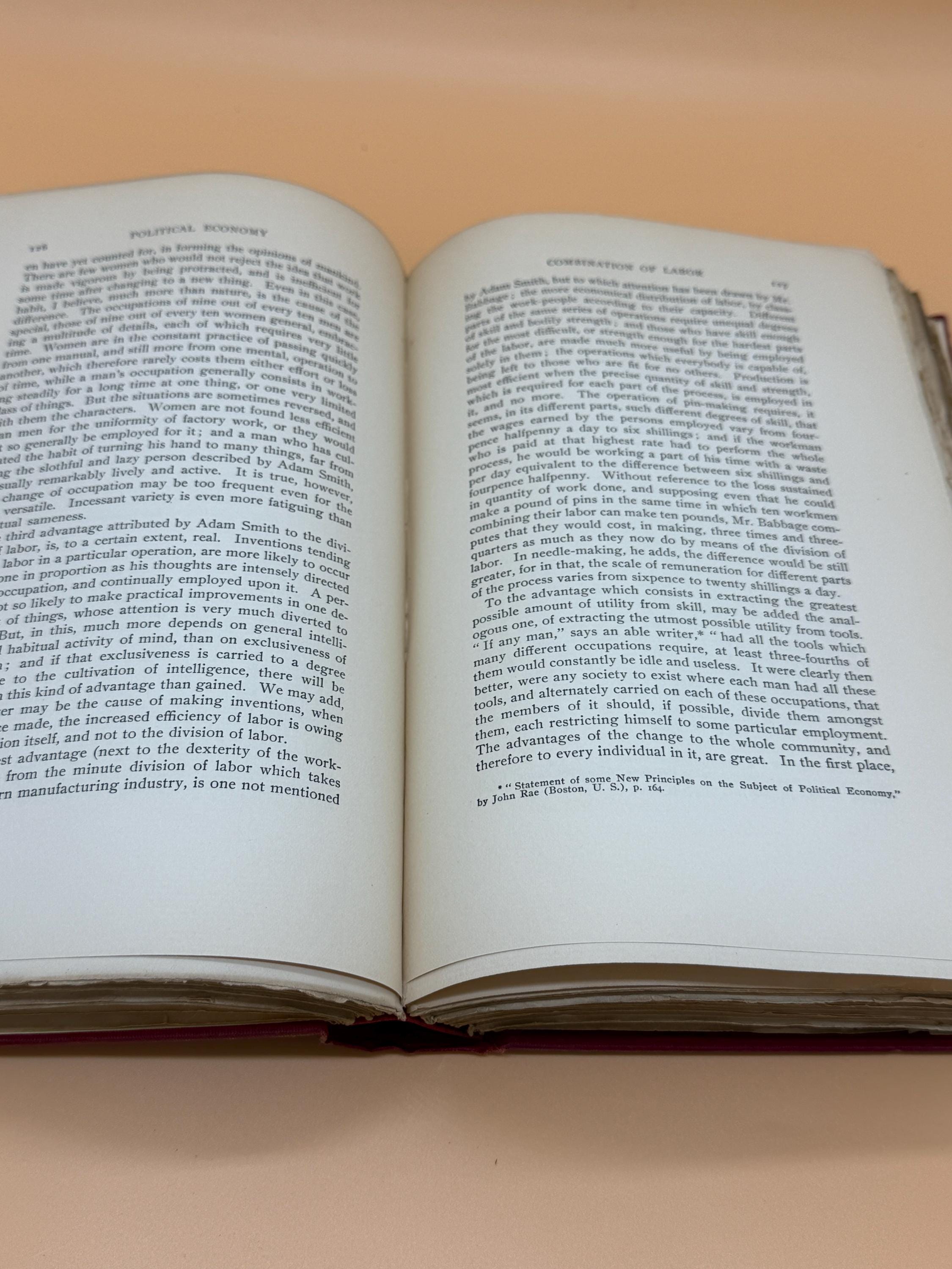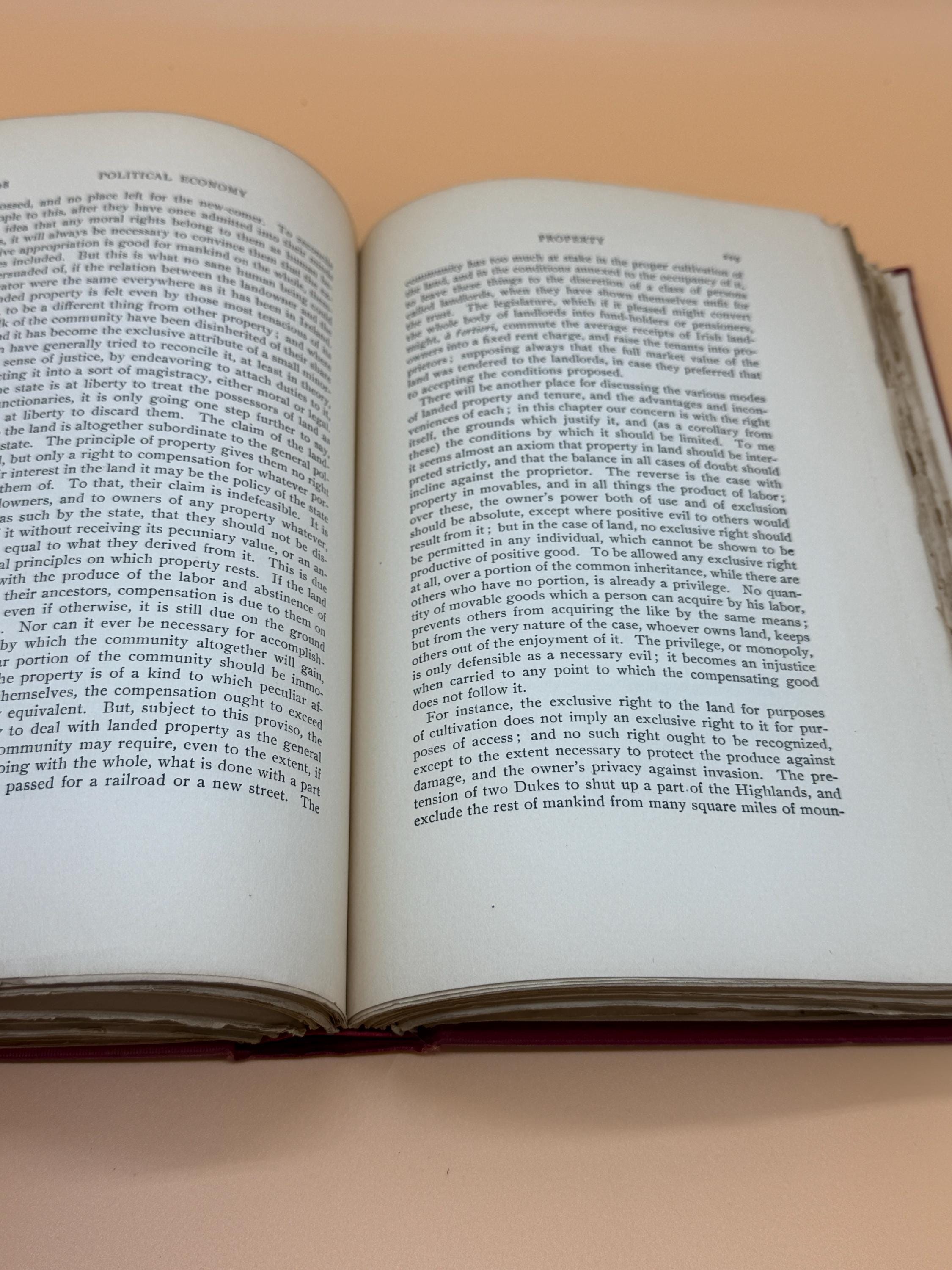This two volume set is Principles of Political Economy by John Stuart Mill. It is subtitled With Some of Their Applications to Social Philosophy. It contains a special Intro by Arthur T. Hadley, President of Yale University until 1899. Both volume feature an illustrated frontispiece with original tissue guard still in place.