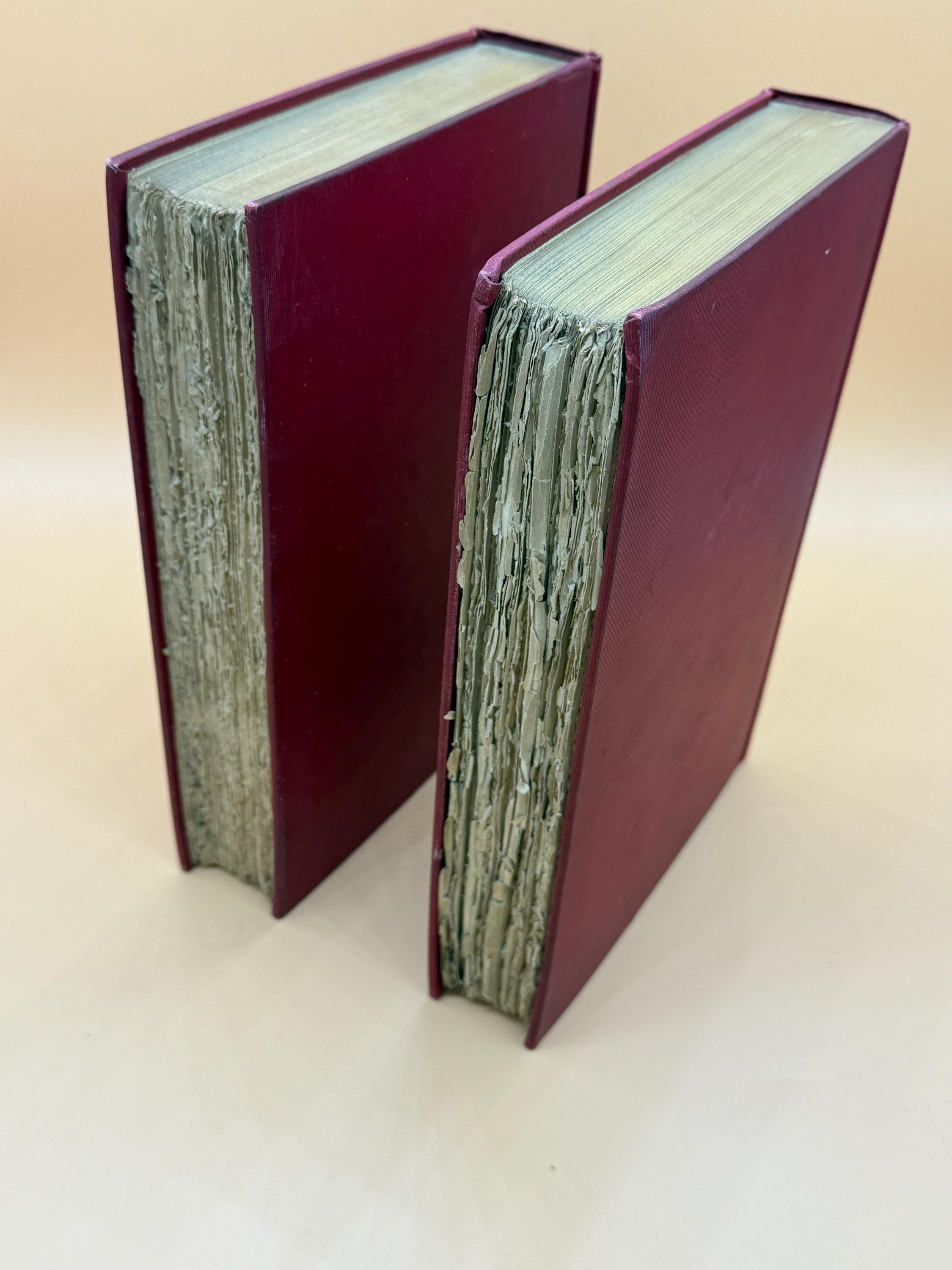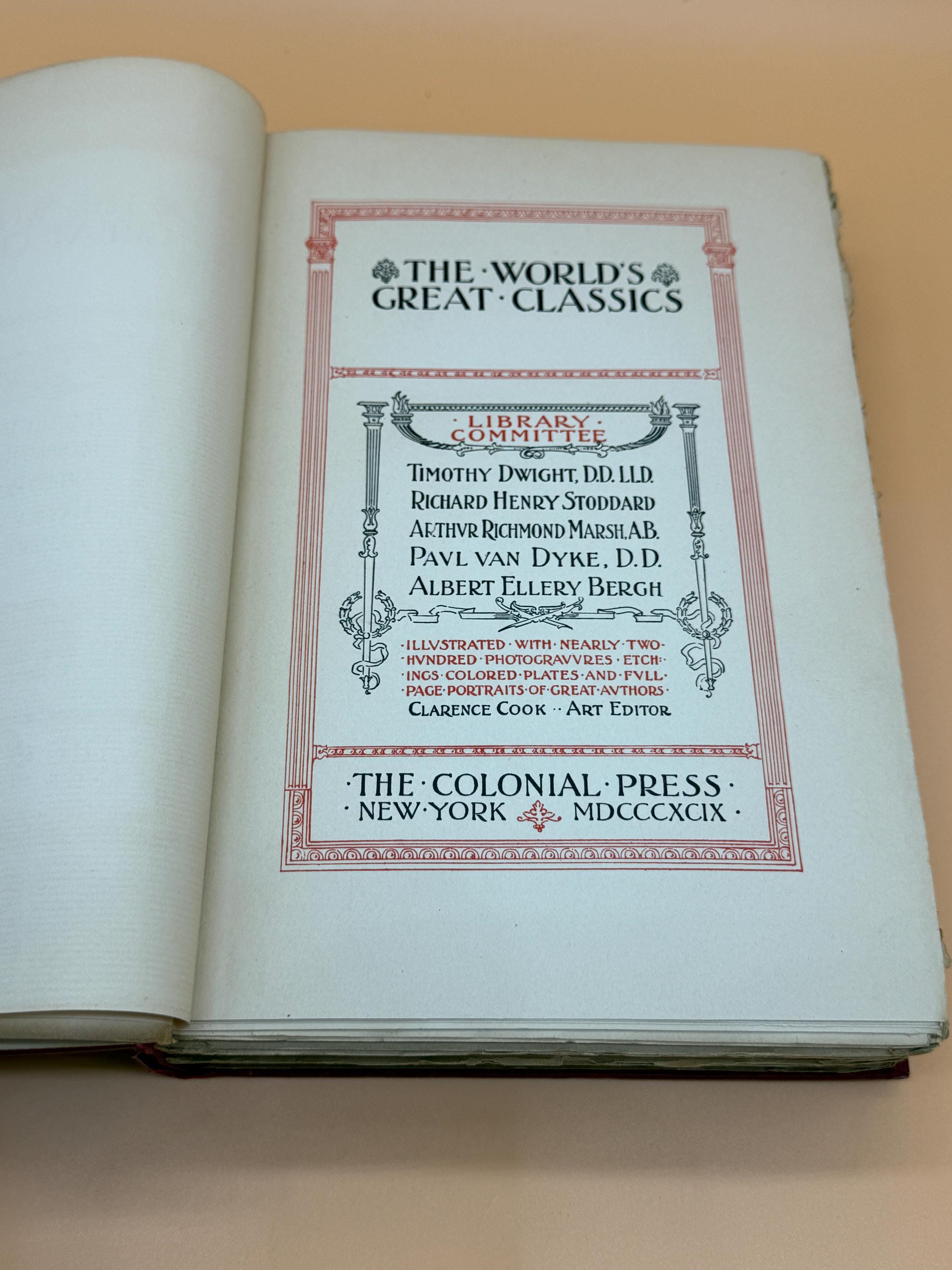 This is a good 2 volume set of hardcovers. 1899 The Colonial Press, The Worlds Great Classics series. PLEASE READ DESCRIPTION, BOOKS ARE 126 YRS OLD. The pages inside are good, and when published to save costs, the paper used appears uncut, rough uneven edges. Some of the pages are actually slightly smaller than others leaving a rough cut leafed appearance, see photos. PLEASE NOTE You will find some pages "uncut" which means the publisher used one sheet, printed both sides front and back, and then founded in half and bound as uncut leaving the inside or back of the printed page "uncut" which can be opened with a simple cut to the uncut edge. This is very common in books of this type and age. It is a unique occurrence but not harmful. We have chosen to preserve the book is bound and not open the uncut pages. The pages are clean with light natural tanning from age, the paper used is somewhat stiff, fairly decent quality for the time period. Top page edges tipped in gold gilt which is showing wear. The binding is tight and all pages tight to binding. Black and white illustrated frontispiece. The volume is bound in red hardcover boards which are good condition with light shelf wear. The title lettering along spine is very good, clean and still legible but lightly worn. Medium octavo book size or 6.5" x 9.5" each