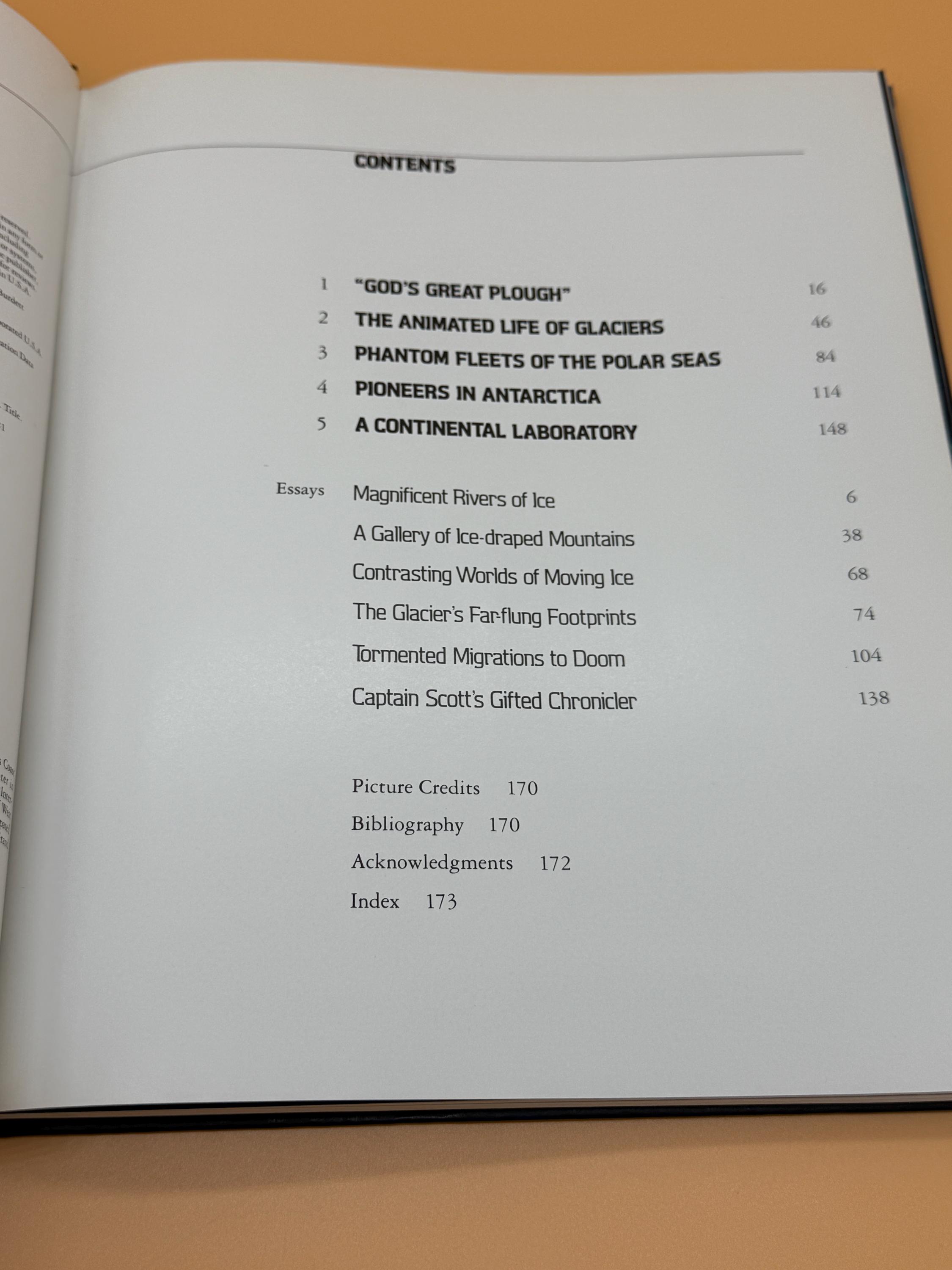 This is Glacier. Chapters include; The Animated Life of Glaciers, Pioneers in Antarctica, with essays such as Rivers of Ice, Worlds of Moving Ice, Captain Scott's Gifted Chronicler and more.