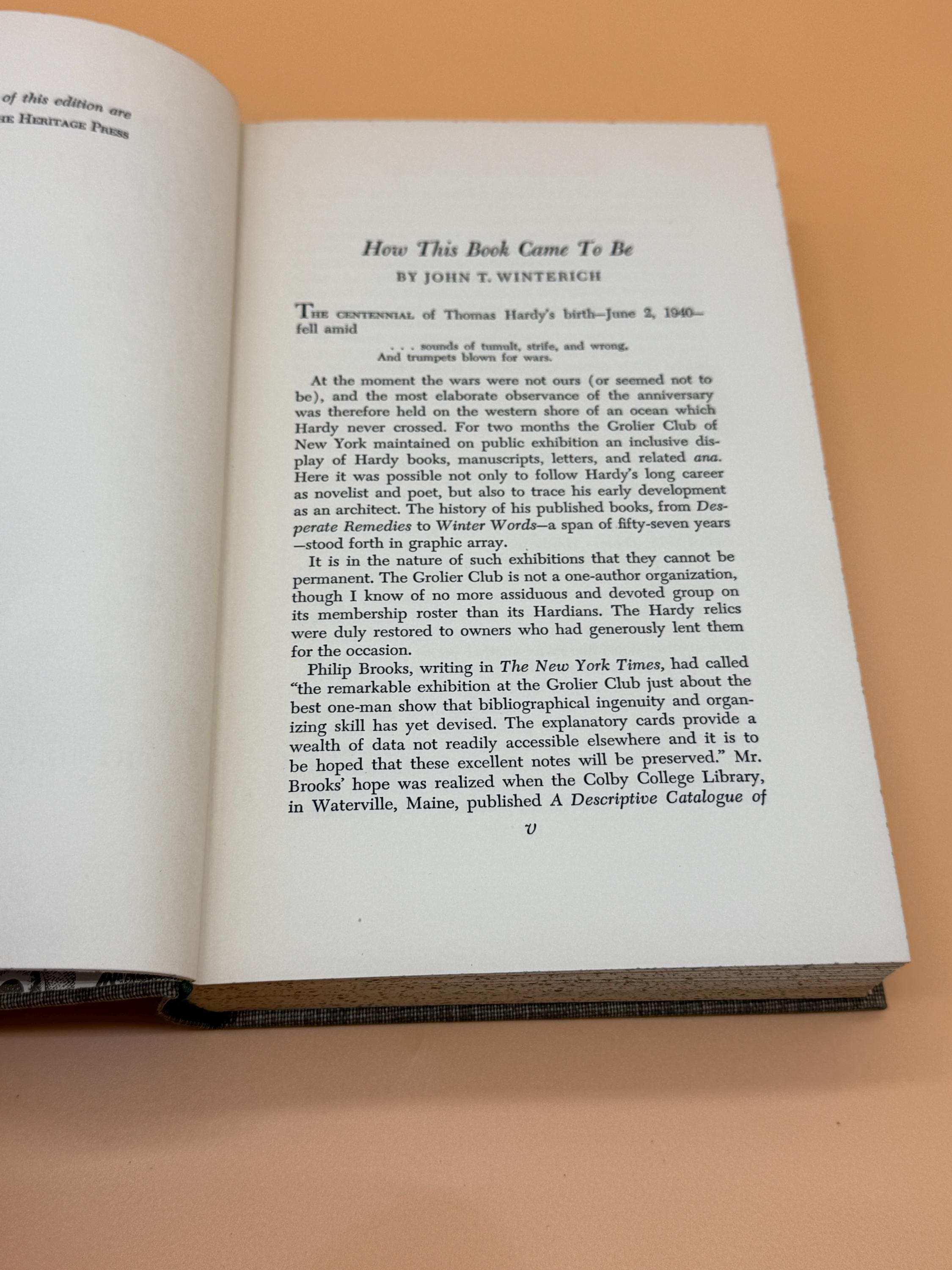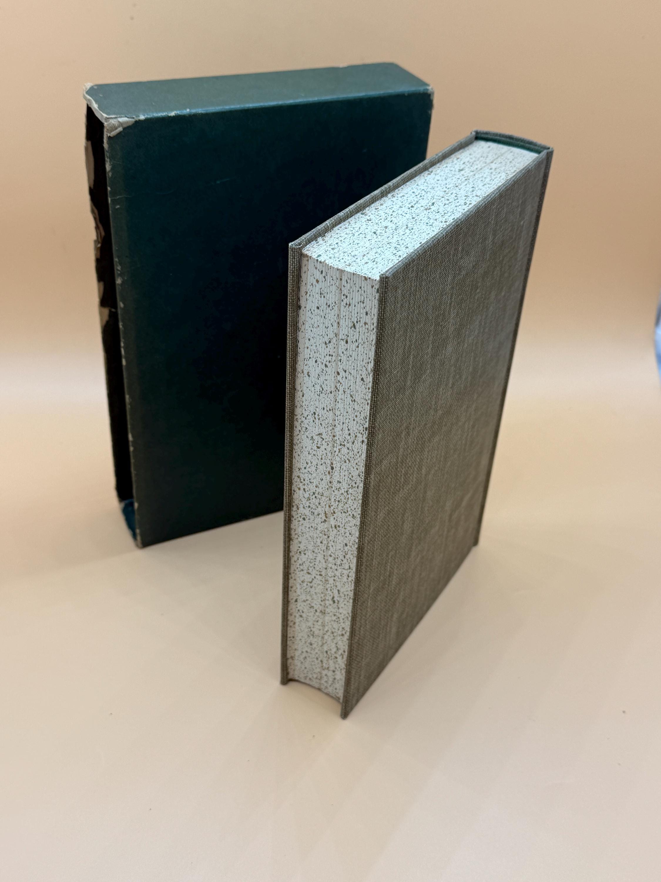 This is a very good hardcover with an acceptable slipcase. 1942 Heritage Press. This hardcover is very good inside and out. The pages inside are actually still crisp and clean. The binding is tight and straight. Outer page edges decorated in speckle. Brown hardcover boards are also very good with only a hint of shelf wear. The accompanying original slipcase is good/acceptable as solid but showing wear. Octavo book size or 6" x 9" with 416 pages and illustrated endpapers front and back.