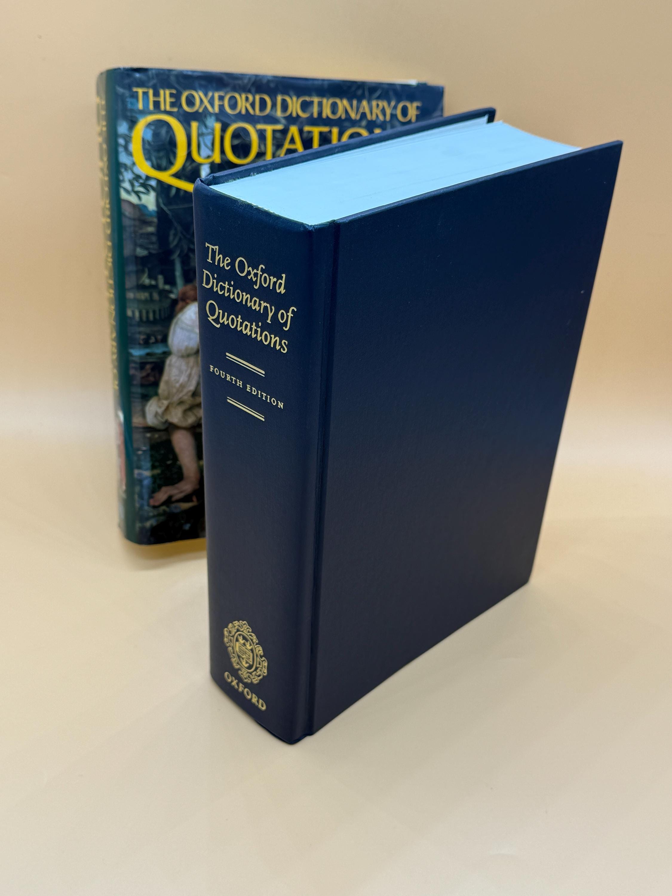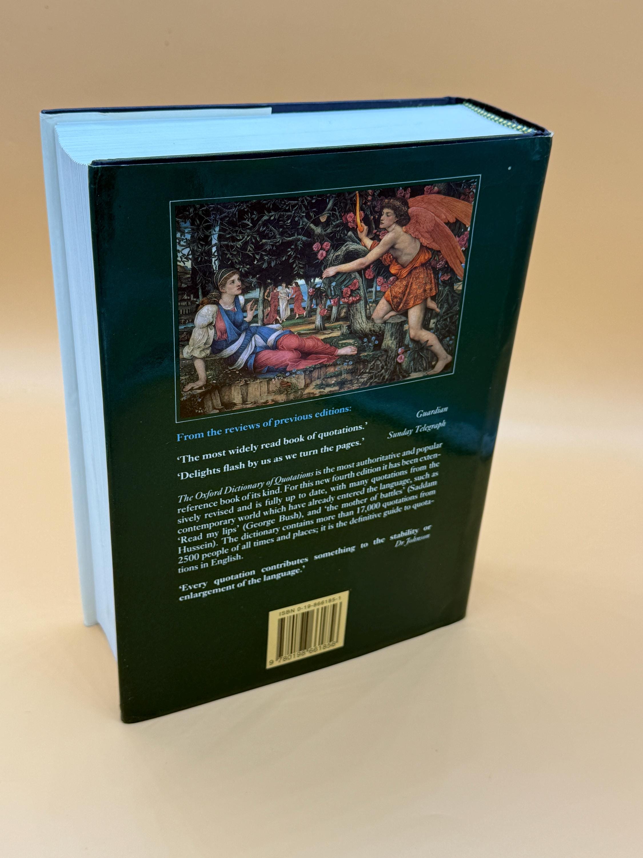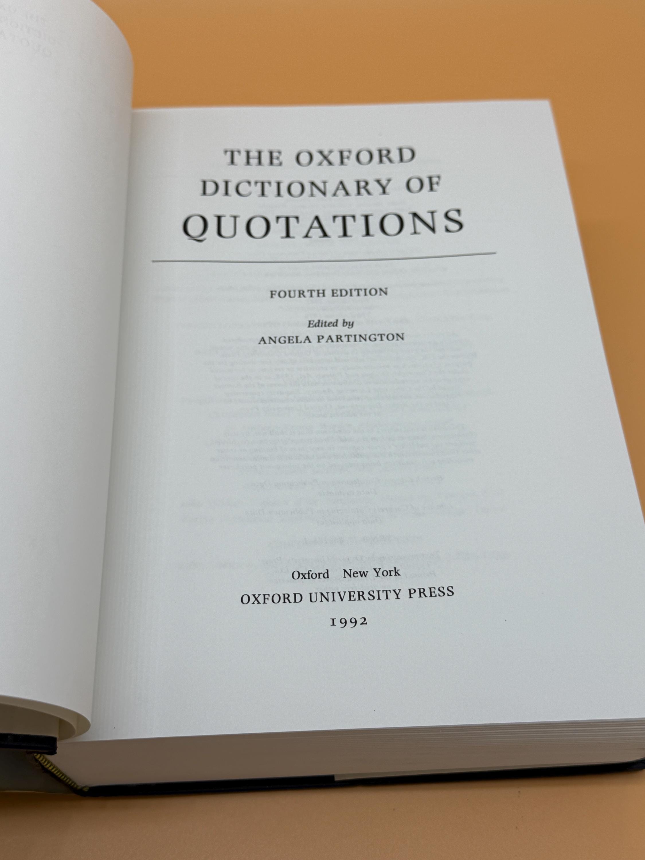 This is the 1992 New Edition of The Oxford Dictionary of Quotations, Fourth Edition, which has been edited by Angela Partington. The edition contains over 17,000 quotations from 2500 people of all times and places. The first edition was originally published in 1941. Each edition contains update and new information. It has a useful key work index and expanded information on authors and particular quotations.