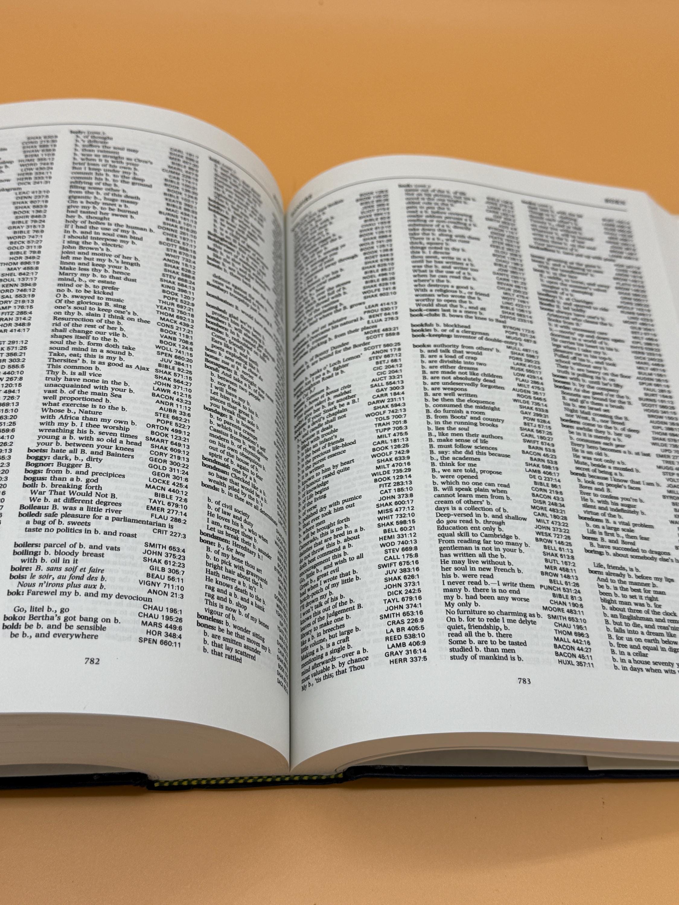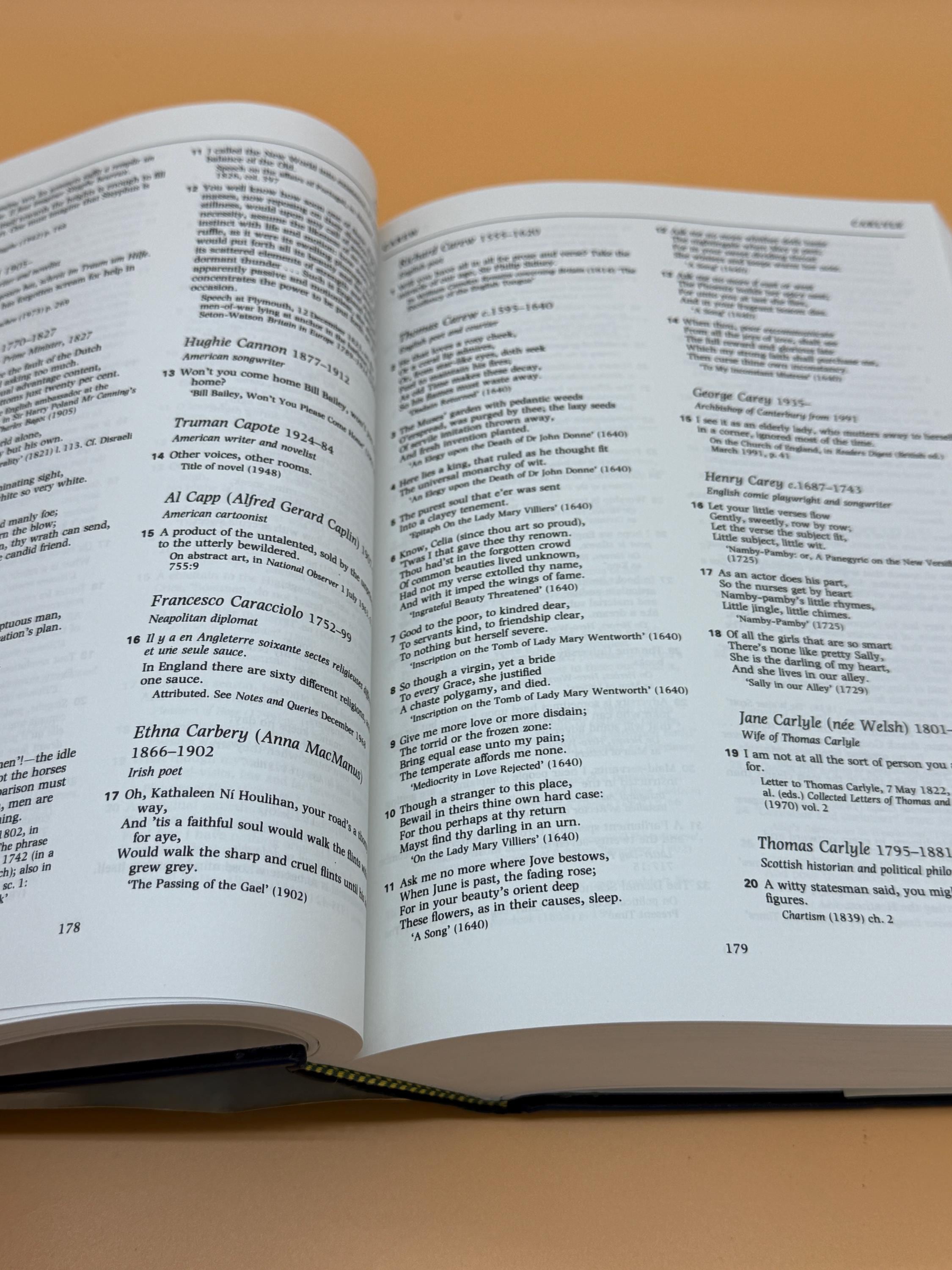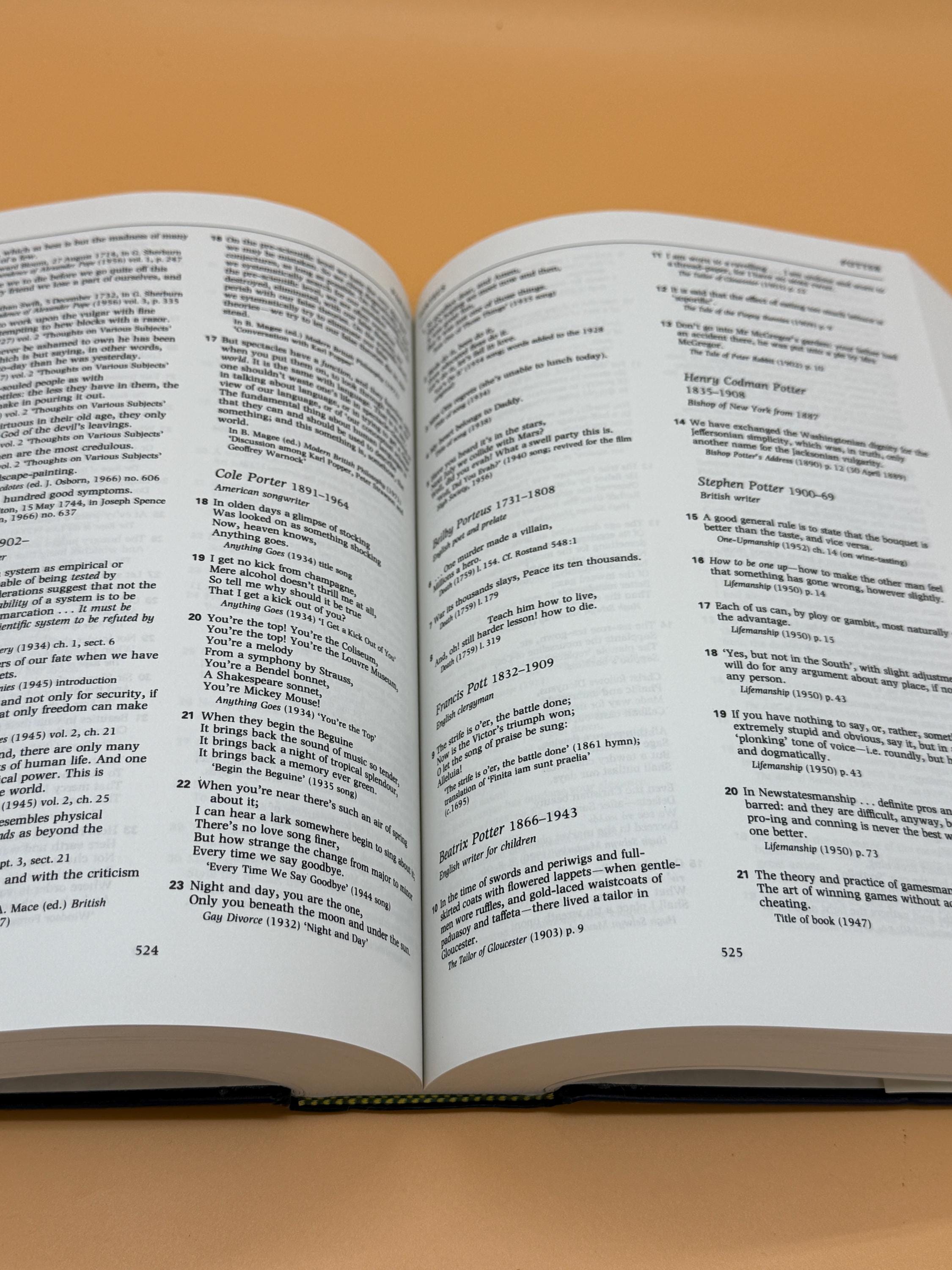 This is the 1992 New Edition of The Oxford Dictionary of Quotations, Fourth Edition, which has been edited by Angela Partington. The edition contains over 17,000 quotations from 2500 people of all times and places. The first edition was originally published in 1941. Each edition contains update and new information. It has a useful key work index and expanded information on authors and particular quotations.