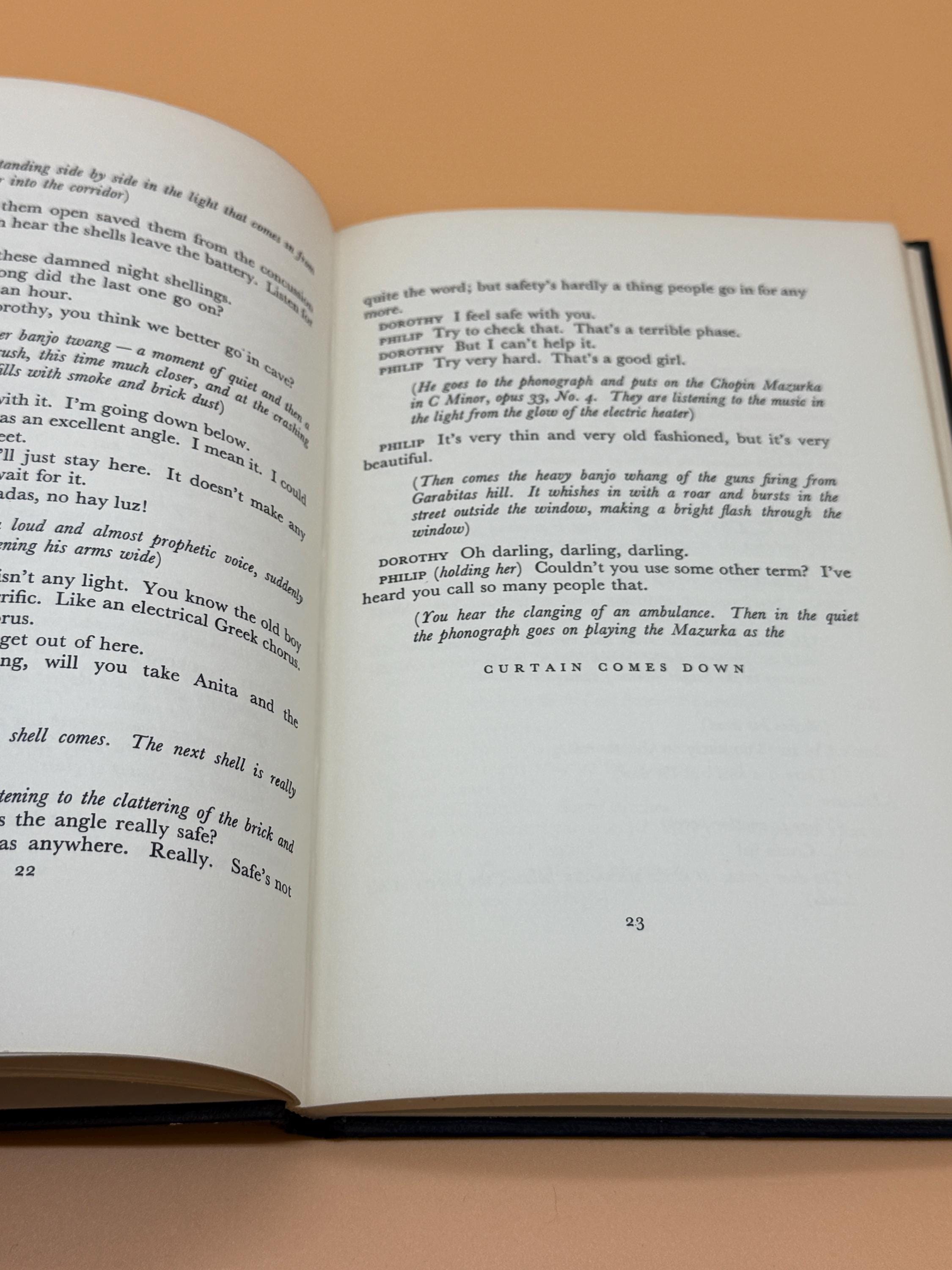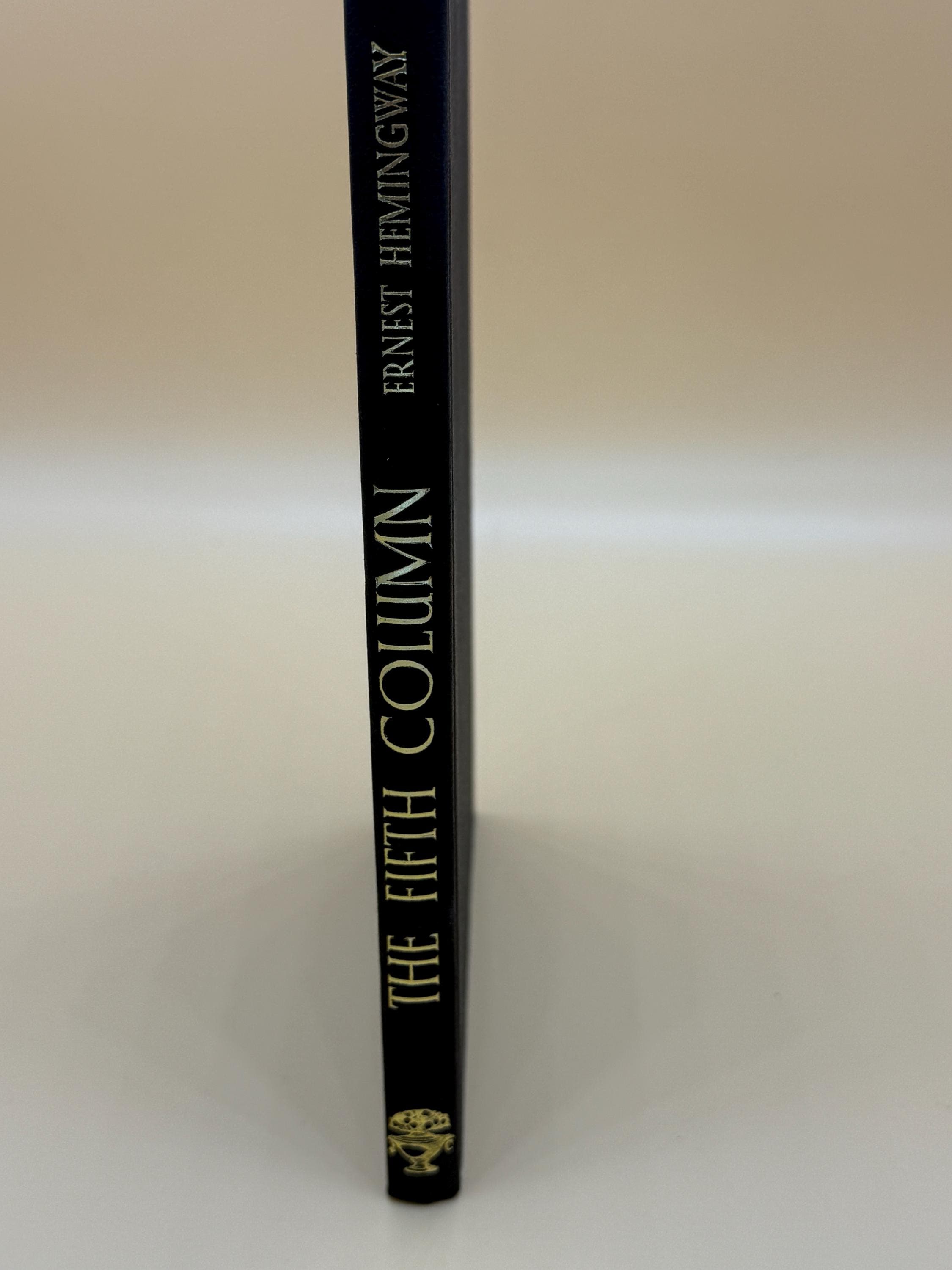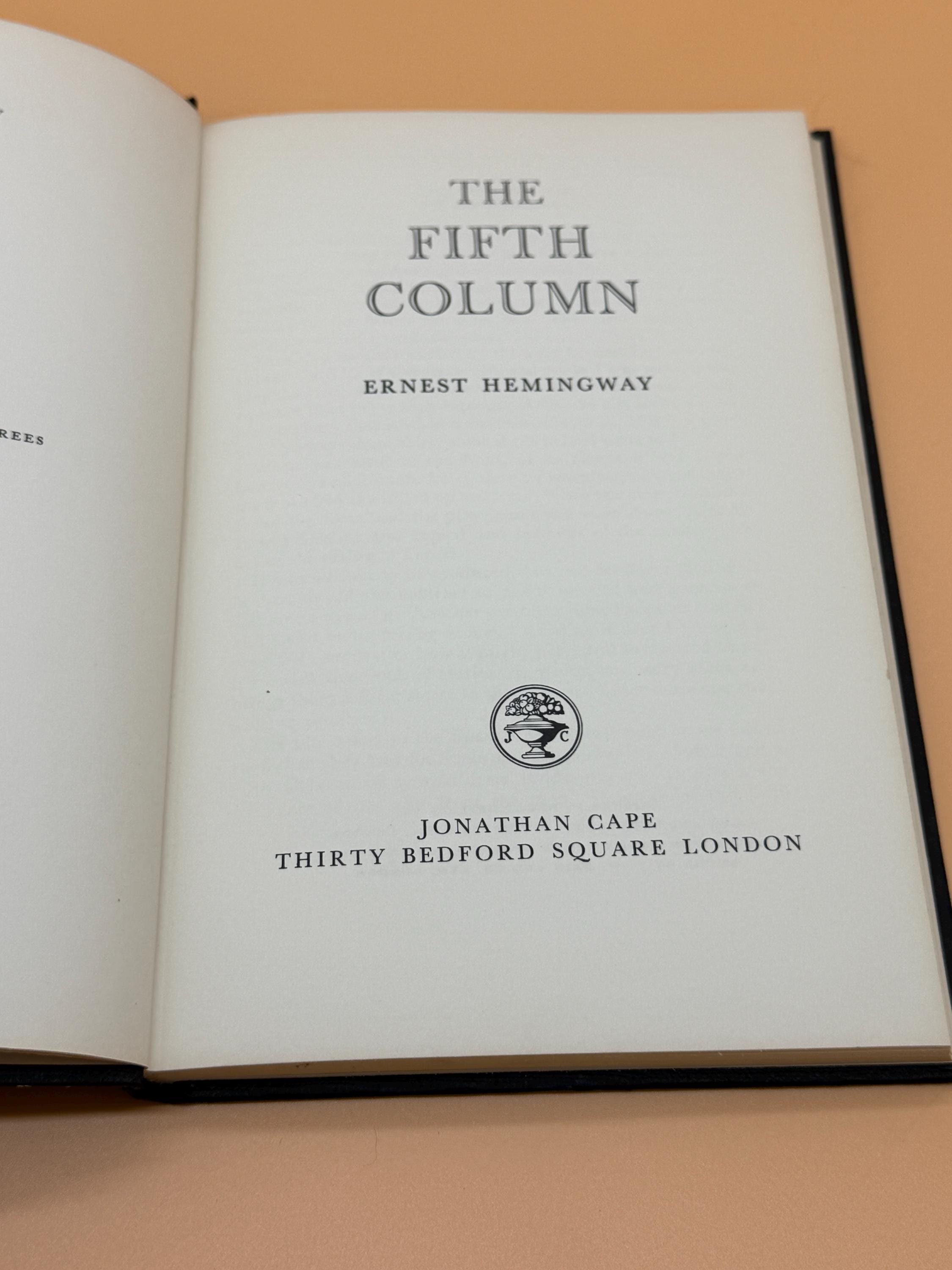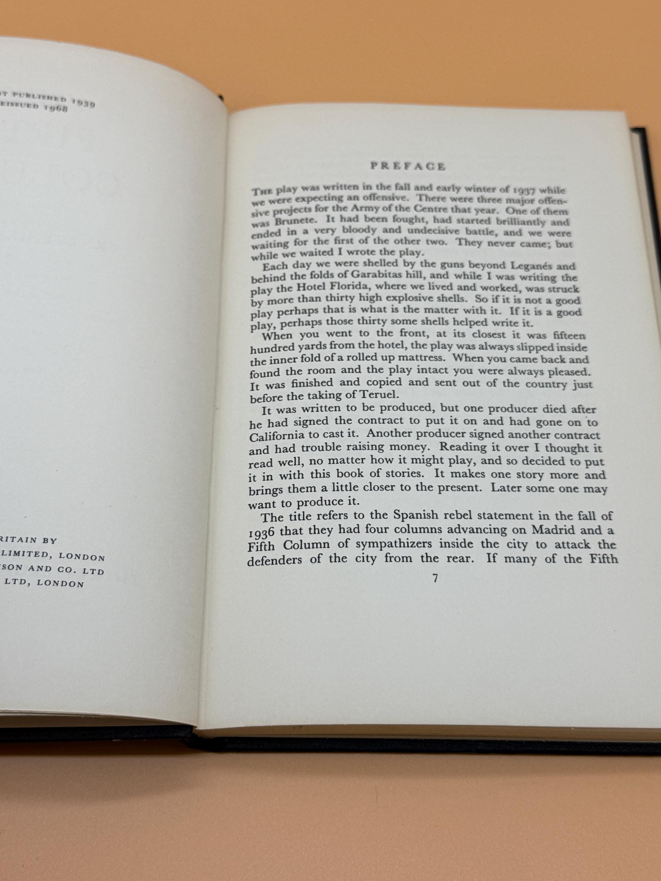 The Fifth Column by Ernest Hemingway is his only full length play. The play was written in the fall and early winter of 1937. The title refers to the Spanish rebel statement in the fall of 1936 that they had four column advancing on Madrid and a Fifth Column of sympathizers inside the city to attack from the rear. The play was written during wartime and is about counter espionage in Madrid. The book was originally published by Scribners in the U.S. in 1938 and then in London in 1939. This is the London 1968 reissue edition. NOTE: this is the play, The Fifth Column only and does not include "49 Stories" as later reprints did.