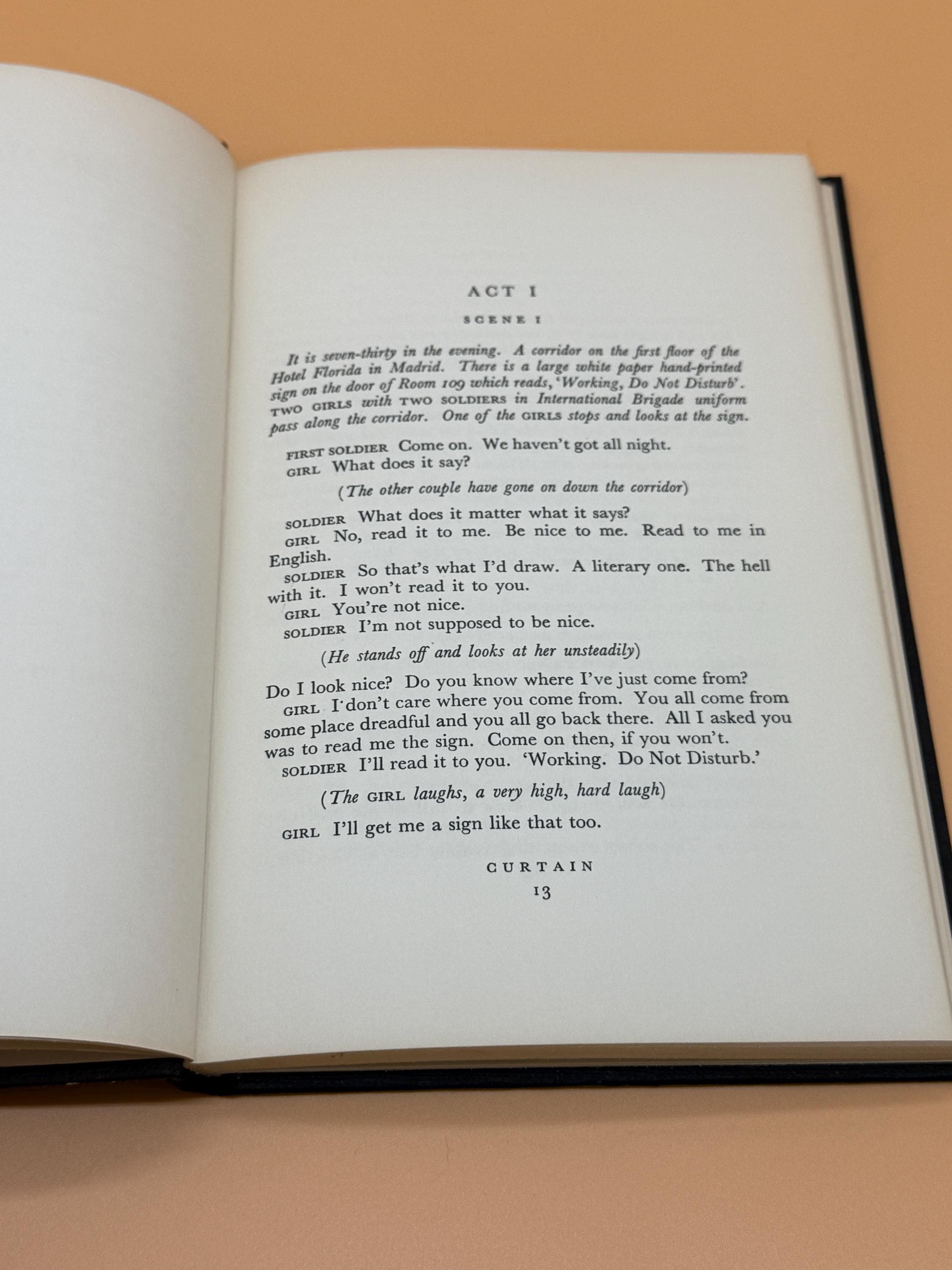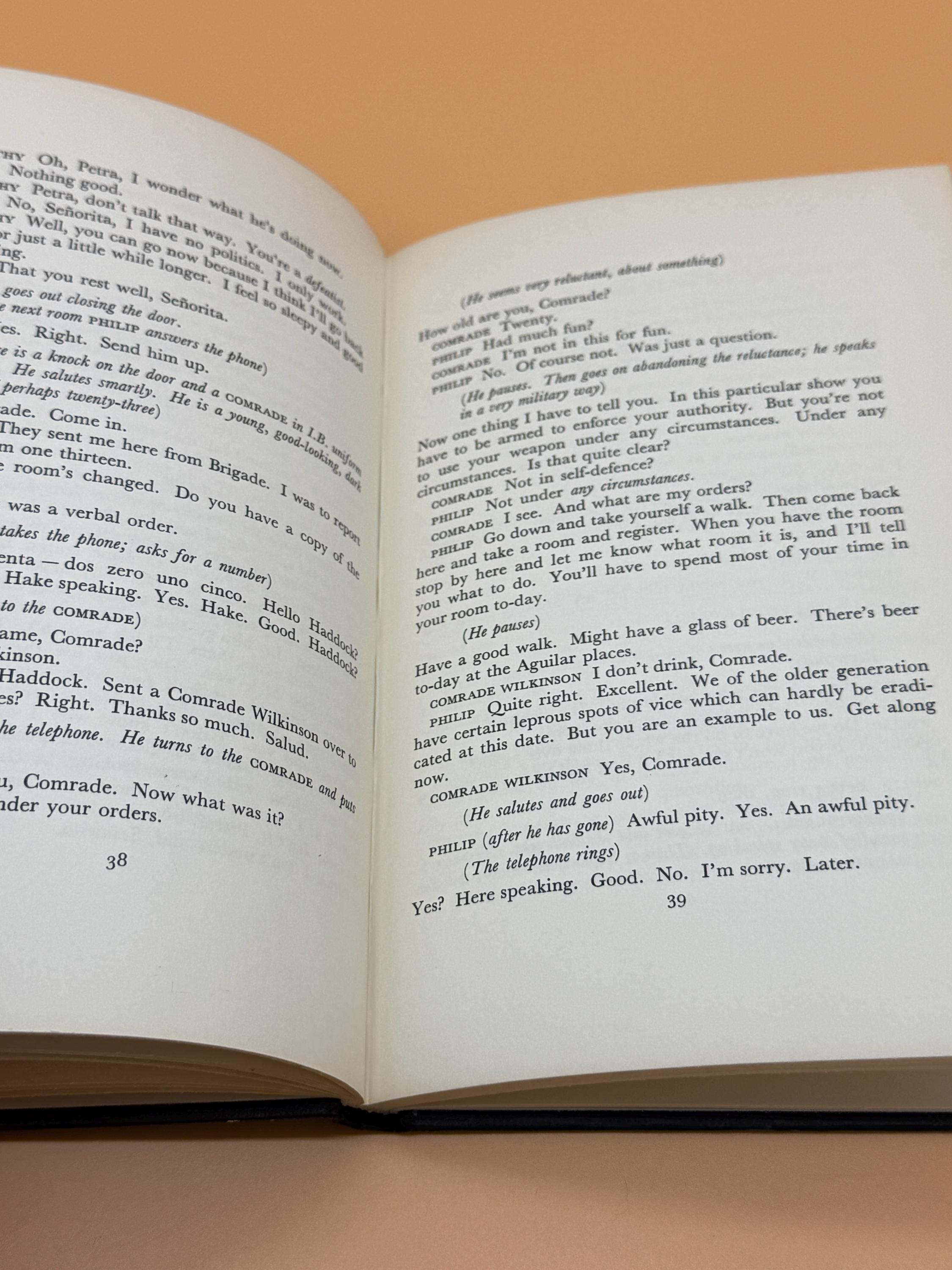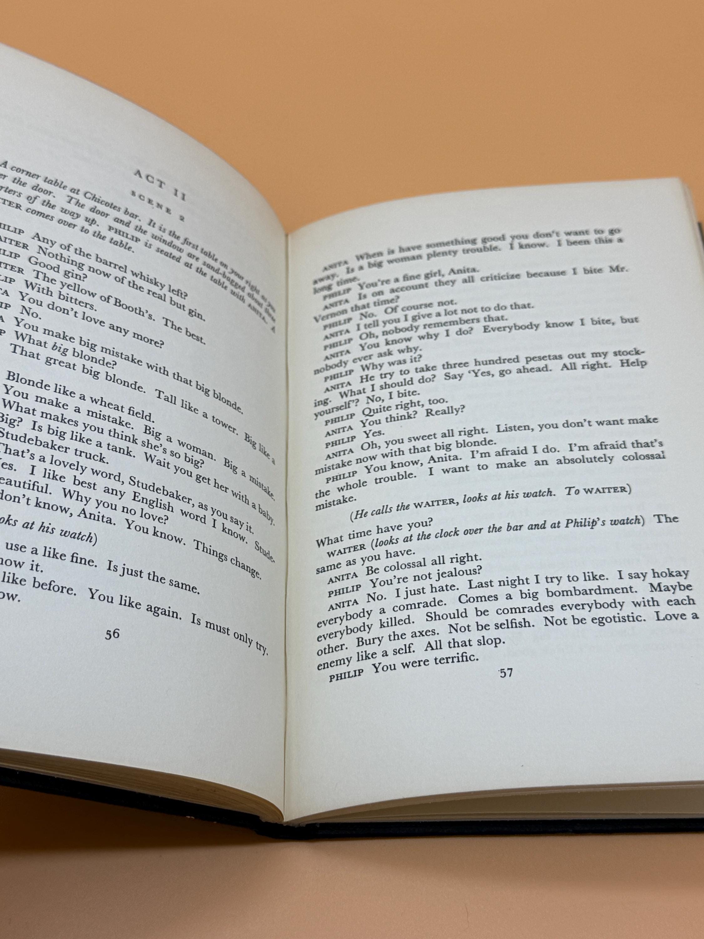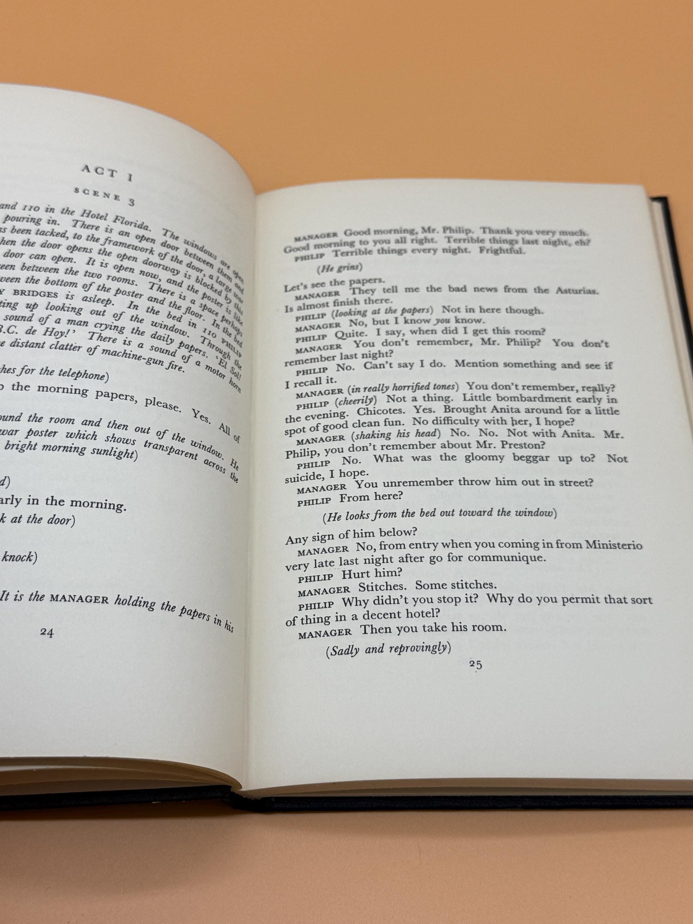 The Fifth Column by Ernest Hemingway is his only full length play. The play was written in the fall and early winter of 1937. The title refers to the Spanish rebel statement in the fall of 1936 that they had four column advancing on Madrid and a Fifth Column of sympathizers inside the city to attack from the rear. The play was written during wartime and is about counter espionage in Madrid. The book was originally published by Scribners in the U.S. in 1938 and then in London in 1939. This is the London 1968 reissue edition. NOTE: this is the play, The Fifth Column only and does not include "49 Stories" as later reprints did.