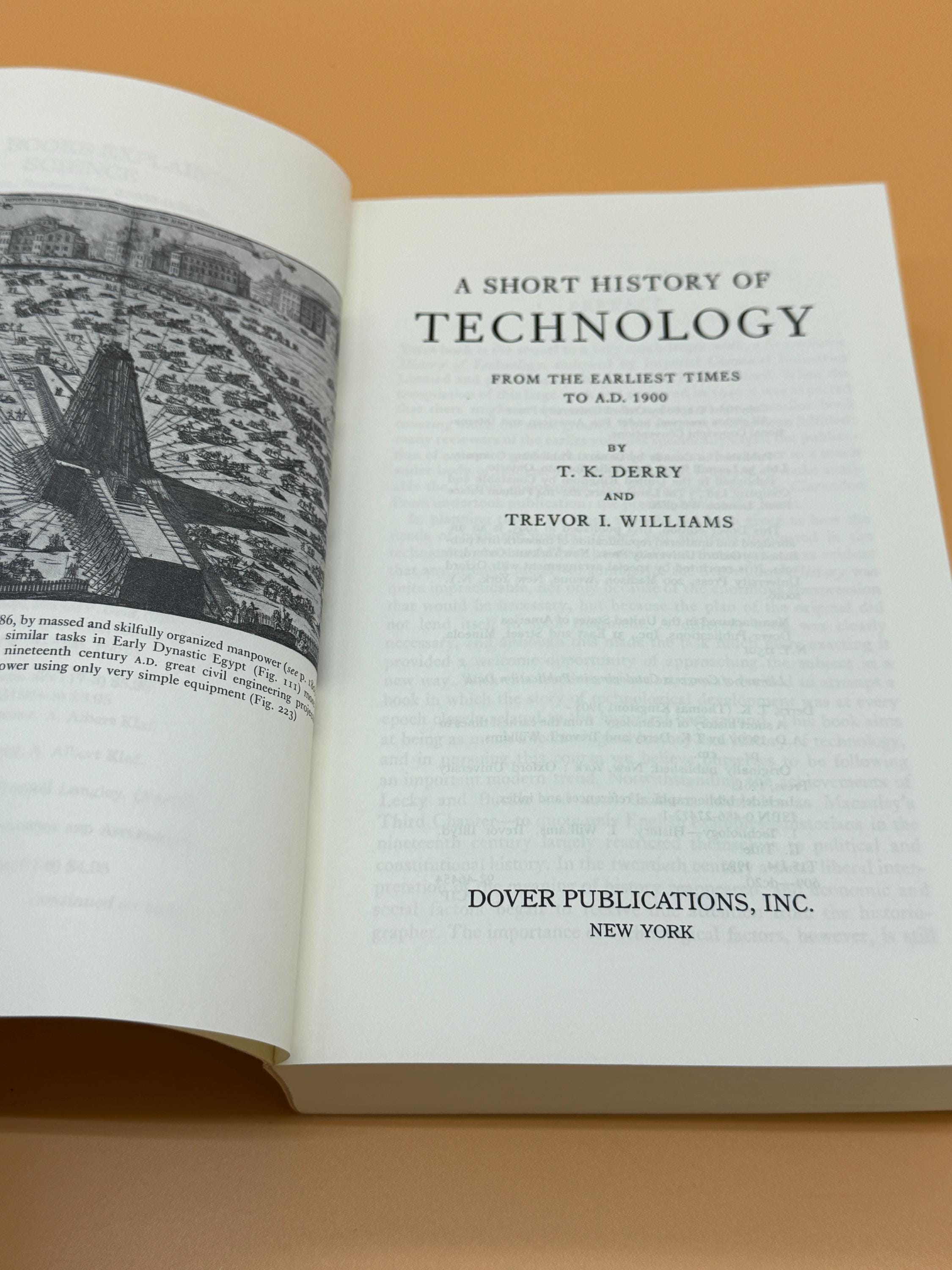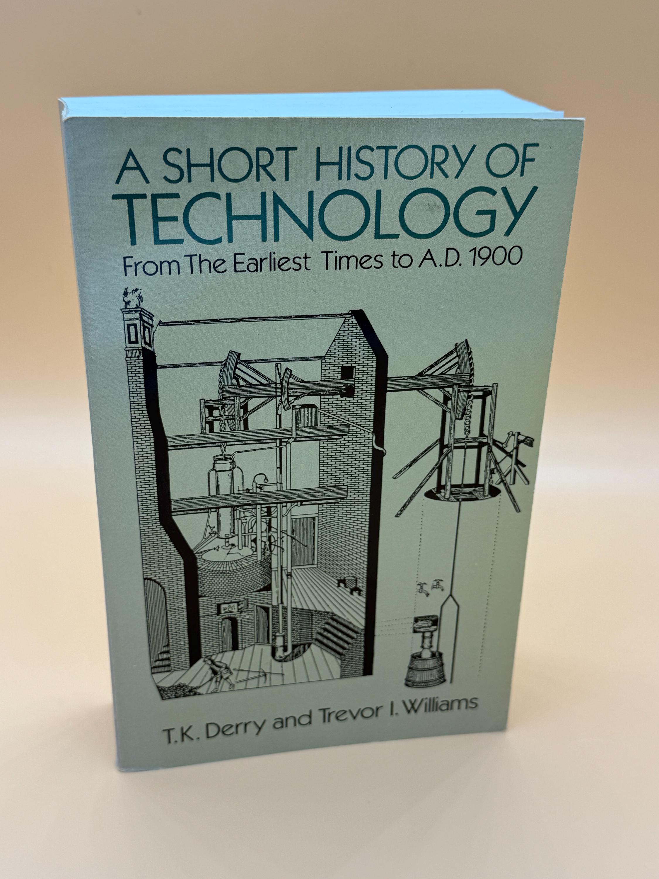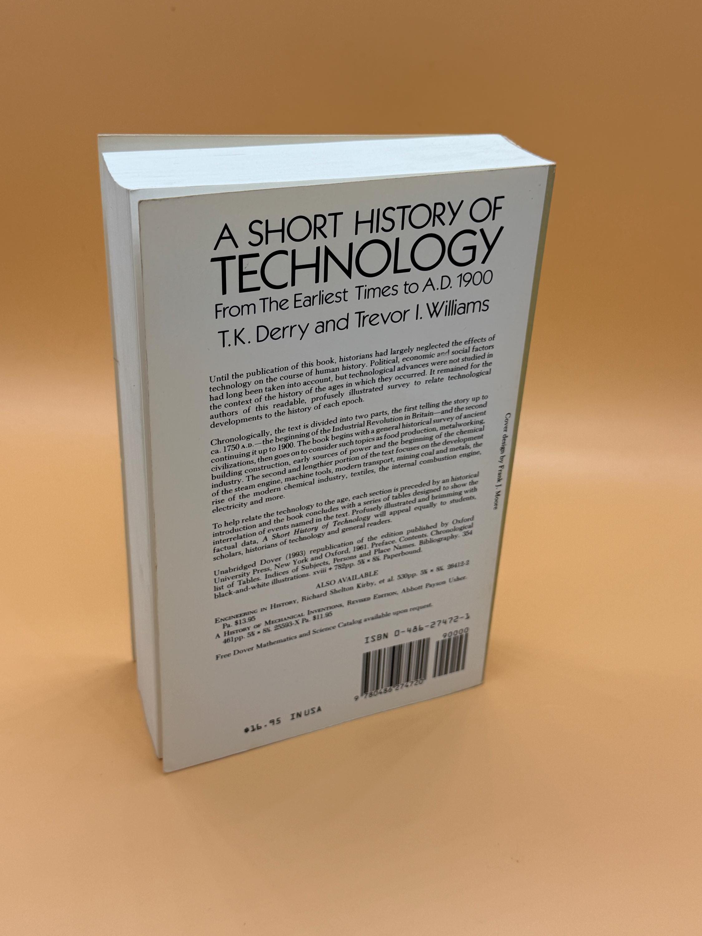 Originally published by Oxford University Press in 1960, this edition of A Short History of Technology From the Earliest Times to A.D. 1900 by T.K. Derry and Trevor l. Williams is the Dover Publishing reprint, 1993. Until the publication of the book, historians had largely ignored the impact of technology on the course of human history. Political, social, and economic factors had long been taken into account. Then, this edition presented technological developments to the history of each epoch. The book is extensively illustrated to demonstrate history. The text is chronological, first telling the story up to 1750 A.D. - the beginning of the Industrial Revolution in Britain - and the second continues up to 1900.