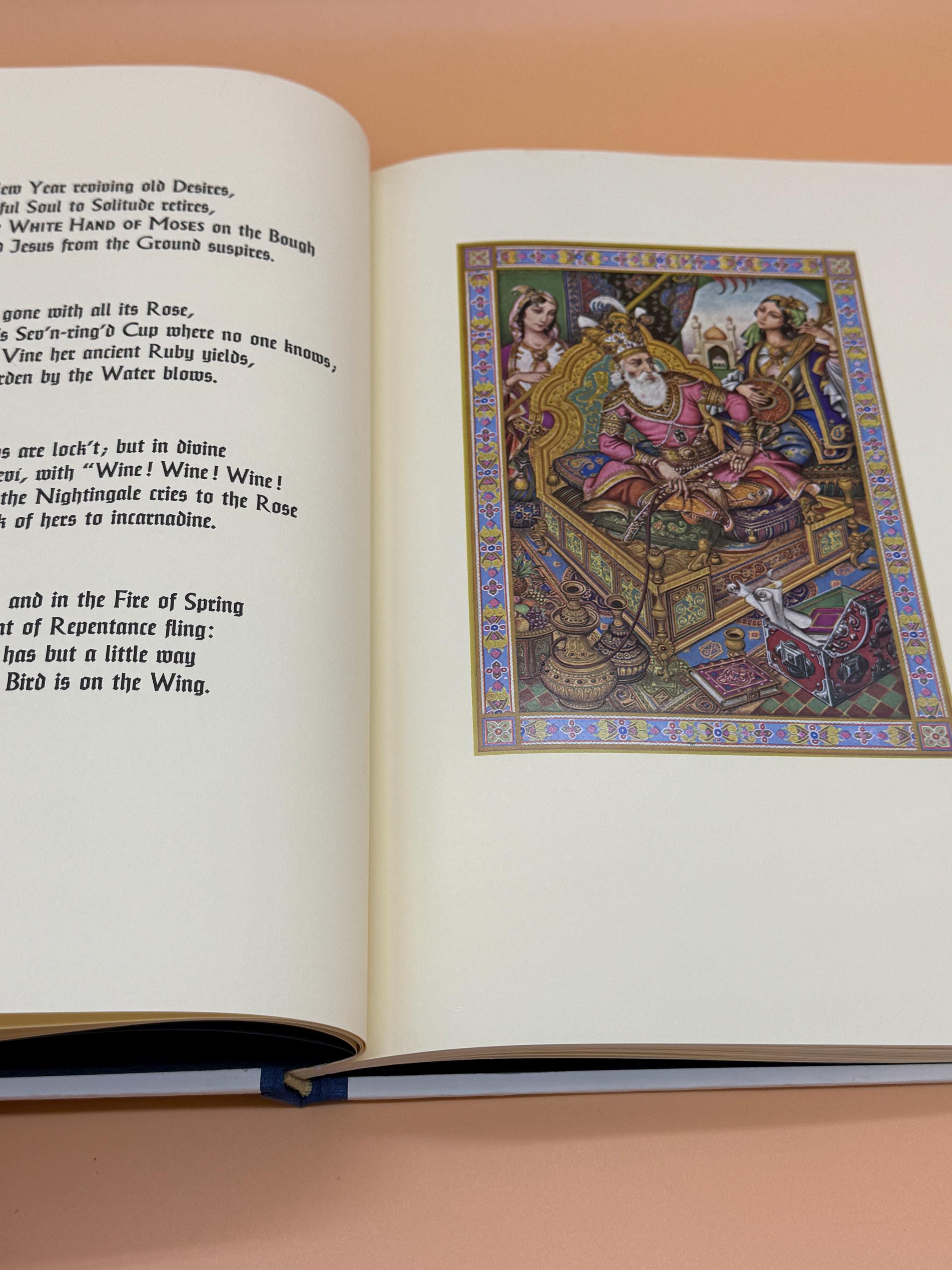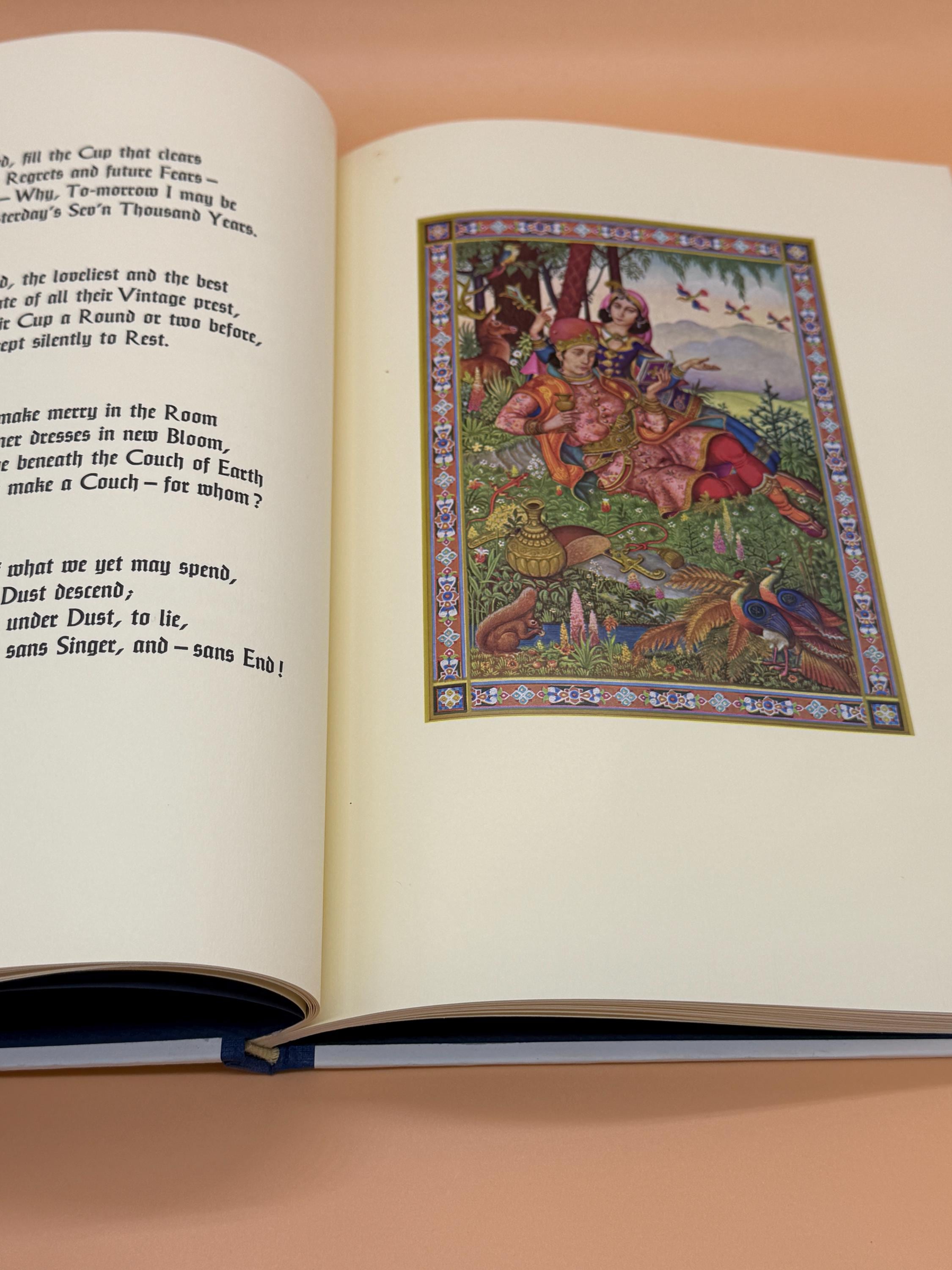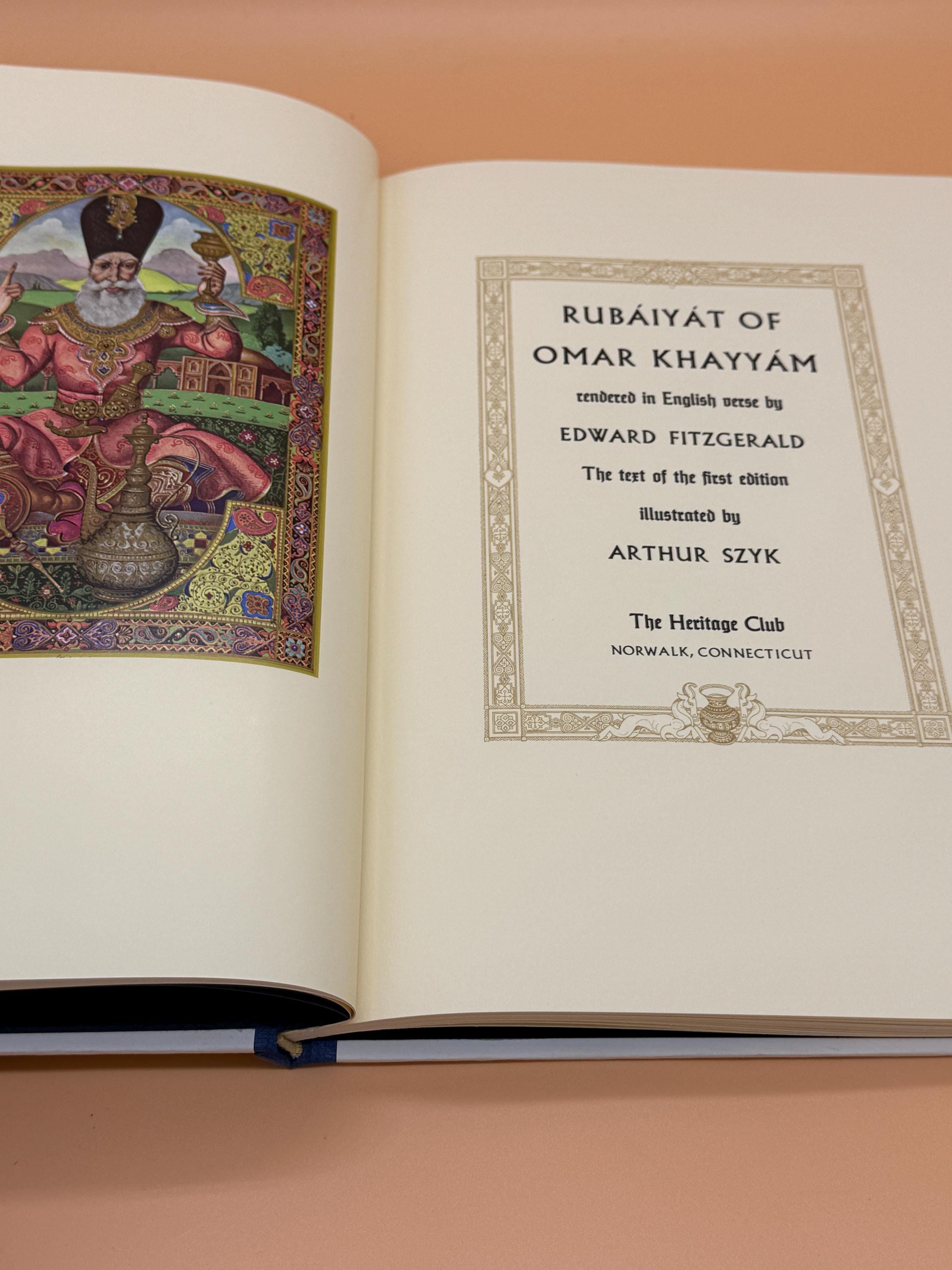 This edition from The Heritage Club is the translated text by Edward Fitzgerald from Persian to English . It is a selection of quatrains attributed to Omar Khayyam, the Astronomer-Poet of Persia. The beautiful illustrations throughout are by Arthur Szyk. This is a fine edition for any student of Persian history and poetry, although much speculation as to wether the poems can actually be attributed to Khayyam remains as he was a known astronomer and mathematician, not a poet.