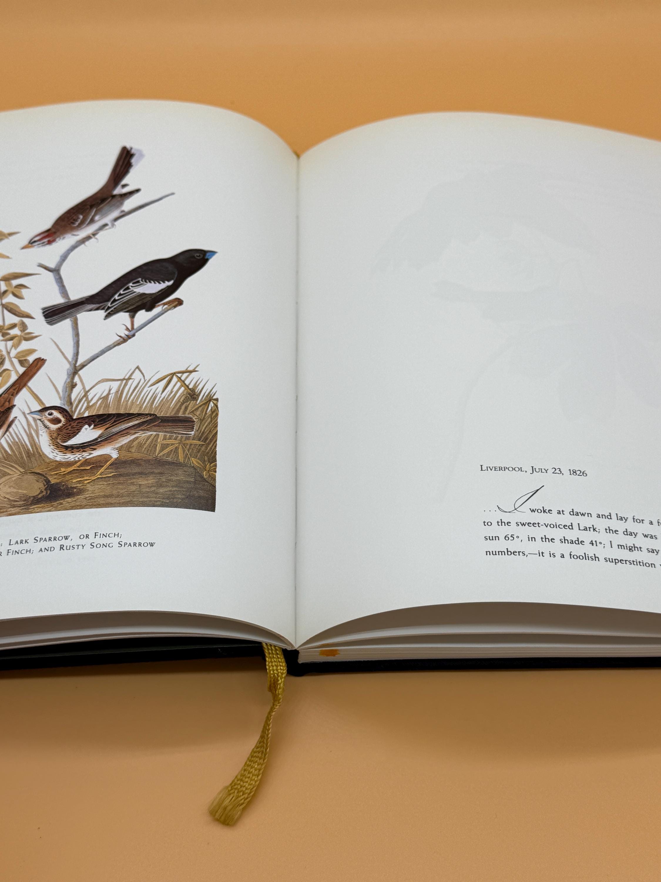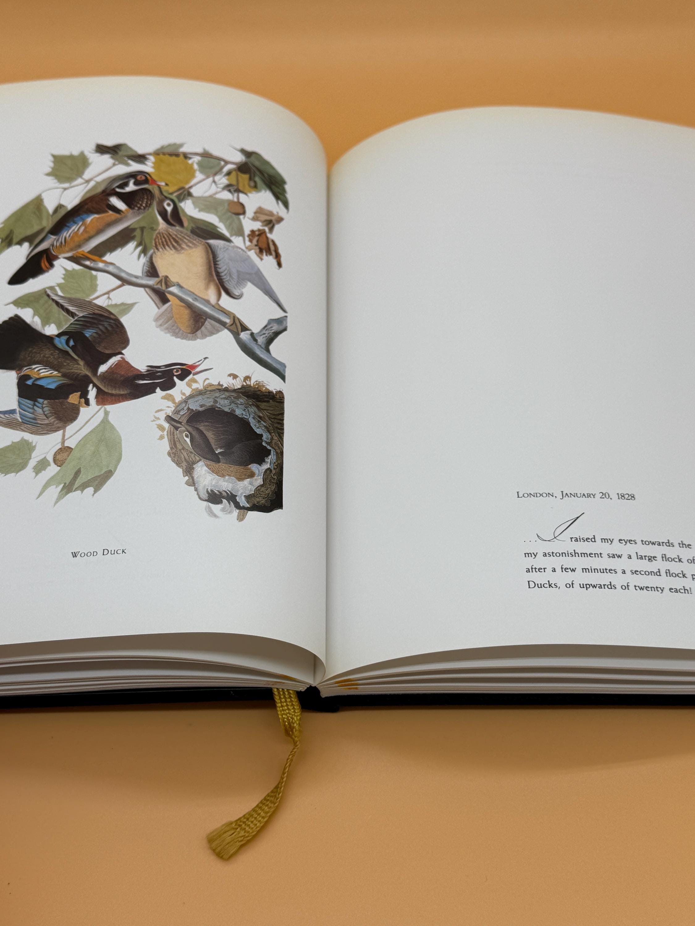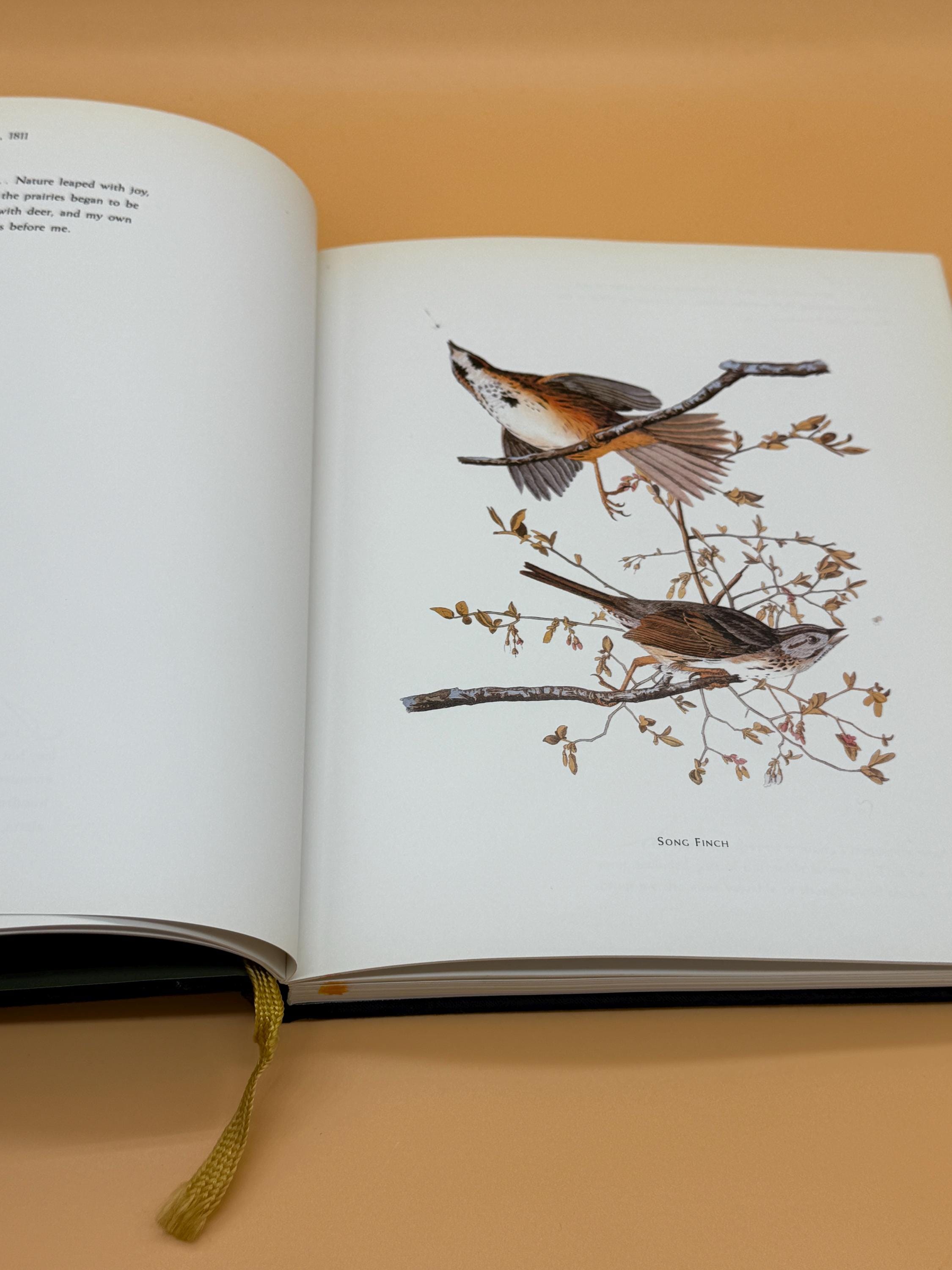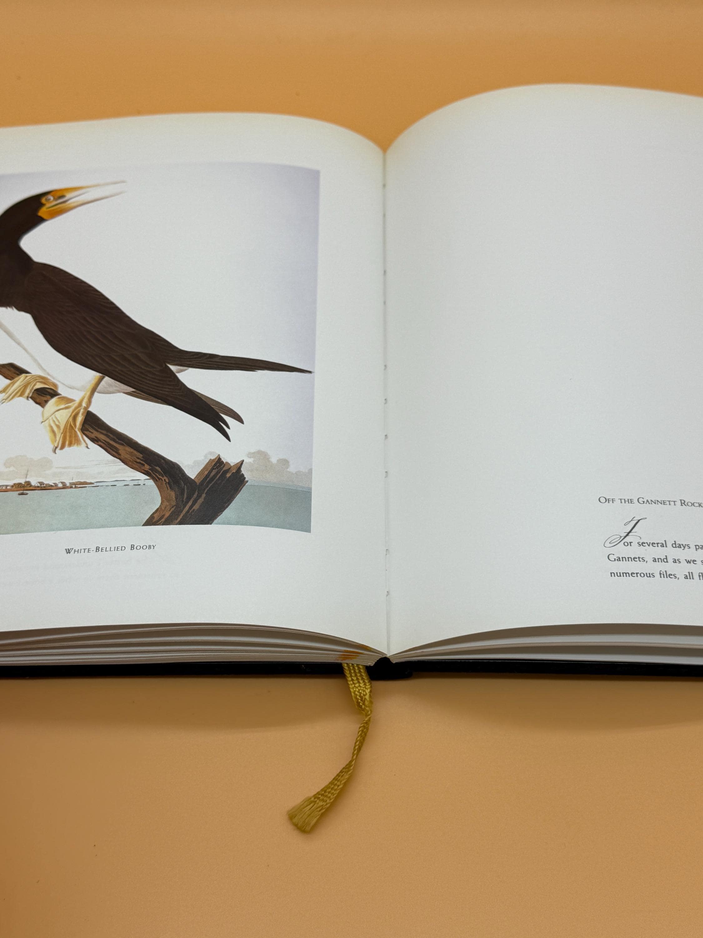 Inside readers will find classic beautiful Audubon illustrations with accompanying small notes. Each note is dated with the place and date of the notation with an accompanying illustration. A few pages include a note with no specific illustration. Example of the illustration and note is; "Florida Keys, Late April, 1832 As we were proceeding towards some Keys seldom visited by men, the sun rose from the bosom of the waters with a burst of glory... " and the accompanying illustration is of the black throated Mango Hummingbird.