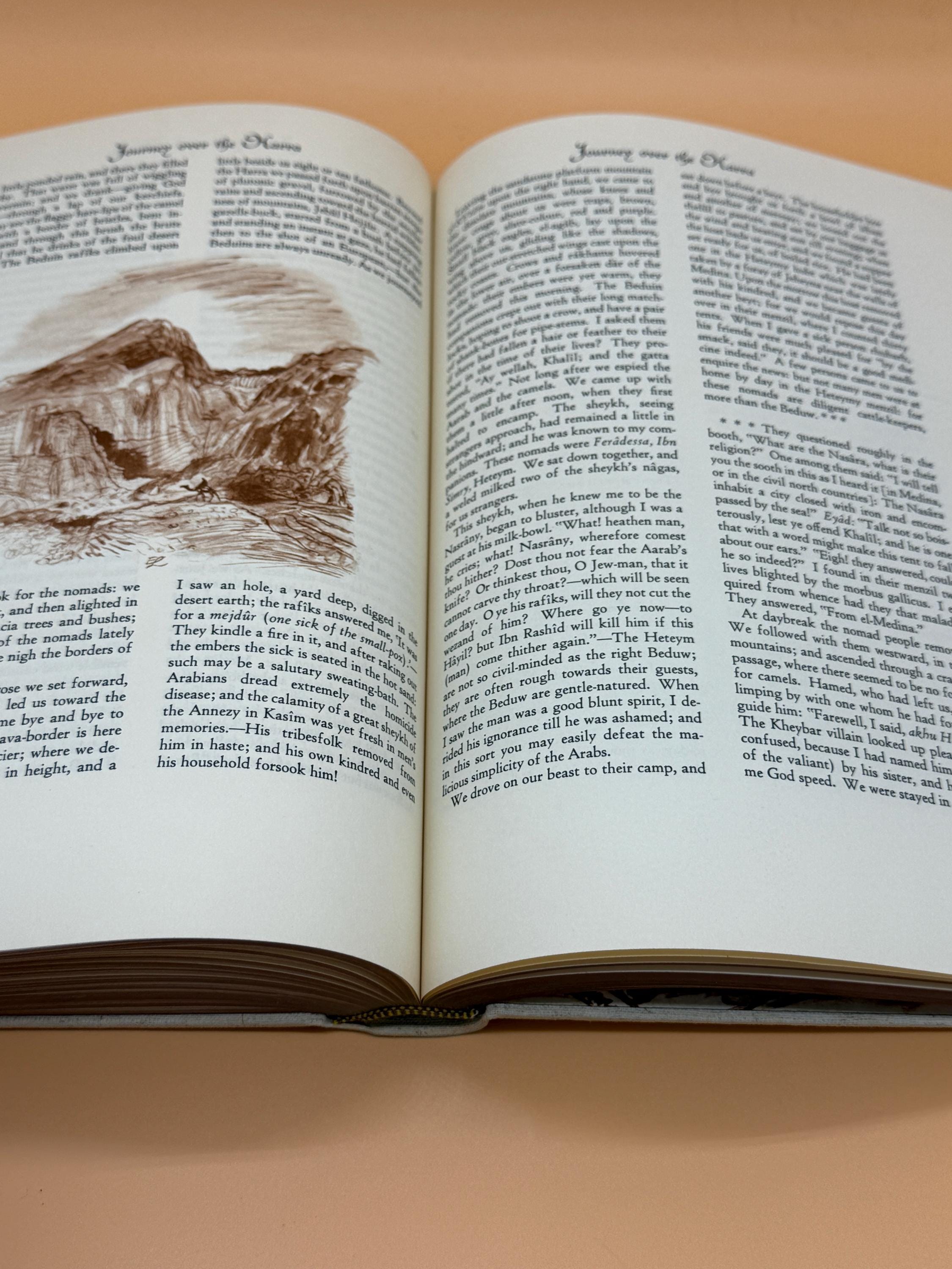This is a very good larger hardcover with accompanying slipcase. 1953 Heritage Press Edition. This copy is still crisp and clean inside. The pages are clean and crisp. The binding is tight and straight. Bound in tan linen cloth, the hardcover boards feature illustrated and designed front. The hardcover boards are very good with light shelf wear. The accompanying slipcase is good, showing some wear but solid. Super octavo book size or 7" x 11" with 453 pages including glossary.
