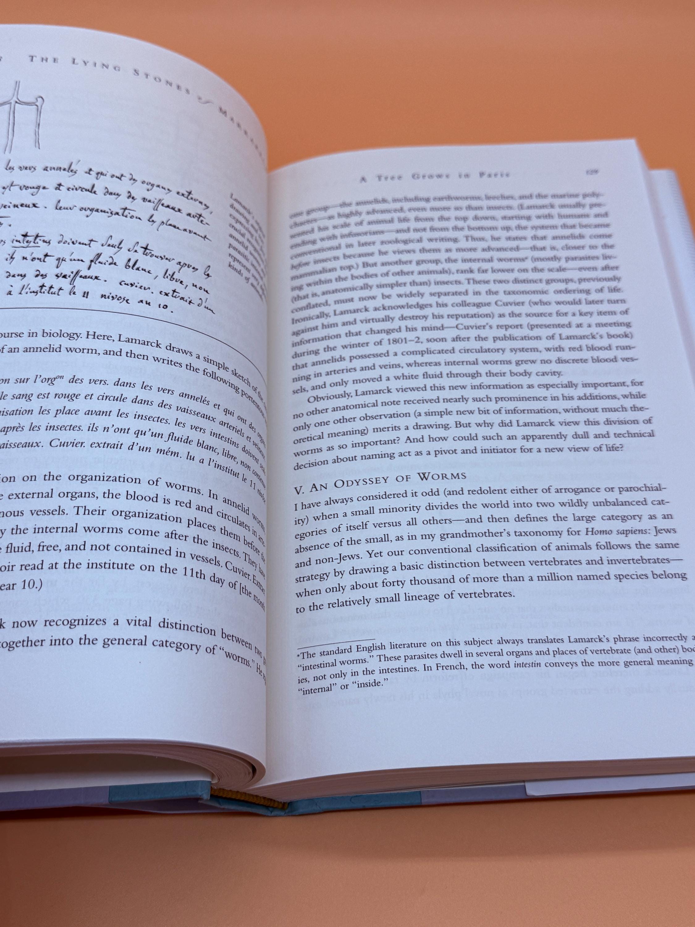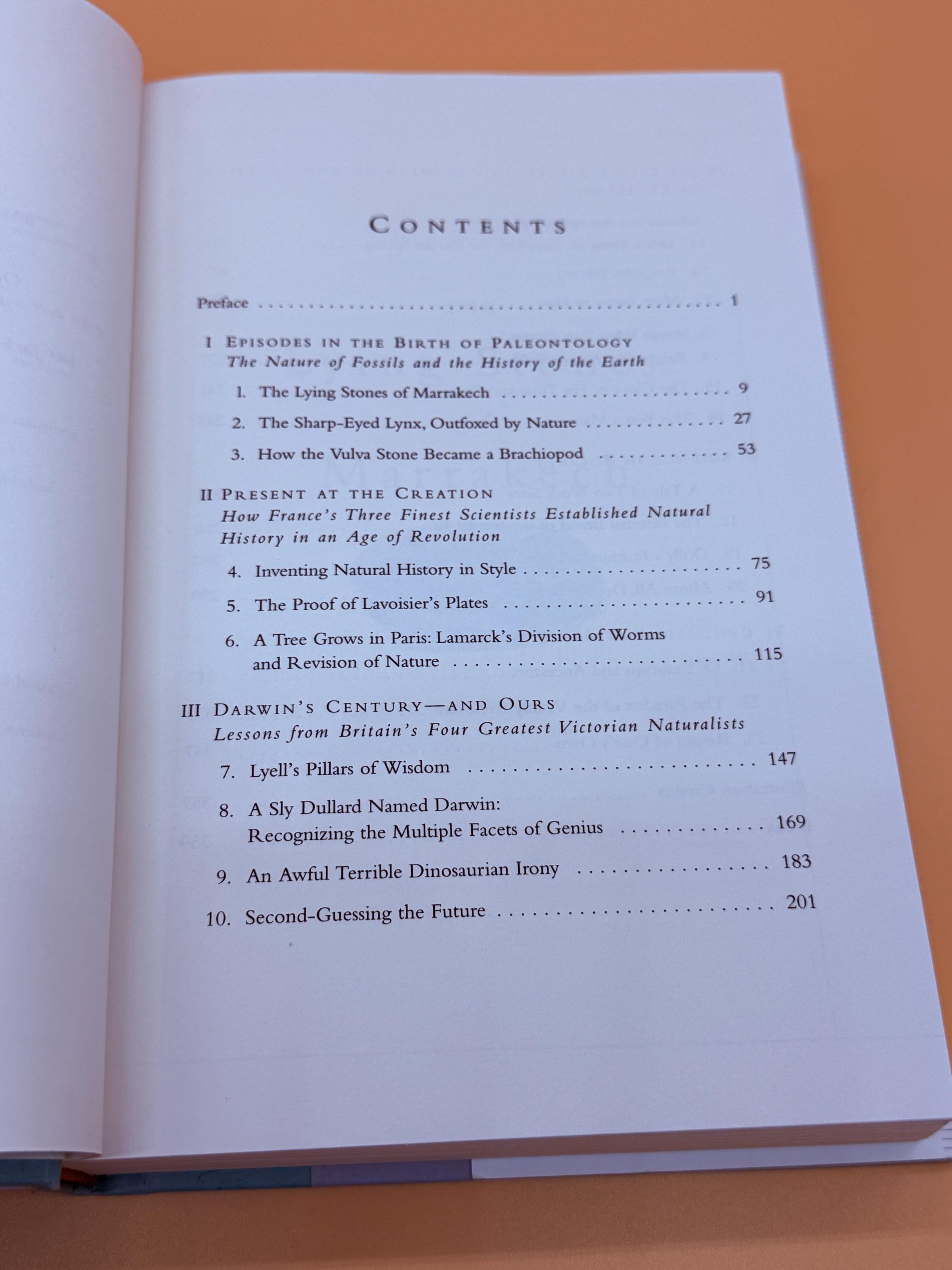 The Living Stones of Marrakech by Stephen Jay Gould is subtitled Penultimate Reflections in Natural History. This book is Gould's ninth collection of essays offering a perspective on natural history. The book is divided into six parts. Part One is Episodes in the Birth of Paleontology, Part Two is Present at the Creation, Part Three is Darwin's Century, Part Four is Six Little Pieces on the Meaning and Location of Excellence, Part Five is Science in Society, and Part Six is Evolution at All Scales.