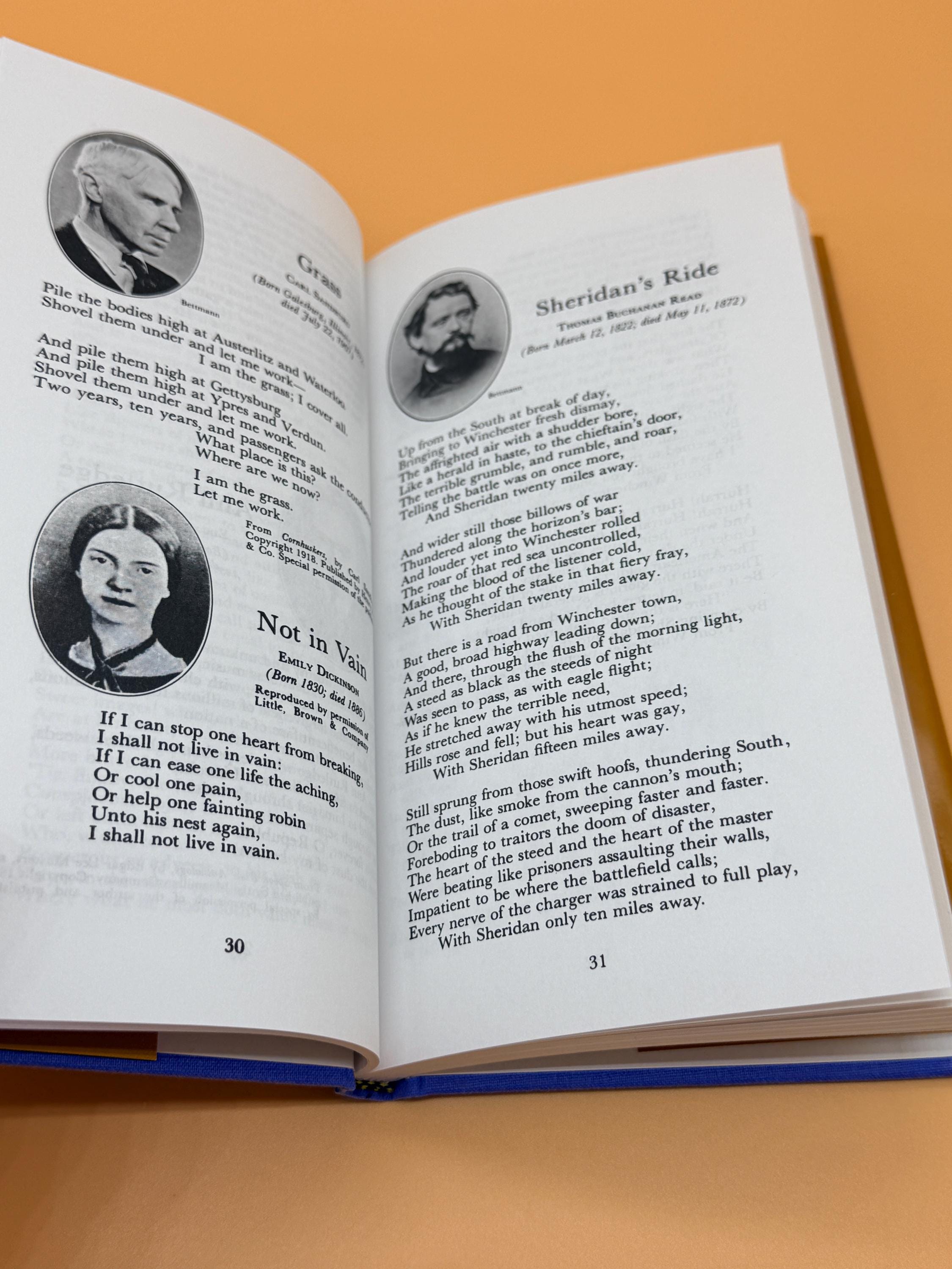 One Hundred and One Famous Poems is an anthology of some of the most famous poetry by some of the most famous poets. From Longfellow to Burroughs, Burns to Frost, Edgar Guest to Oliver Wendall Holmes, Shakespeare, Milton, Poe, Tennyson and more can be found in the pages. Accompanying the poems are many illustrations of the authors in black and white line drawings. Included is a prose section comprised of The Declaration of Independence, The Gettysburg Address, Letter to Mrs. Bigby (Abraham Lincoln), The Magna Carta, The Ten Commandments, and War Inevitable - Patrick Henry.