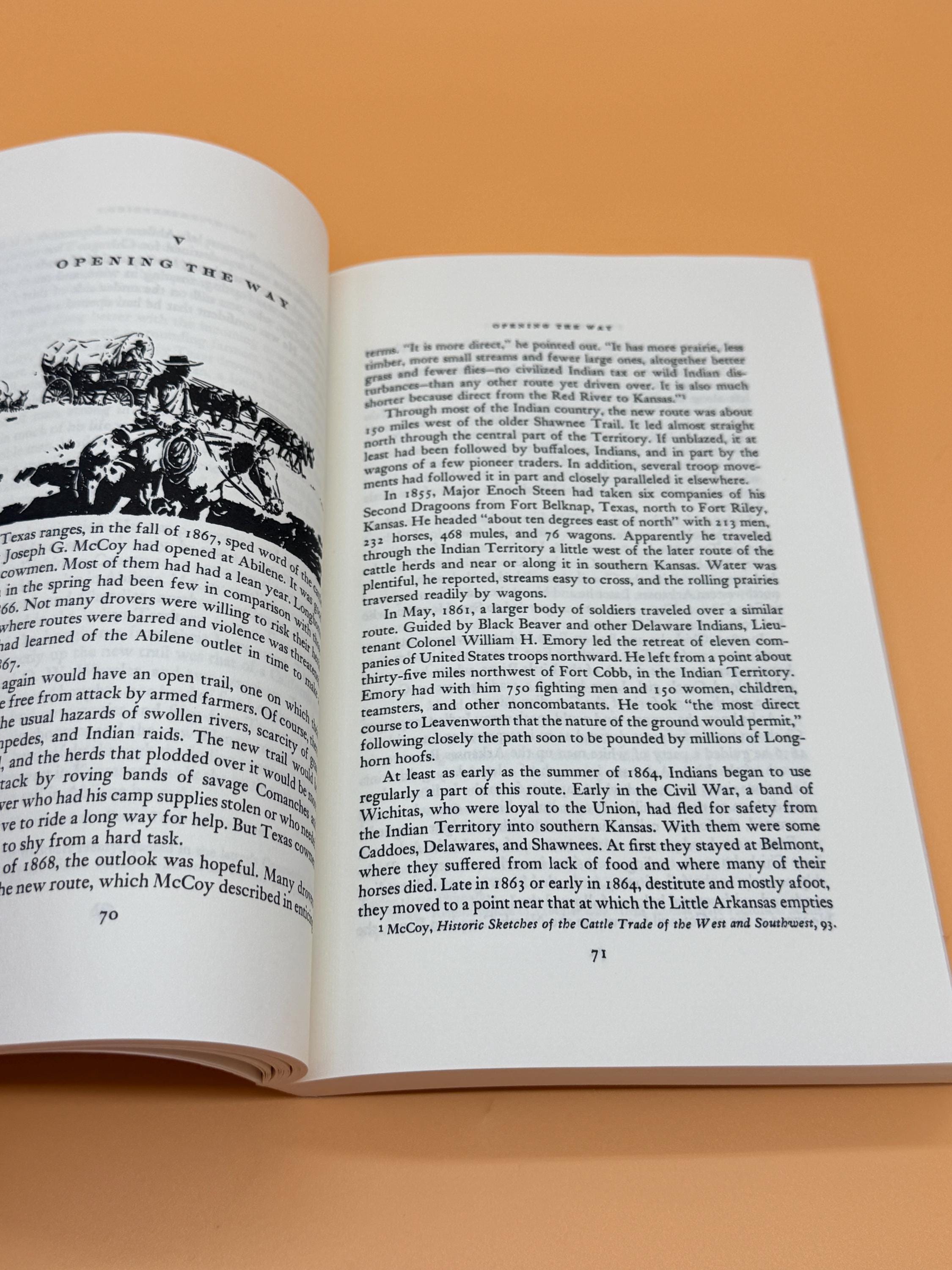 The Chisholm Trail by Wayne Gard is a detailed history based in interviews with surviving trail drivers, communities along the way, archives and records . For more than a dozen years following 1867, The Chisholm Trail was the Texas cowhand's road to high adventure. It offered sudden stampedes, hazardous river crossings, and Indian marauders. At the end of the drive it promised celebrations in saloons, gambling parlors and dance halls. The book is illustrated with drawings by Nick Eggenhoffer along with vintage photos.