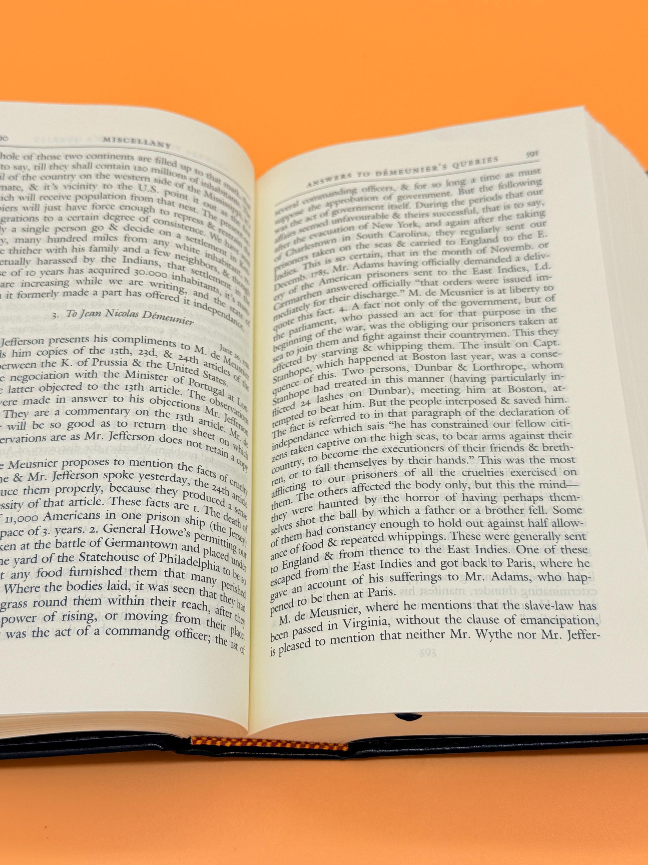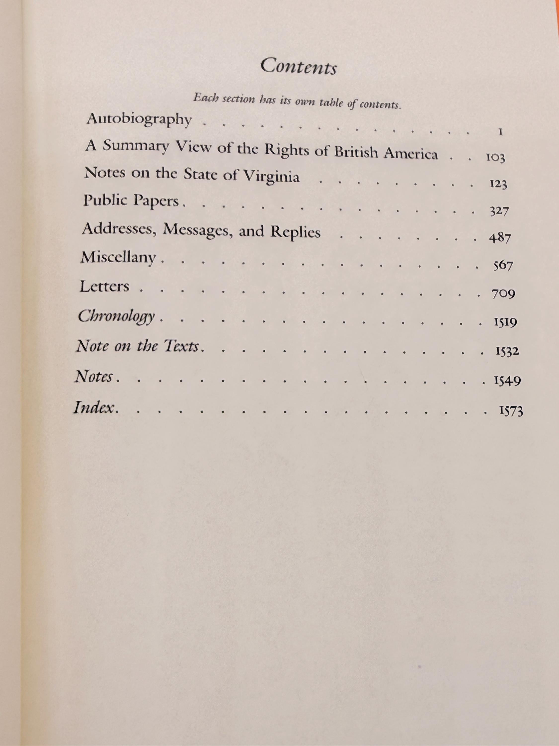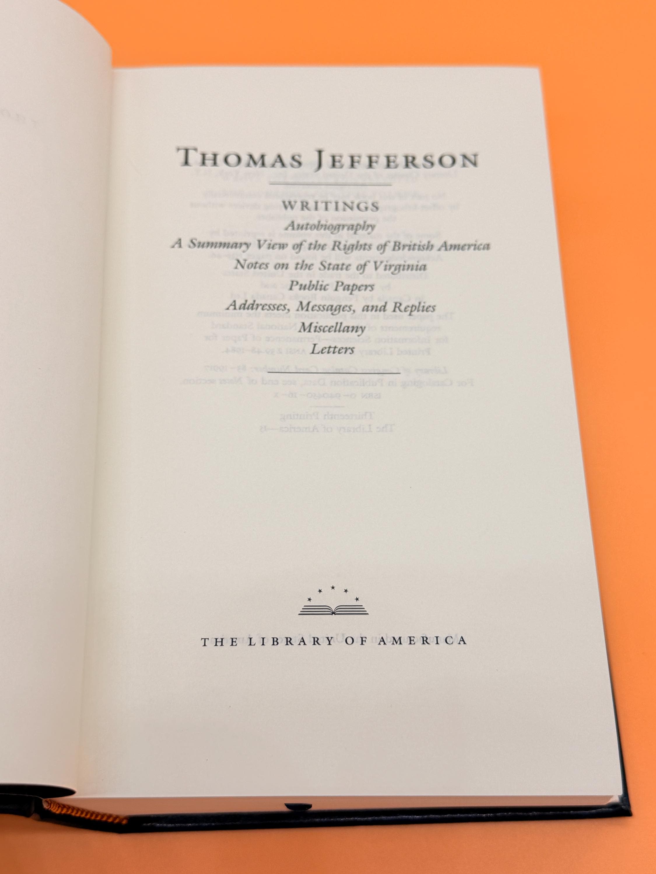 This is Thomas Jefferson Writings, Papers, Letters and more from The Library of America. Contents include; Autobiography, A Summary View of the Rights of British America, Notes on the State of Virginia, Public Papers, Addresses-Messages-and Replies, Miscellany and Letters.