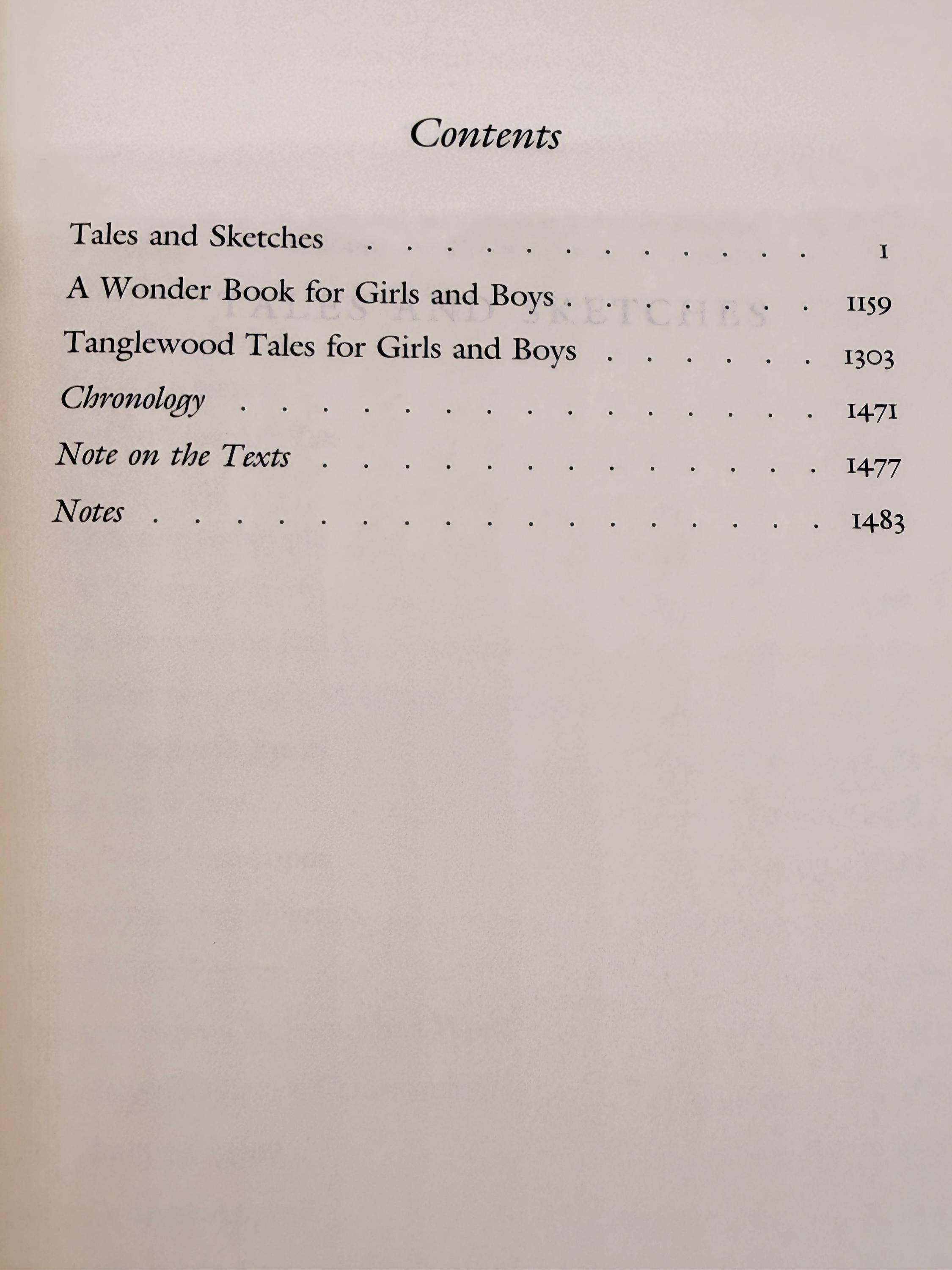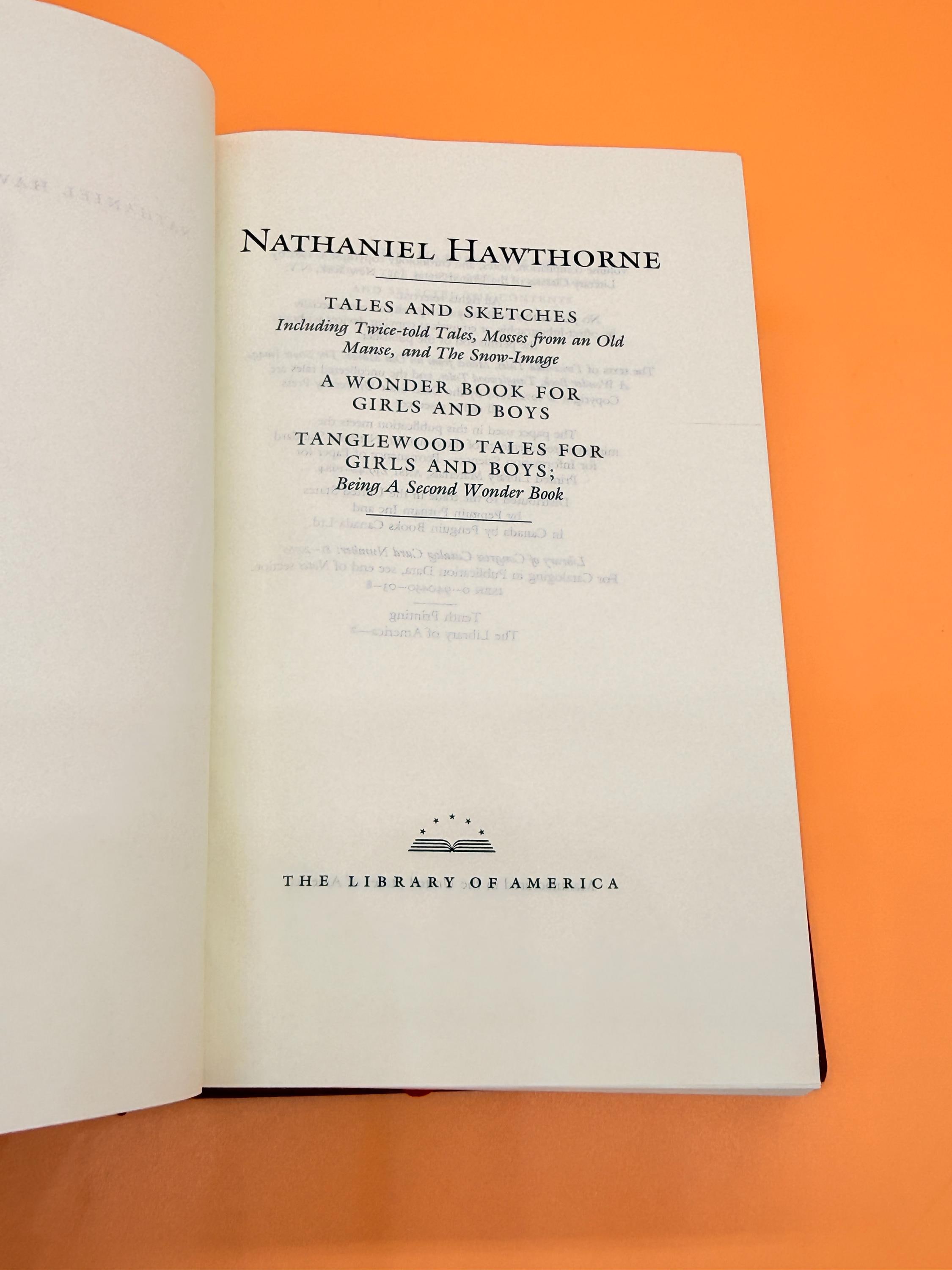 This is one of The Library of America's Literature series, Nathaniel Hawthorne Tales and Sketches. Contents include; Tales and Sketches including Twice-Told Tales - Mosses from an Old Manse - and The Snow Image, A Wonder Book for Boys and Girls, and Tanglewood Tales for Girls and Boys Being a Second Wonder Book.