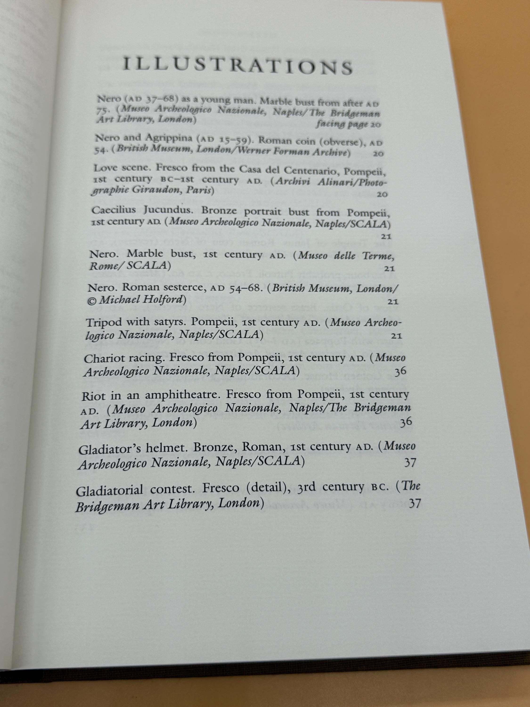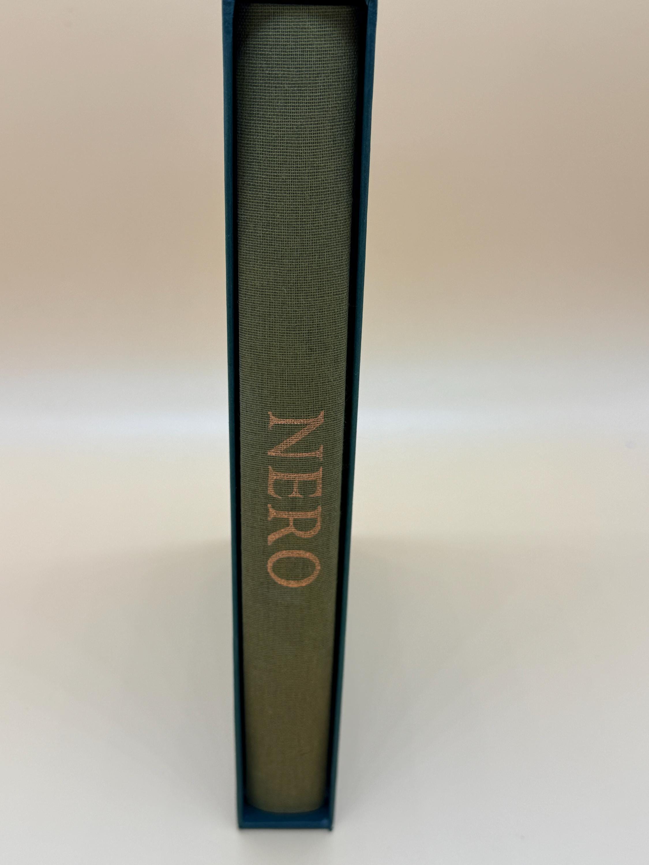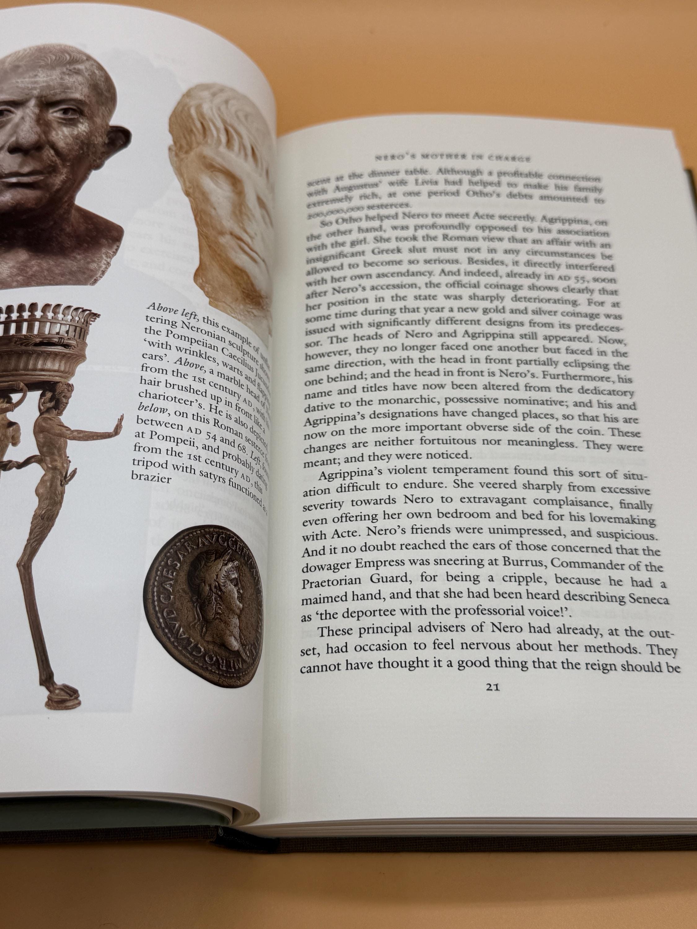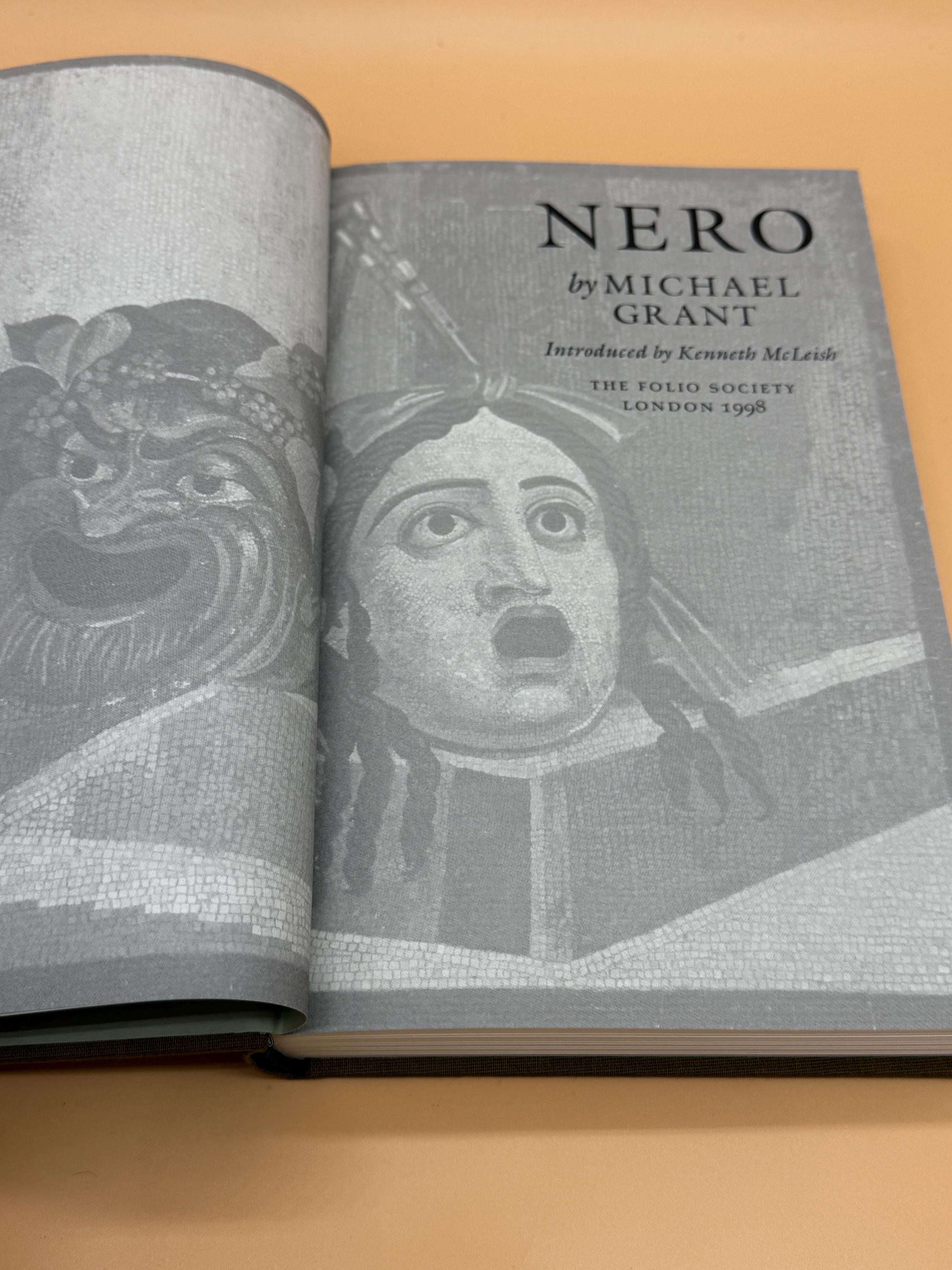 Originally published in 1970, this is Nero by Michael Grant, 4th printing, 2004 Folio Society. It is a historical narrative of the Roman Emperor. It is a biography that penetrates the ancient myths and gives a balanced picture of the man and the leader.