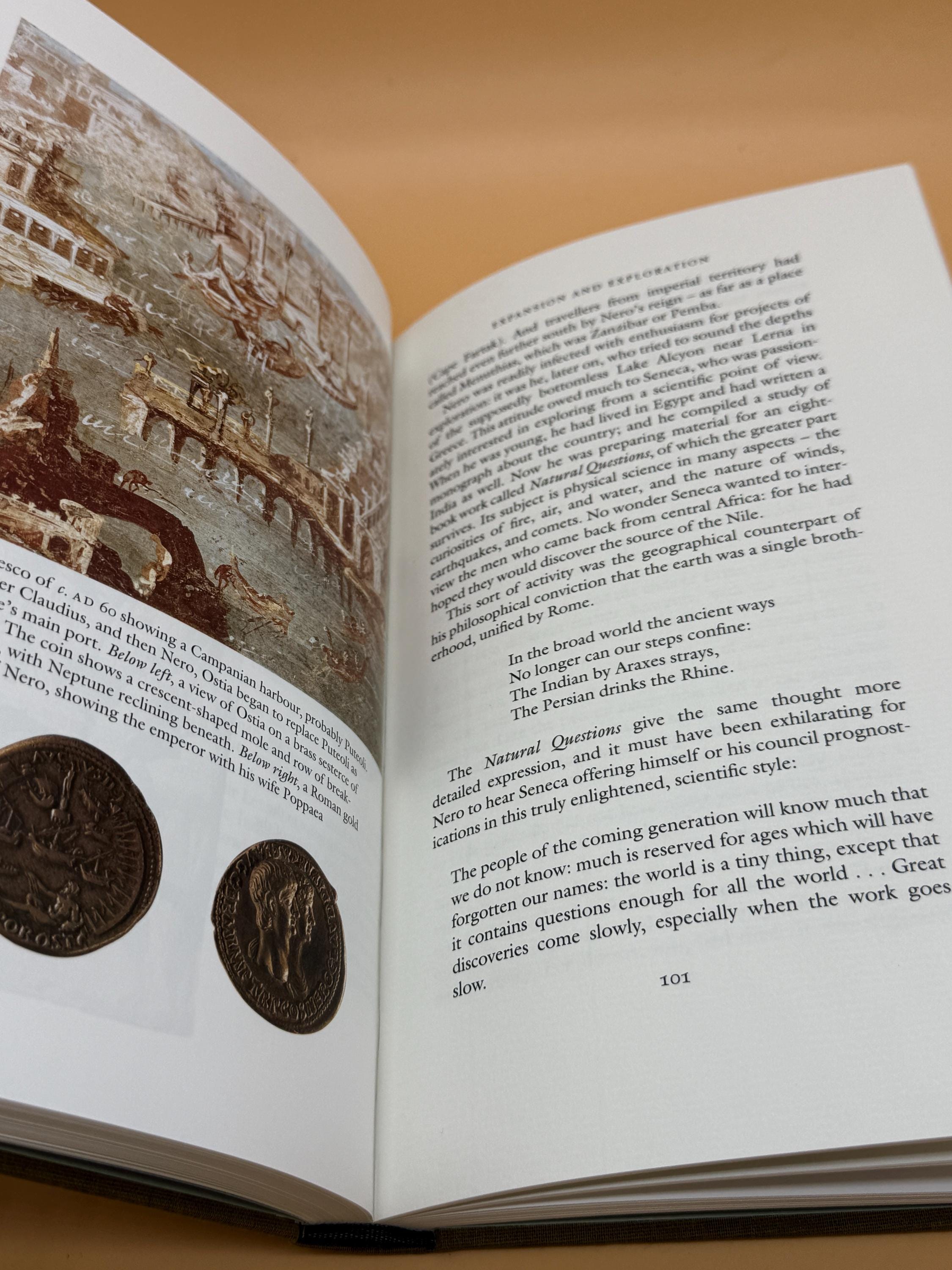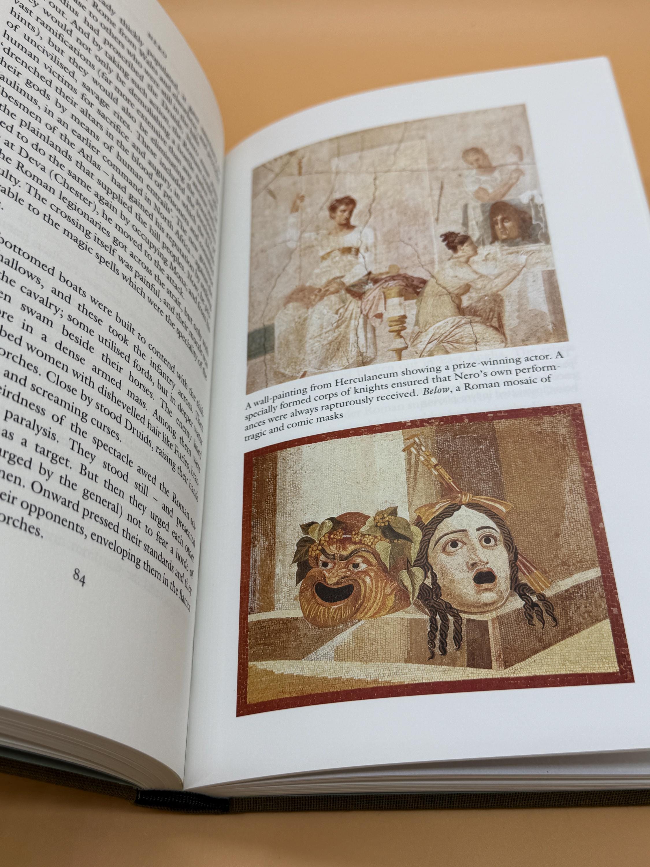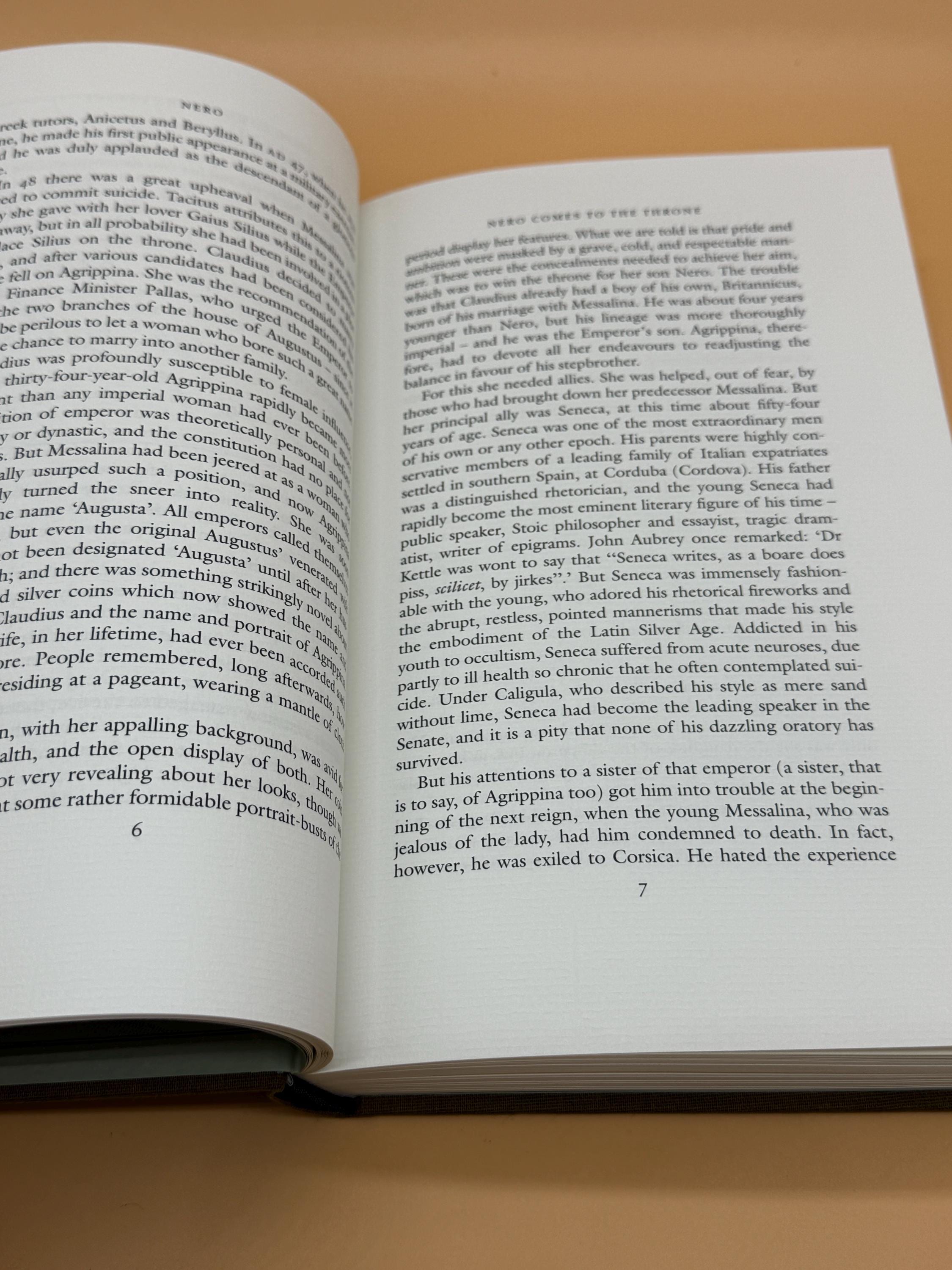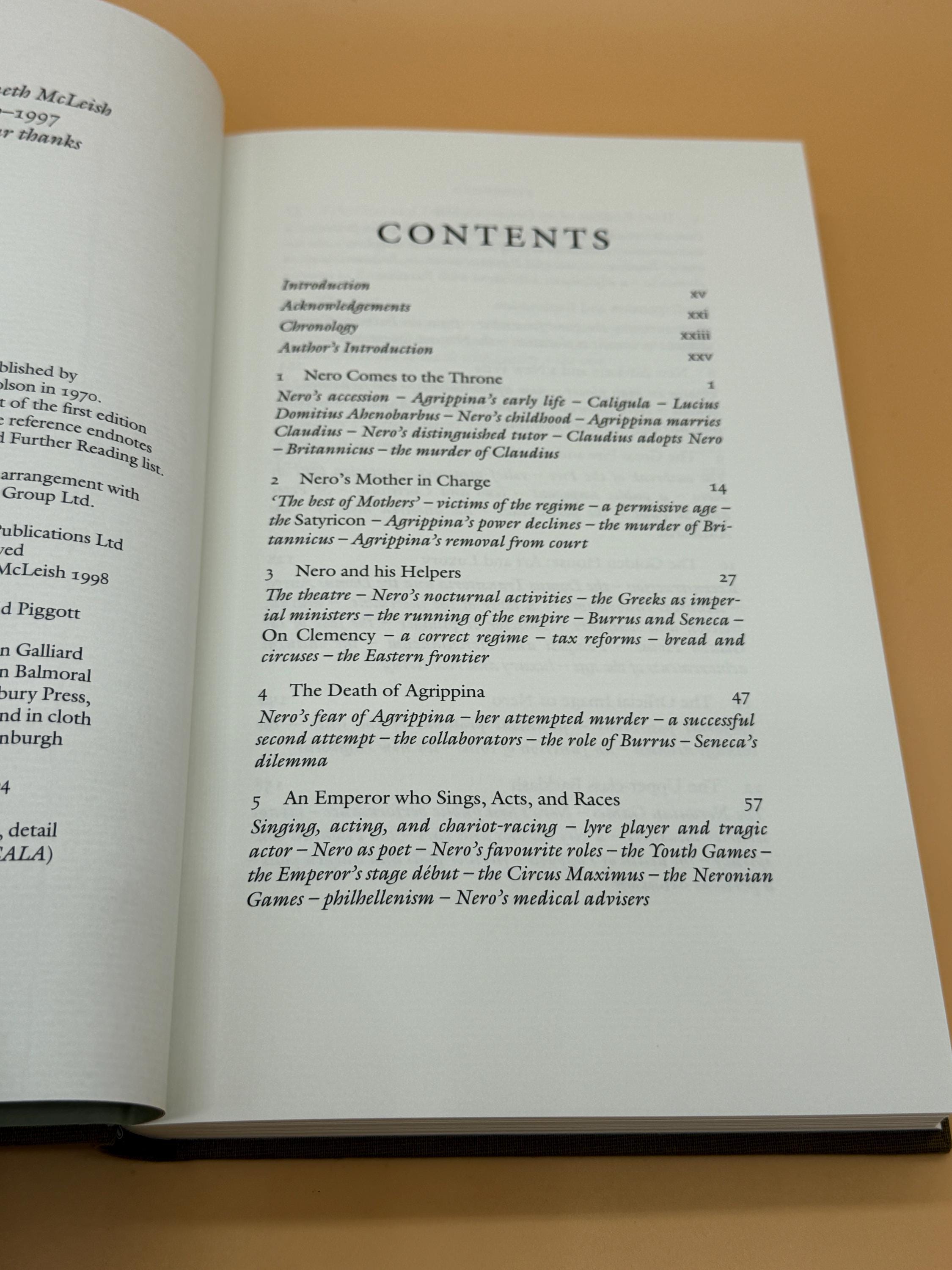 Originally published in 1970, this is Nero by Michael Grant, 4th printing, 2004 Folio Society. It is a historical narrative of the Roman Emperor. It is a biography that penetrates the ancient myths and gives a balanced picture of the man and the leader.