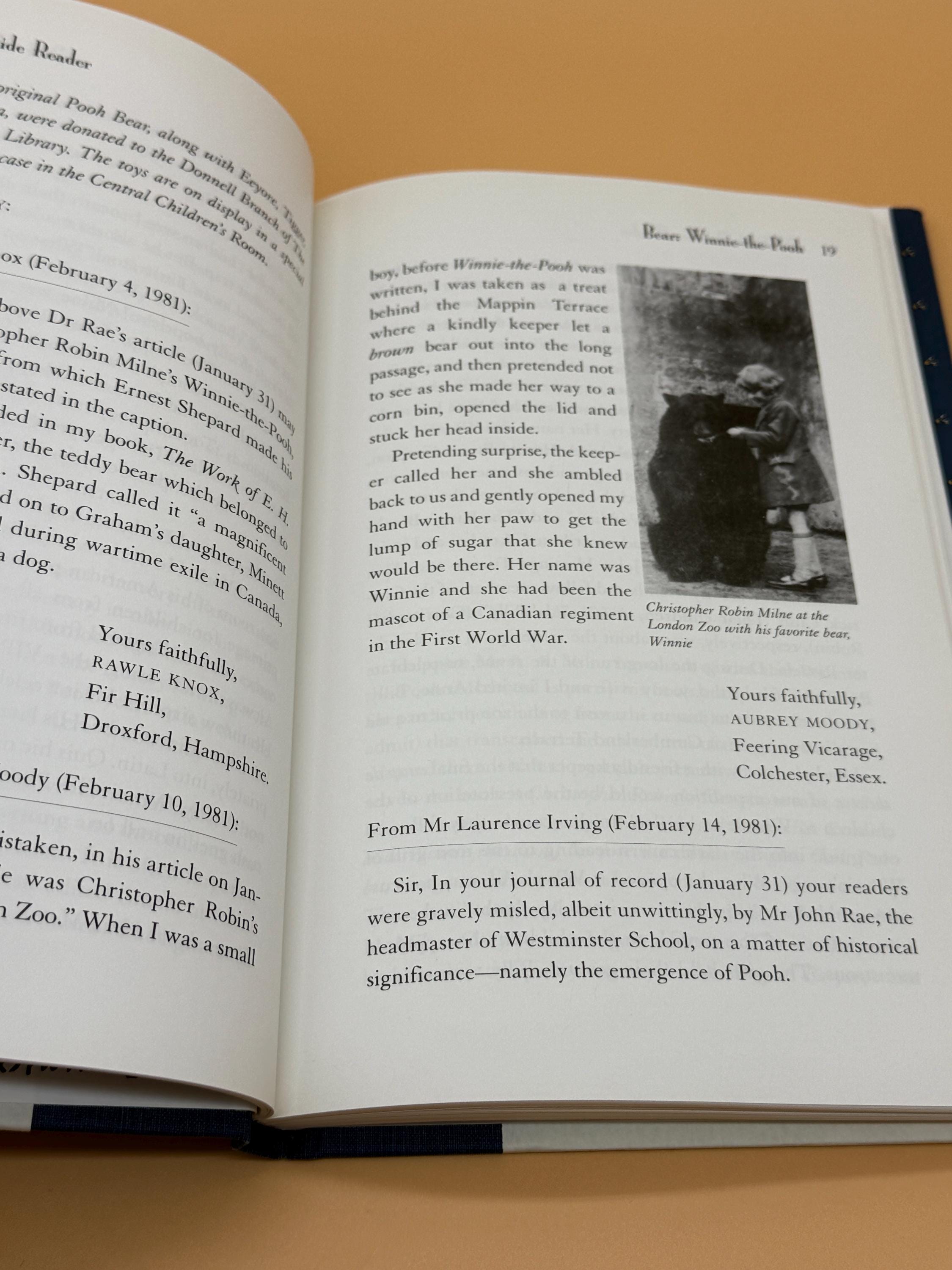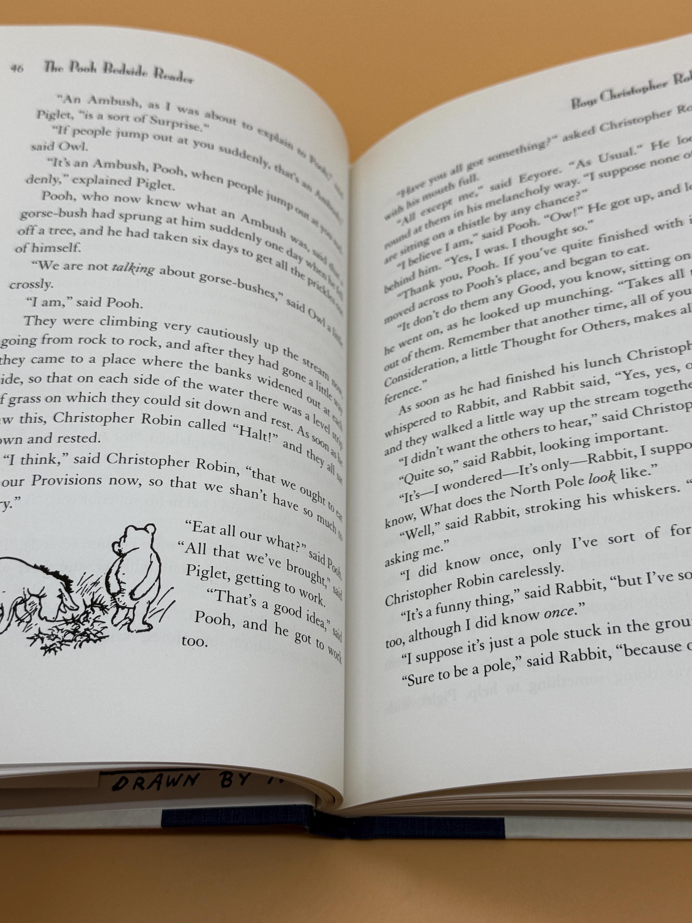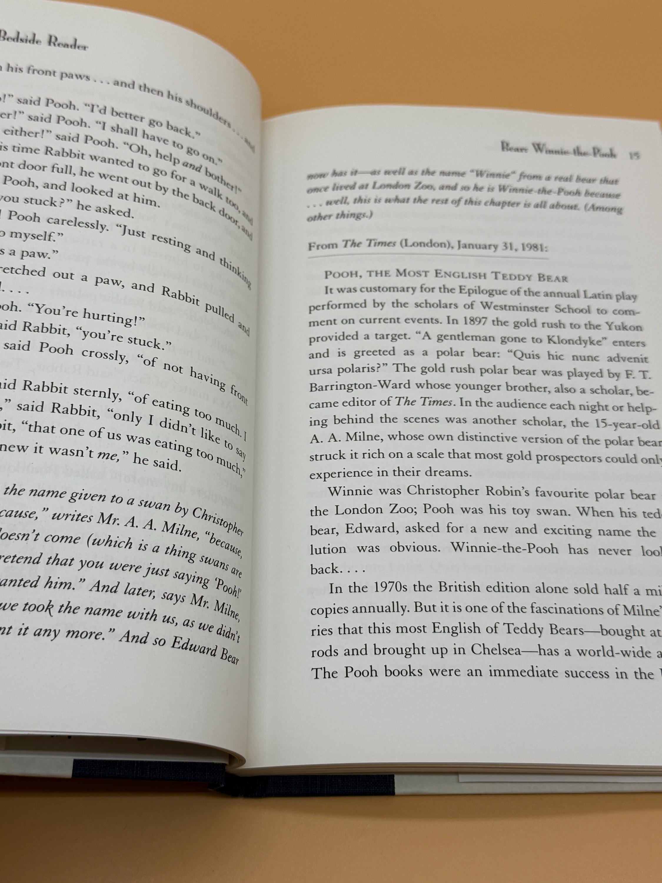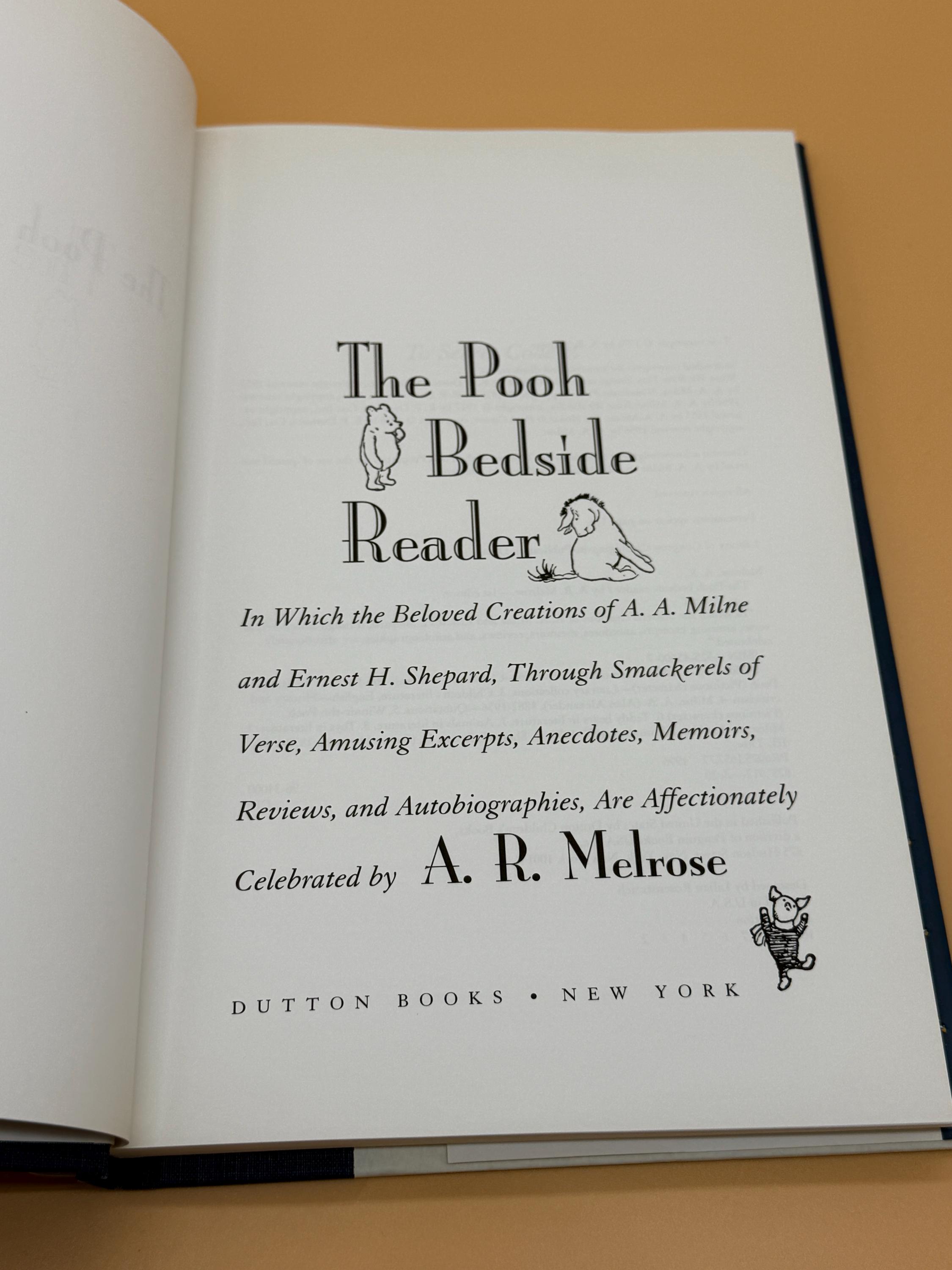 The Pooh Bedside Reader published by Dutton Books is the 70th Anniversary Collectors edition. The subtitle is; In Which the Beloved Creations of A.A. Milne and Ernest H. Shepard Through Smackerels of Verst, Using Excerpts, Anecdotes, Memoirs, Reviews and Autobiographies are Affectionately Celebrated by A.R. Milsore. The characters of the Hundred Acre Wood are among the most celebrated in Childrens literature. Pooh, Piglet, Eeyore and others are celebrated in the unique nature of each of them. The book is a fascinating portrait into their enduring appeal. There are excerpts from the original books, memoirs, photos, and of course, Ernest H. Shepard's illustrations that illuminate each character.