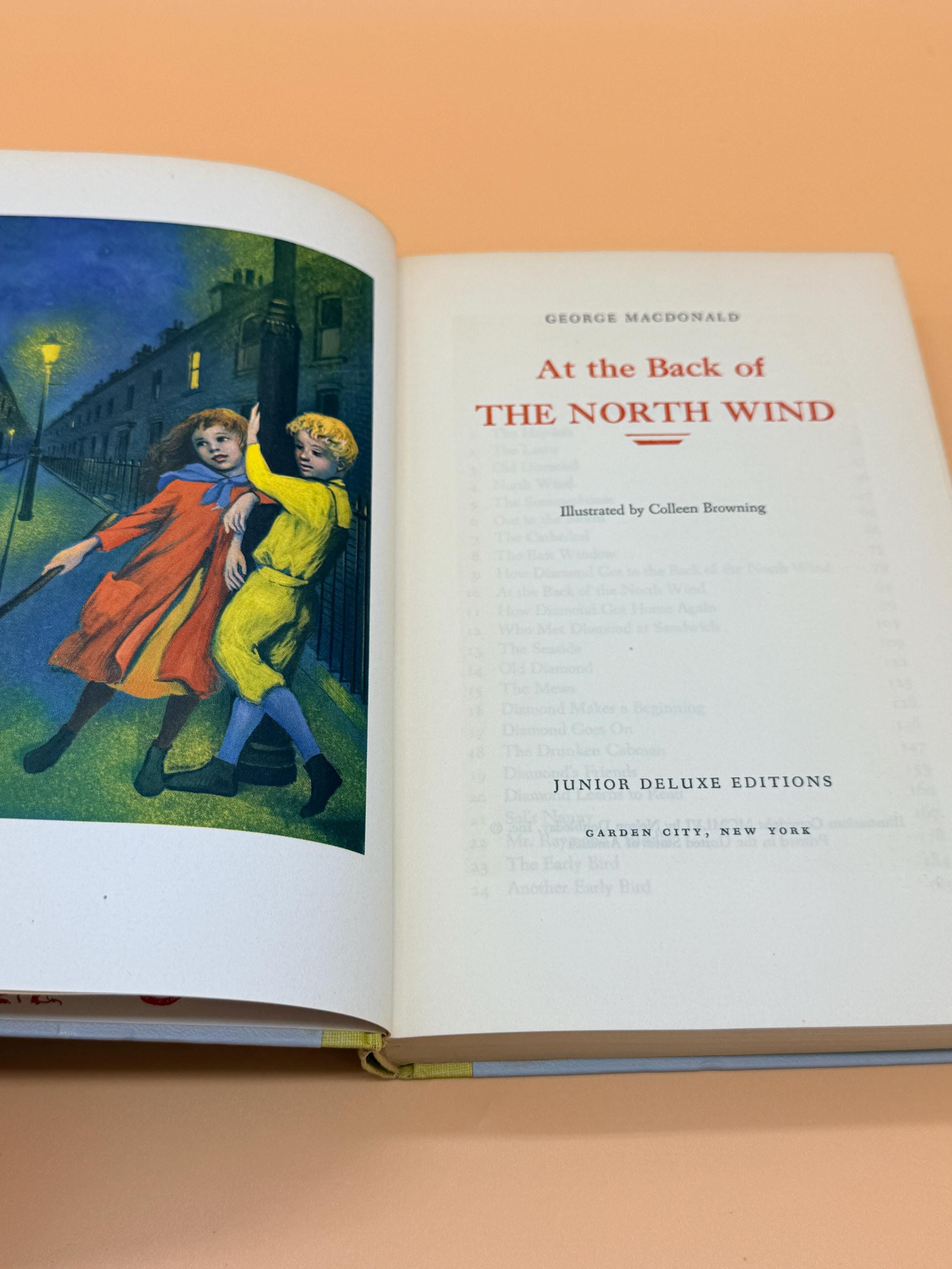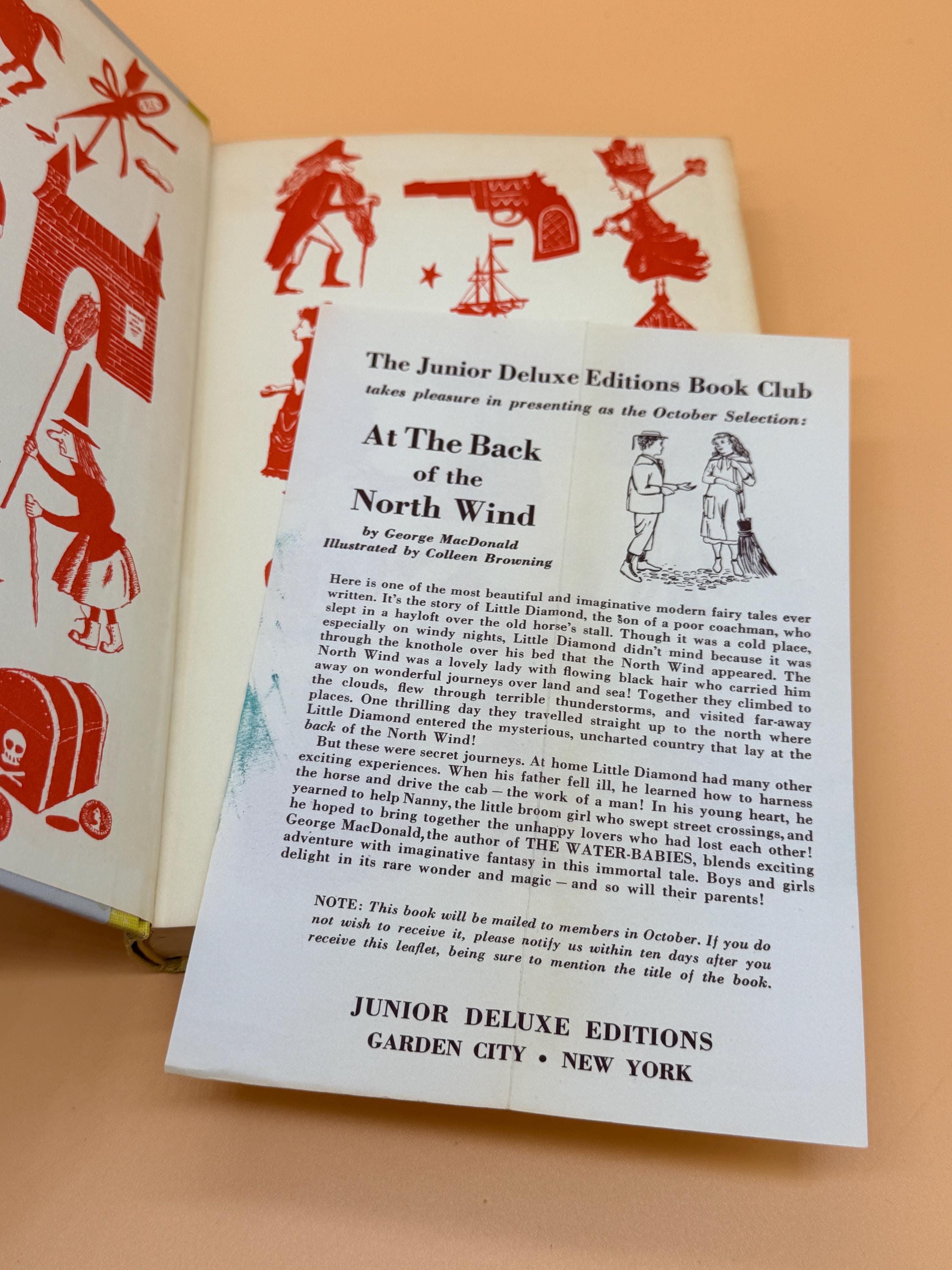 This is At The Back of the North Wind by George MacDonald. to explain the insert that accompanied this volume, the inserts were place in the book and featured the NEXT months volume. So given this insert is actually for this title, At The Back of The North Wind, the previous owner removed the insert from the PREVIOUS book received and placed it in the following months book to match the insert with the titled edition. Inserts were place in the series to let subscribers know what title was coming the following month. It is a nice touch to have the insert matching the book title as it was saved and place in the book when it arrived.