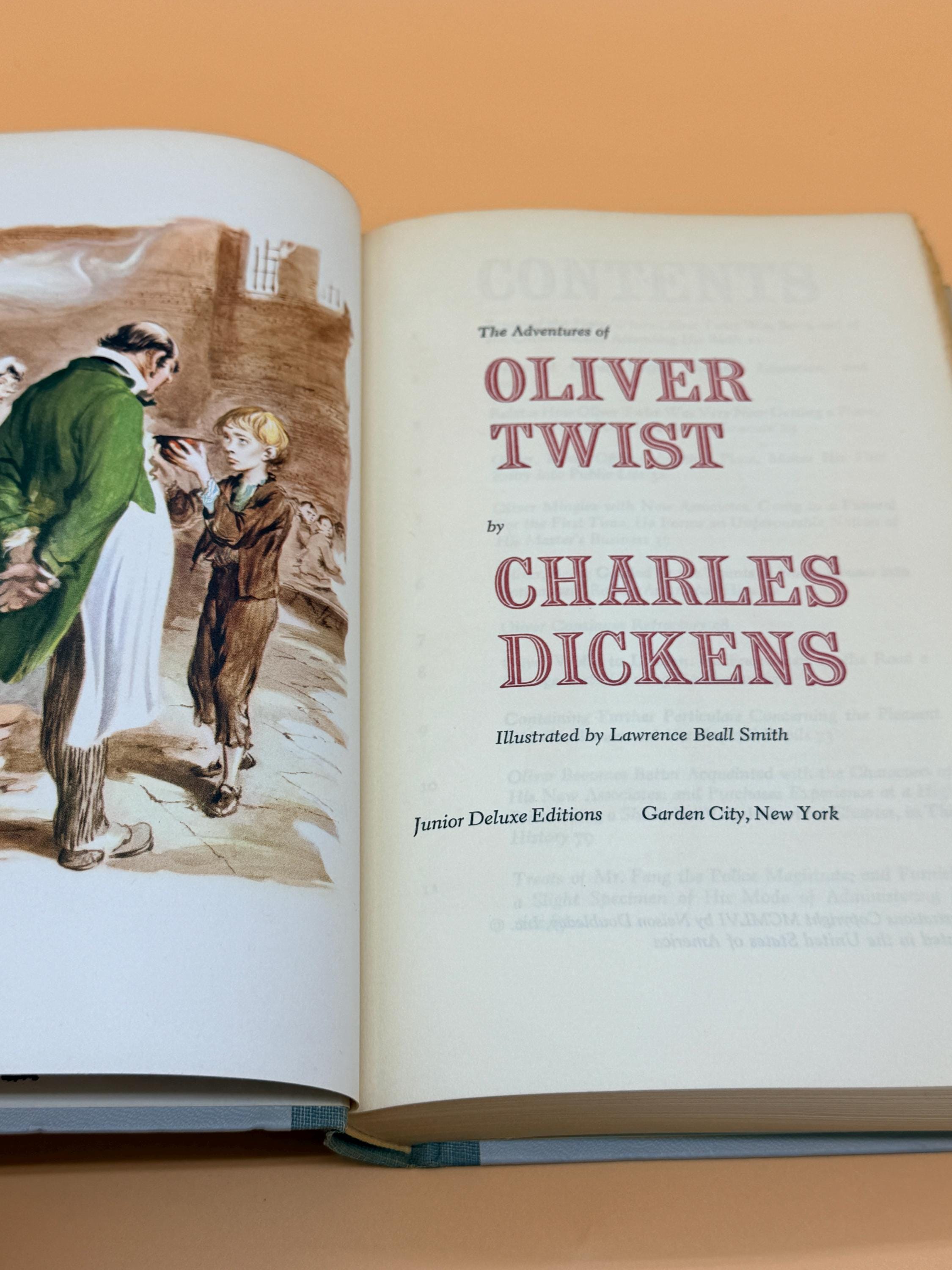 This is the classic literary story, Oliver Twist, by Charles Dickens. This edition is nicely illustrated by Lawrence Beall Smith with black and white sketched and a full color frontispiece.