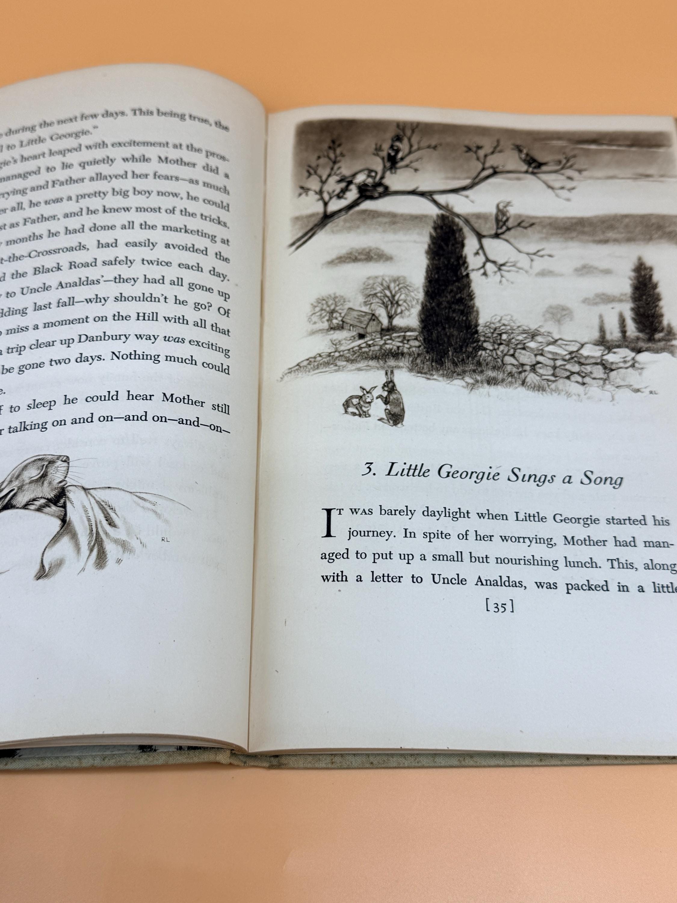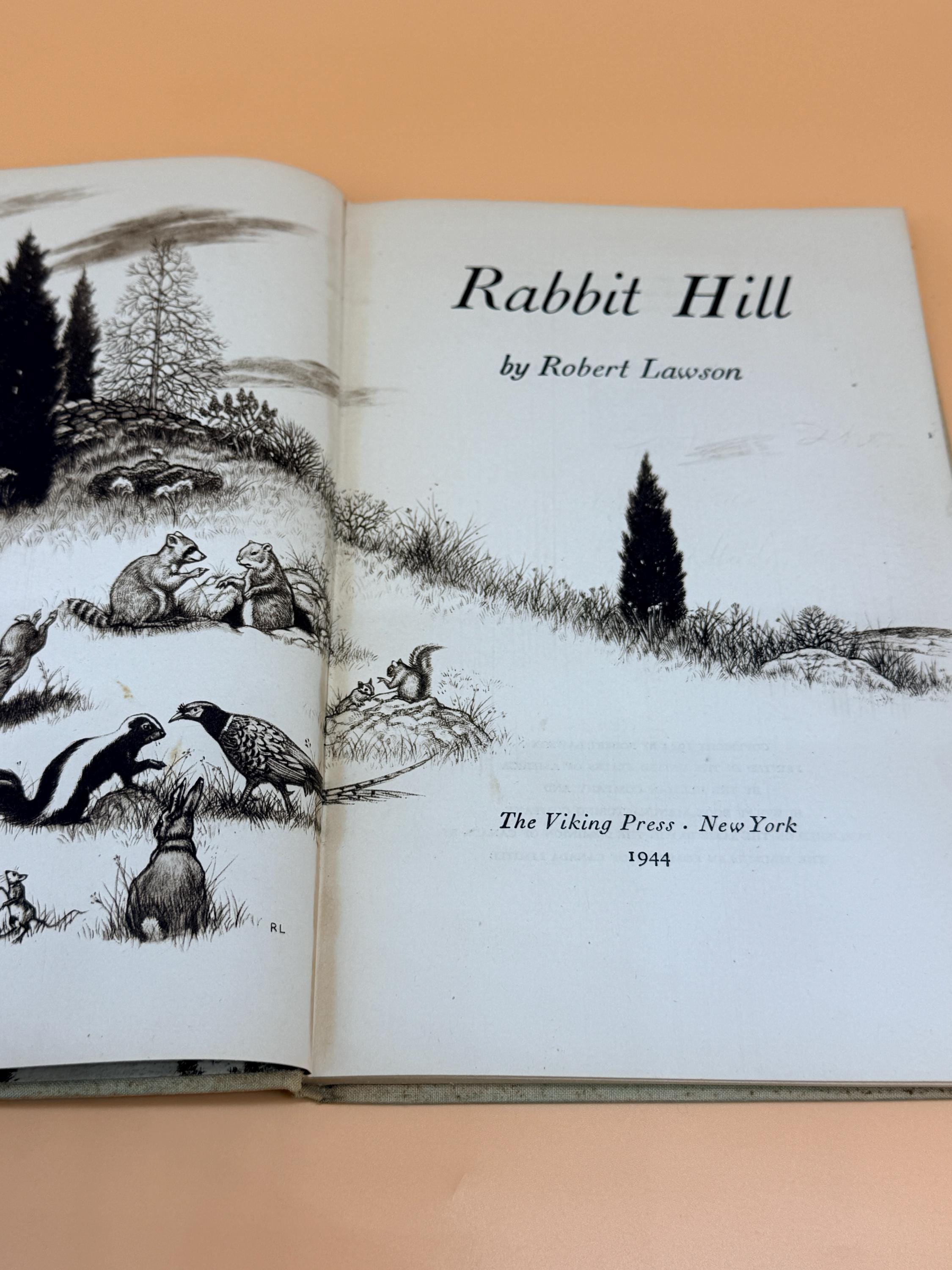 This is a good and solid hardcover, NO dust jacket, jacket missing. First Edition 1944 Viking Press. This copy is good inside and out. NOTE: on first blank page, gift inscription "To Thomas X-mas 1947 Aunt Lois and Uncle Earl". Rest of inside pages are very good and clean. Only very light natural tanning to pages from age. The binding is tight and straight. Hardcover boards in green cloth are illustrated front and back with title lettering along spine. Medium octavo book size or 6.5" x 9.5" with 128 pages and illustrated endpapers front and back.