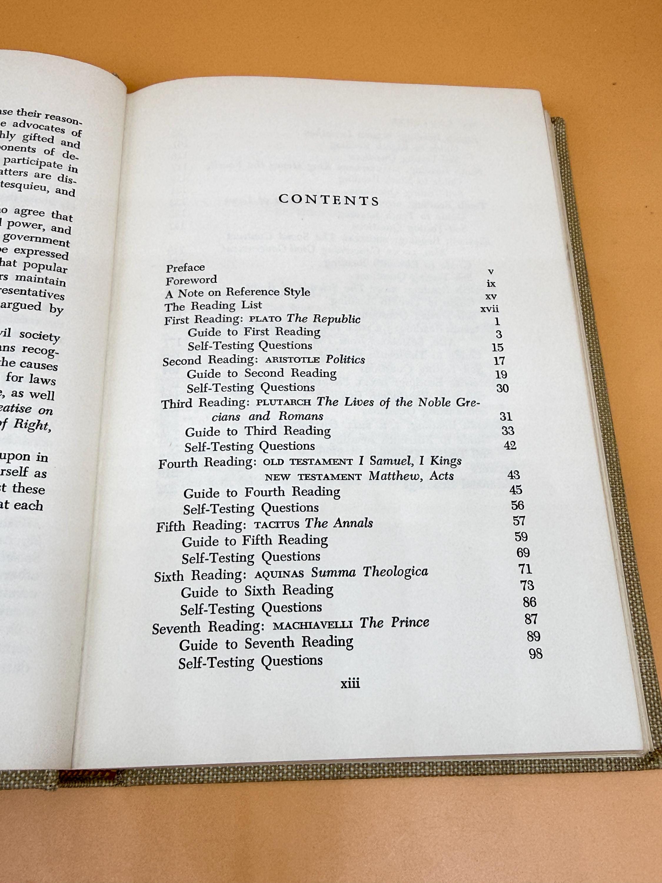This is The Development of Political Theory and Government. Contents include; Aristotle - Politics, Plutarch - Lives of the Noble Grecians and Romans, Old Testament - Samuel/Kings, New Testament - Matthew/Acts, Tacitus The Annal, Aquinas - Summa Theological, Machiavelli The Prince, Shakespeare - King Henry the 4th, Montesquieu - The Spirit of Laws, Rousseau - Social Contract and Locke Civil Government, Kant - the Science of Right and more.