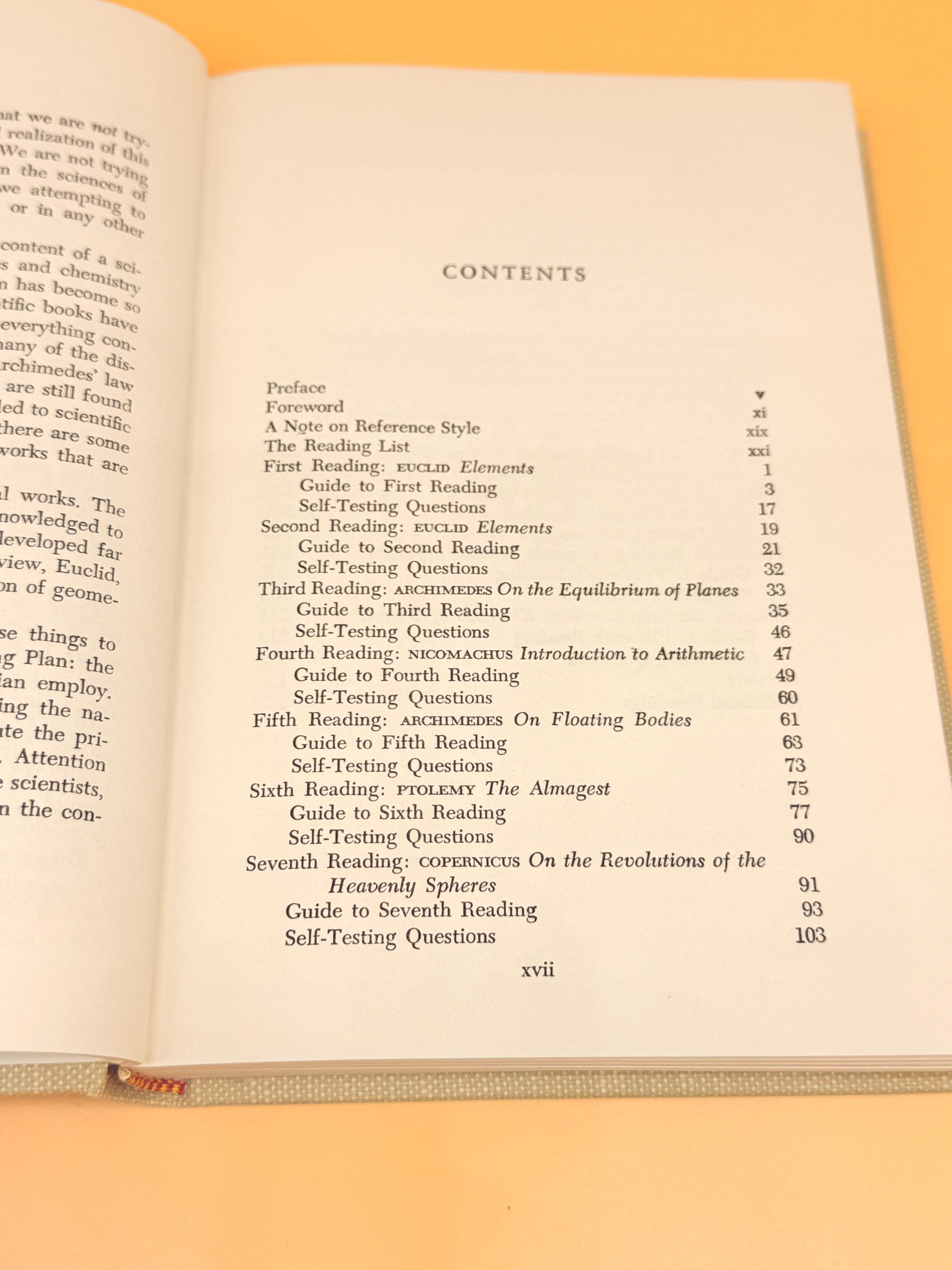 This is Foundations of Science and Mathematics. Contents include; Euclid - Elements, Archimedes - On the Equilibrium of Planes, Nicomachus - Intro to Arithmetic, Archimedes - On Floating Bodies, Ptolemy - the Almagest, Copernicus - On the Revolution of the Heavenly Spheres, Kepler - Epitome of Copernican Astronomy, Galileo - The Two New Sciences, Bacon - Ovum Organum, Pascal - Great Experiment on Euilibrium of Fluids, Newton - Mathematical Principles of Natural Philosophy, Newton - Optics and more.