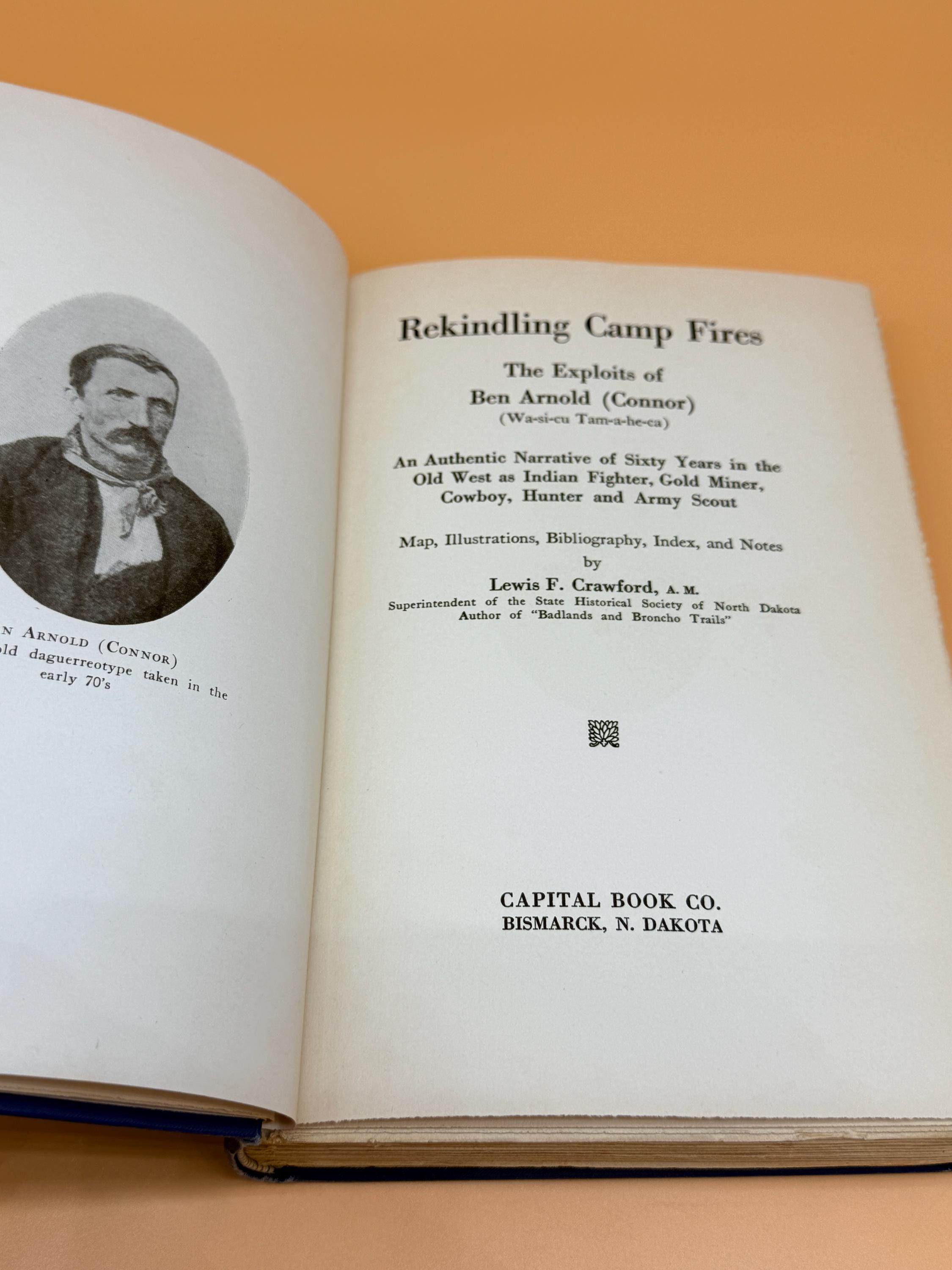 Rekindling Camp Fires The Exploits of Ben Arnold by Lewis F. Crawford is subtitled An Authentic Narrative of Sixty Years in the Old West as Indian Fighter, Gold Miner, Cowboy, Hunter and Army Scout. The edition contains maps, illustrations, bibliography, notes and index. It is a detailed history of life in the Old West among cowboys, Indians, miners, adventures, and encounters.