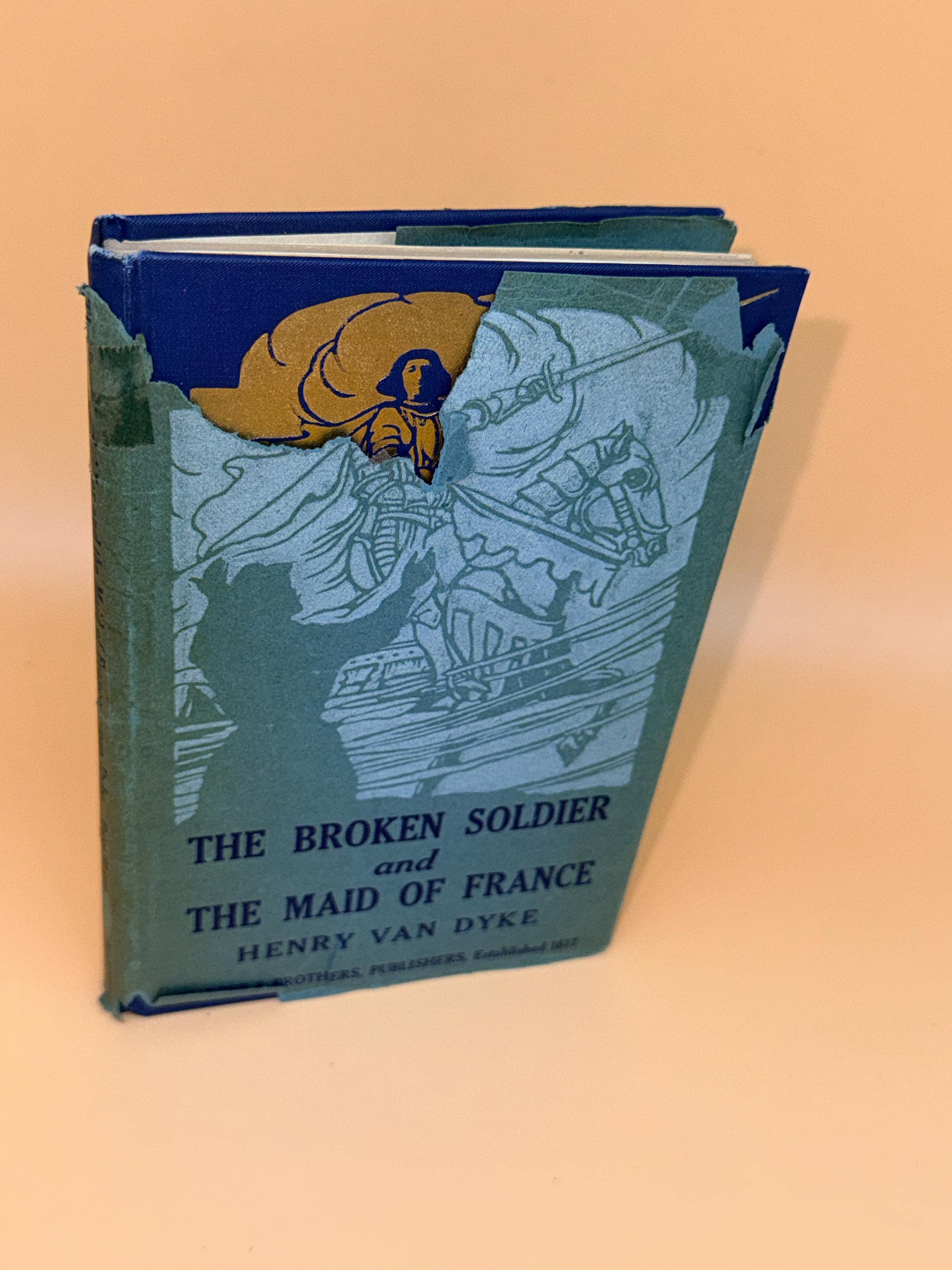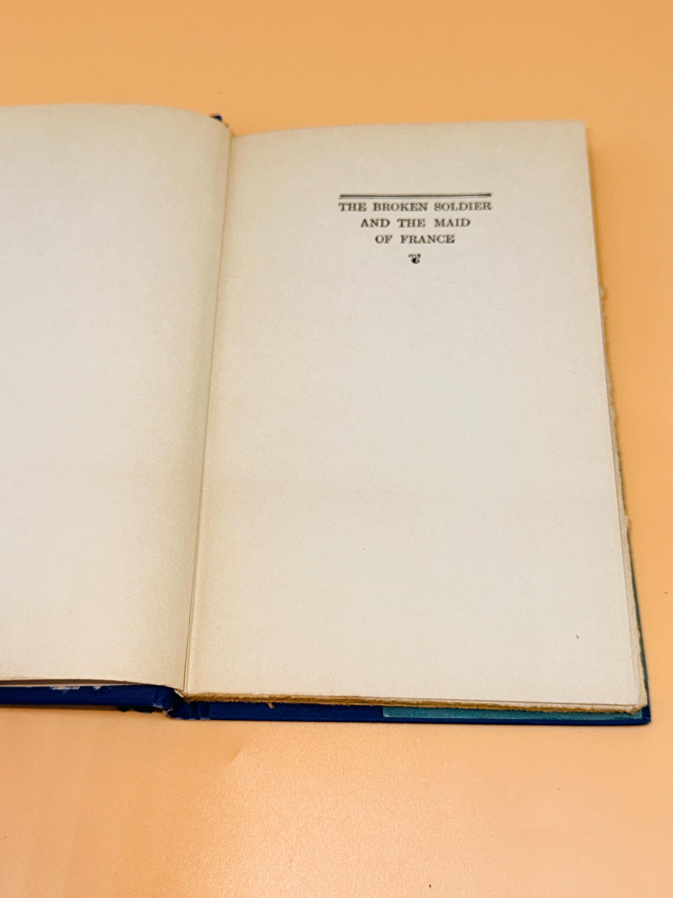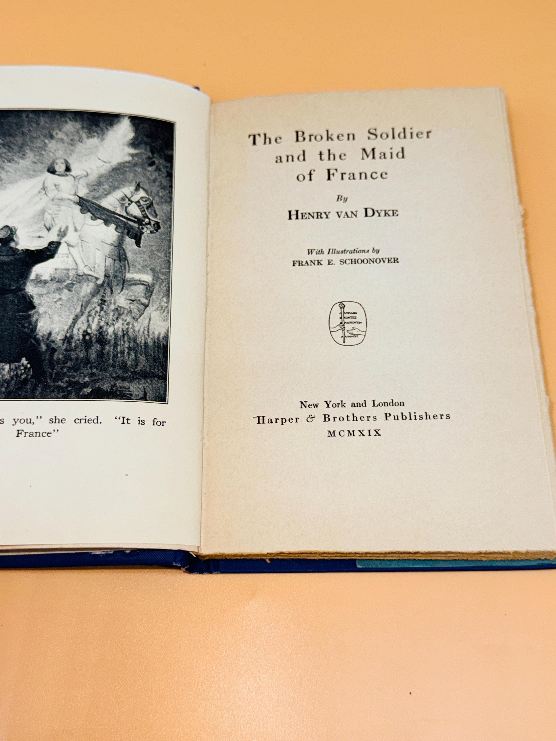 This is The Broken Soldier and The Maid of France by Henry Van Dyke. Out of the beautiful myth the soldiers of France were inspired on the battlefield by visions of Joan of Arc, this is the story of Poilu who saw the maid of France in a dream. With her help he then went on to fight just when he was about to give up. This edition is illustrated by F. E. Schoonover.