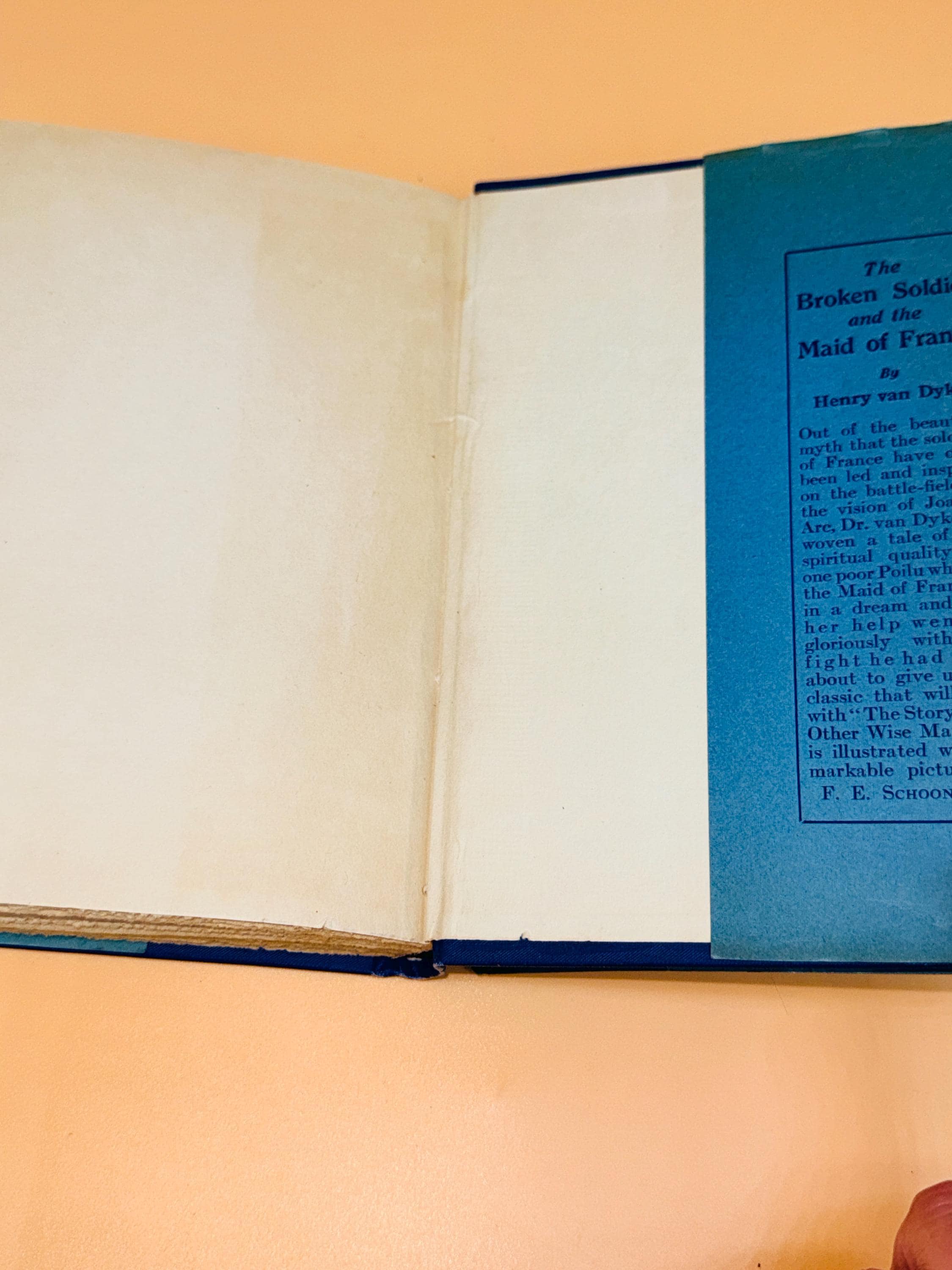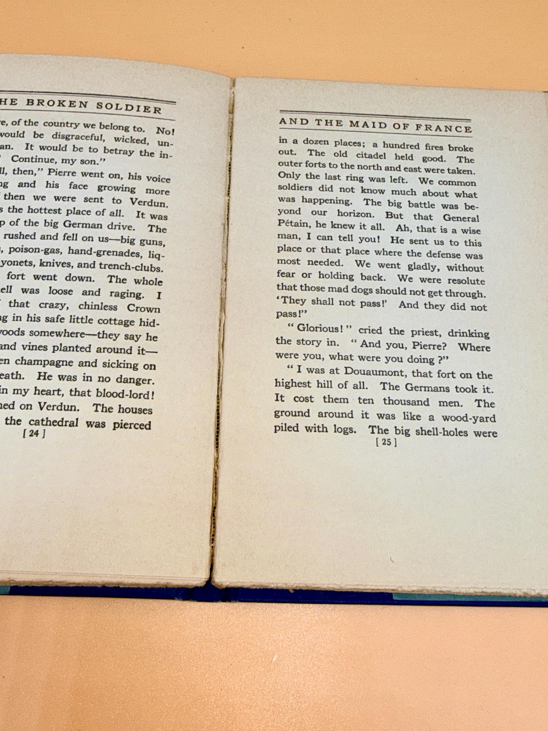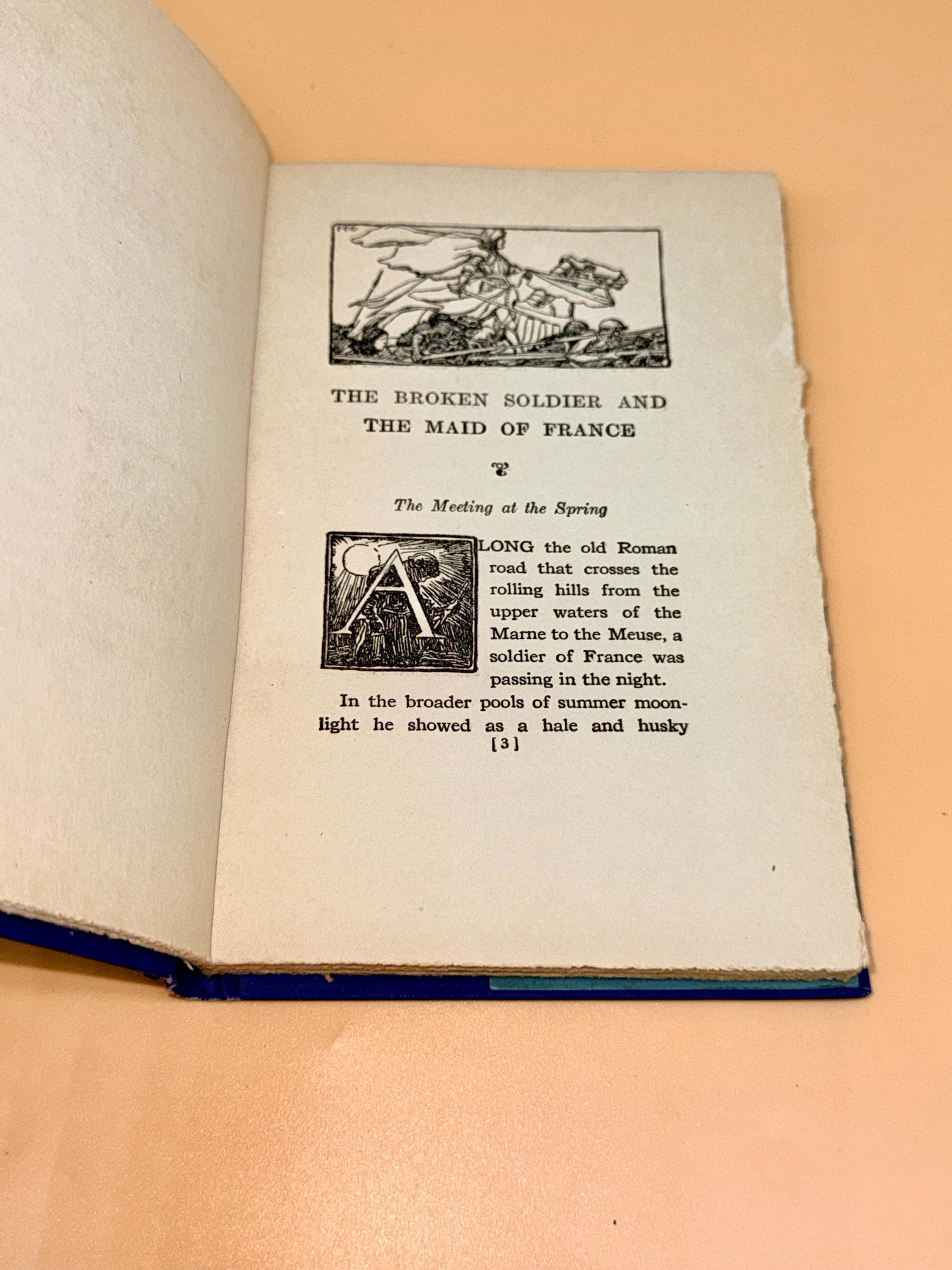 This is The Broken Soldier and The Maid of France by Henry Van Dyke. Out of the beautiful myth the soldiers of France were inspired on the battlefield by visions of Joan of Arc, this is the story of Poilu who saw the maid of France in a dream. With her help he then went on to fight just when he was about to give up. This edition is illustrated by F. E. Schoonover.