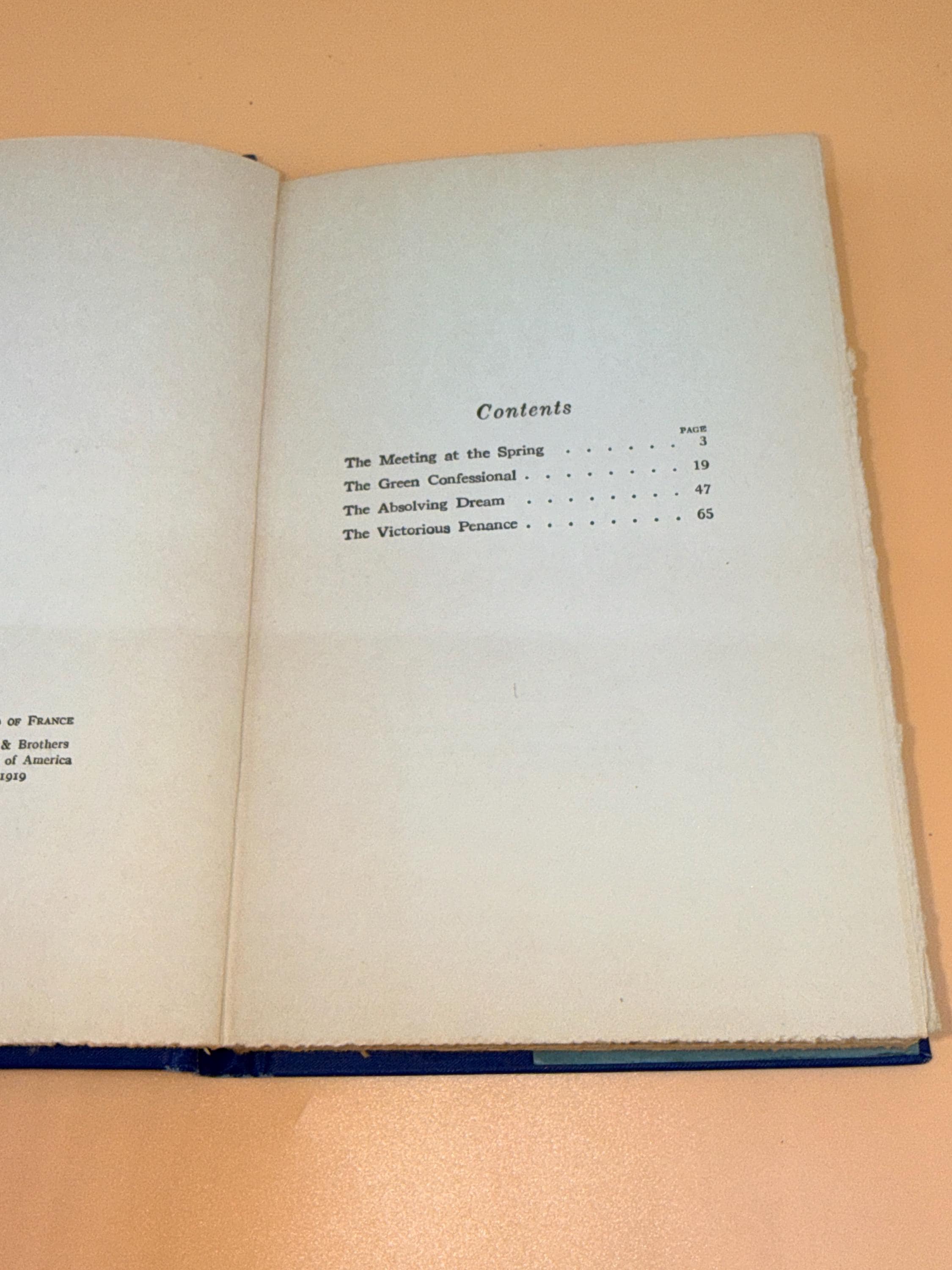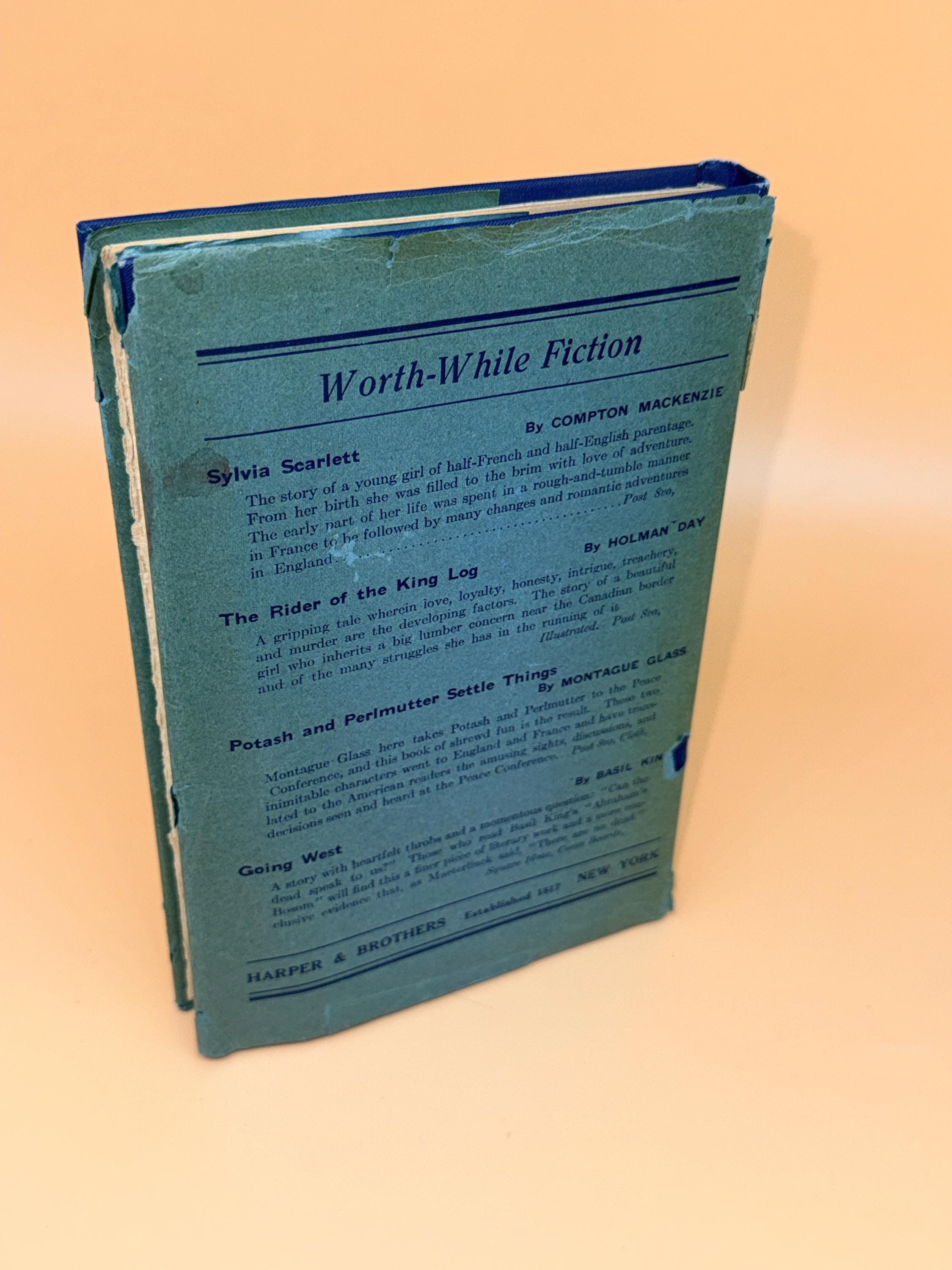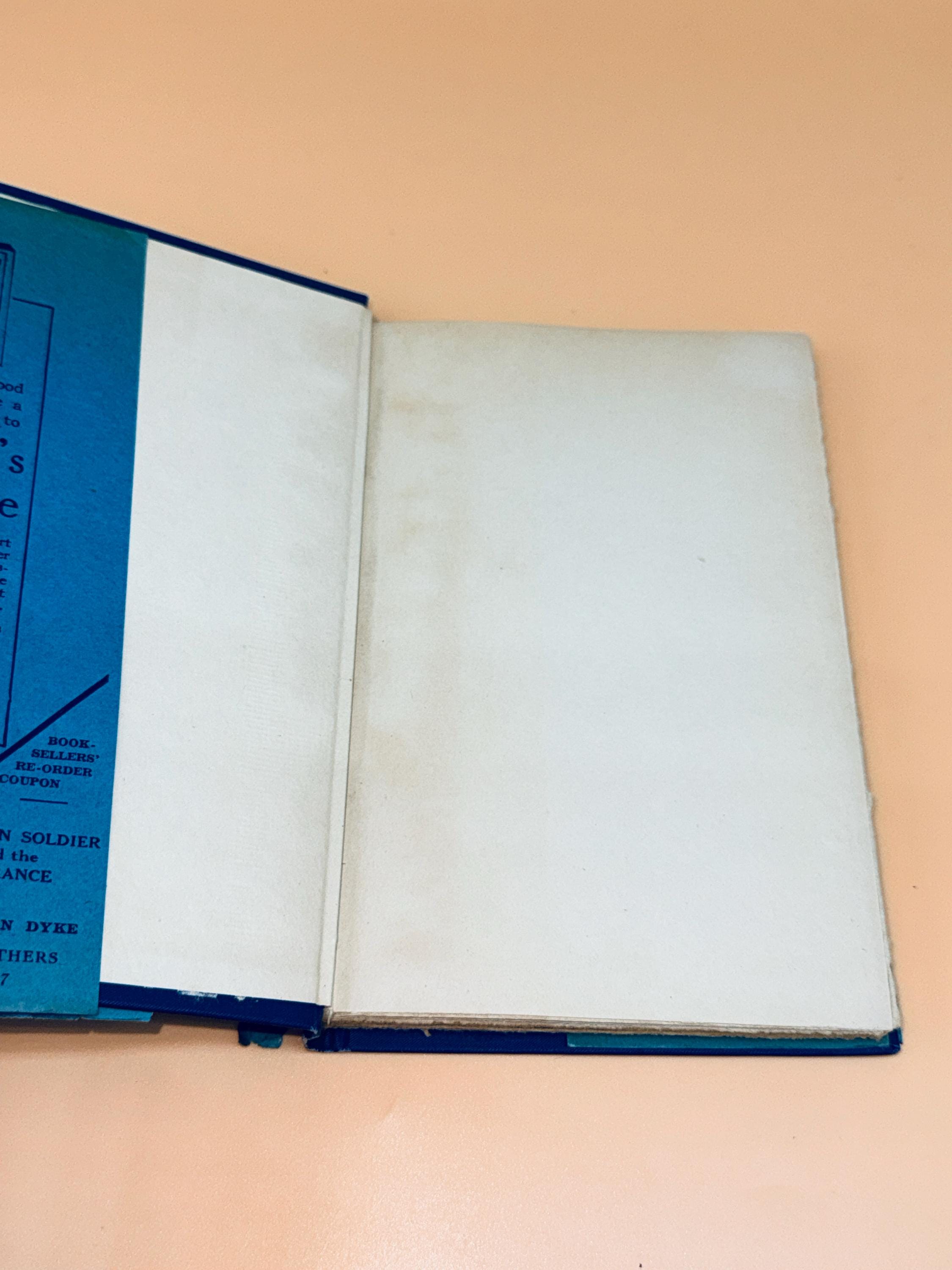 This is a good hardcover with an acceptable as present dust jacket. 1919 Harper Brothers Publishing. This copy is good inside and out. NOTE: there is a crack in binding between pages 24-25, see photo, but the pages are still tight to binding. The inside pages only have very light natural tanning from age and are clean. The navy blue hardcover boards are actually very good with only light shelf wear. Navy boards are very handsome, featuring warrior on horseback in gold with gold title lettering front cover. There is only a hint of wearing to gold gilt design and lettering front cover. Note that this is a smaller hardcover, designed at the time to be carried around in pocket of purse for reading anywhere. 12mo book size or 5" x 7.5" with 70 pages.