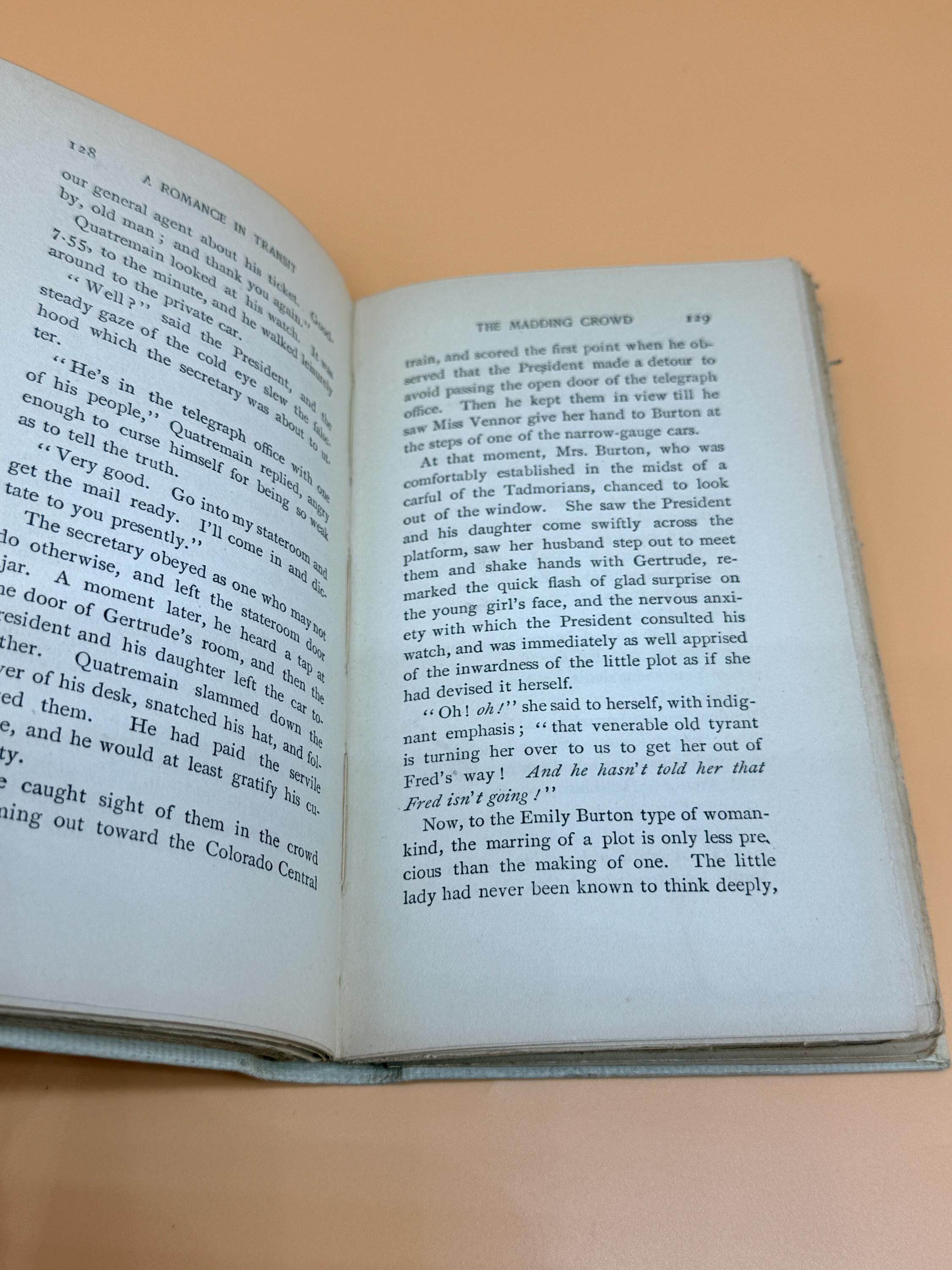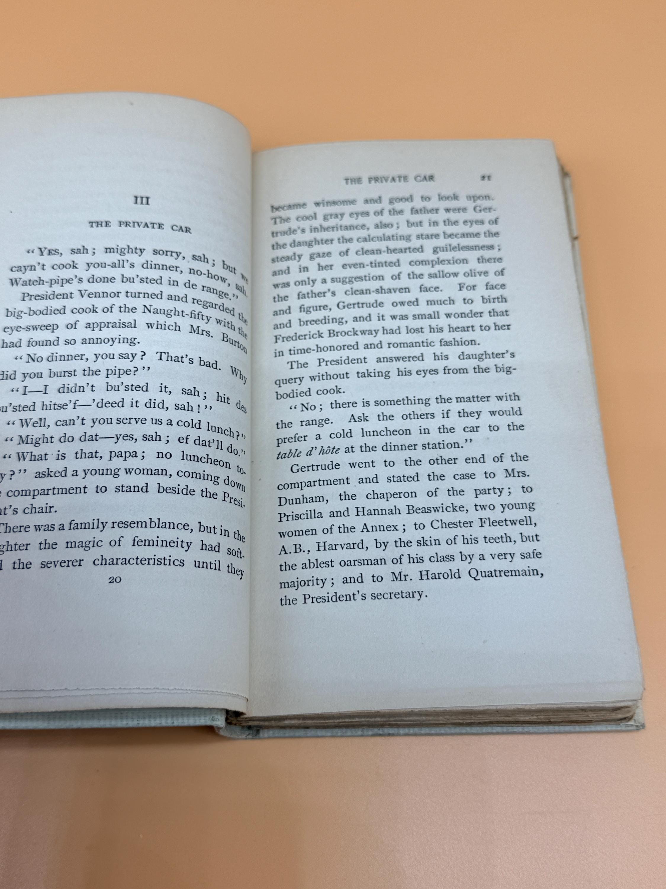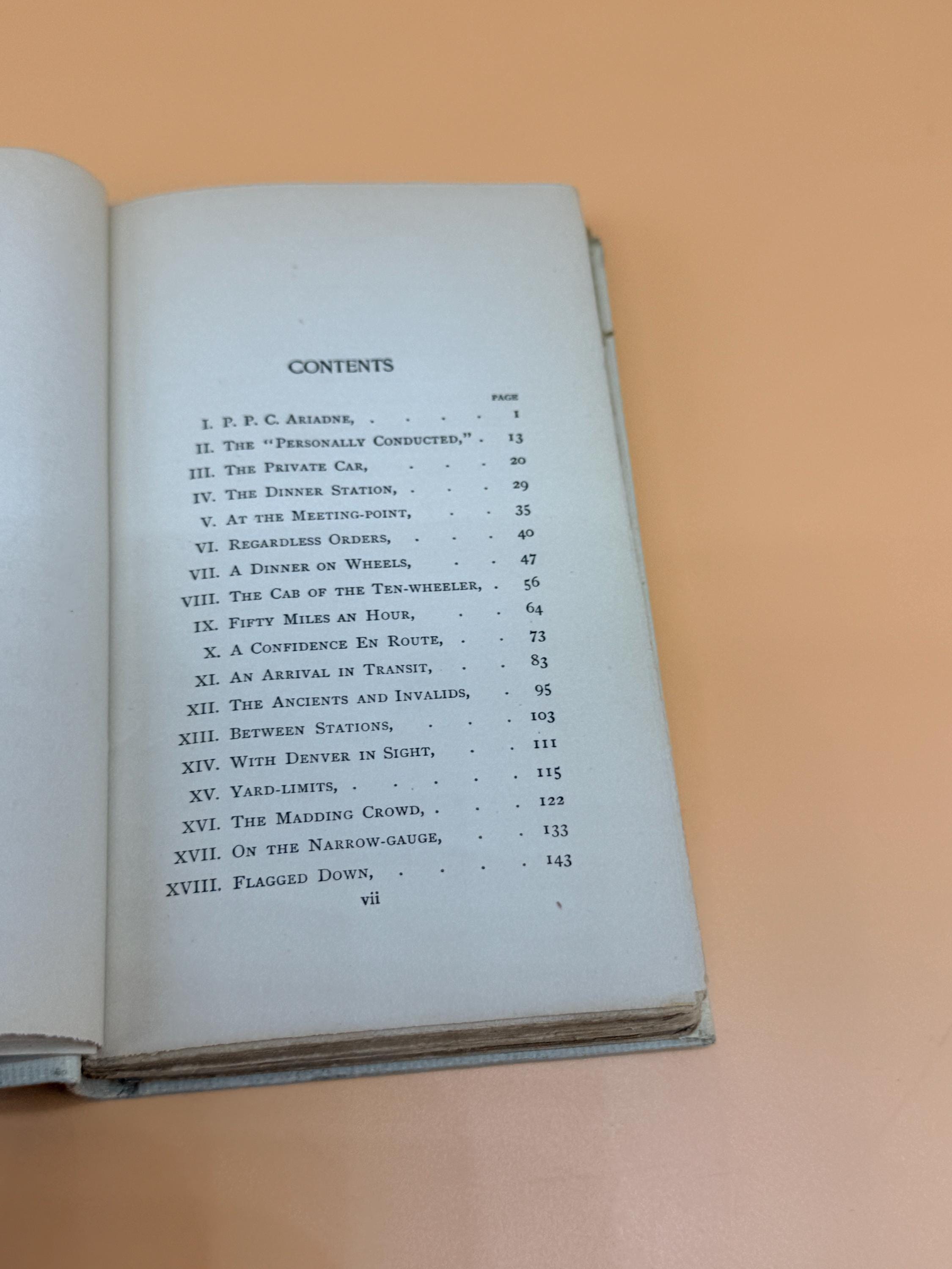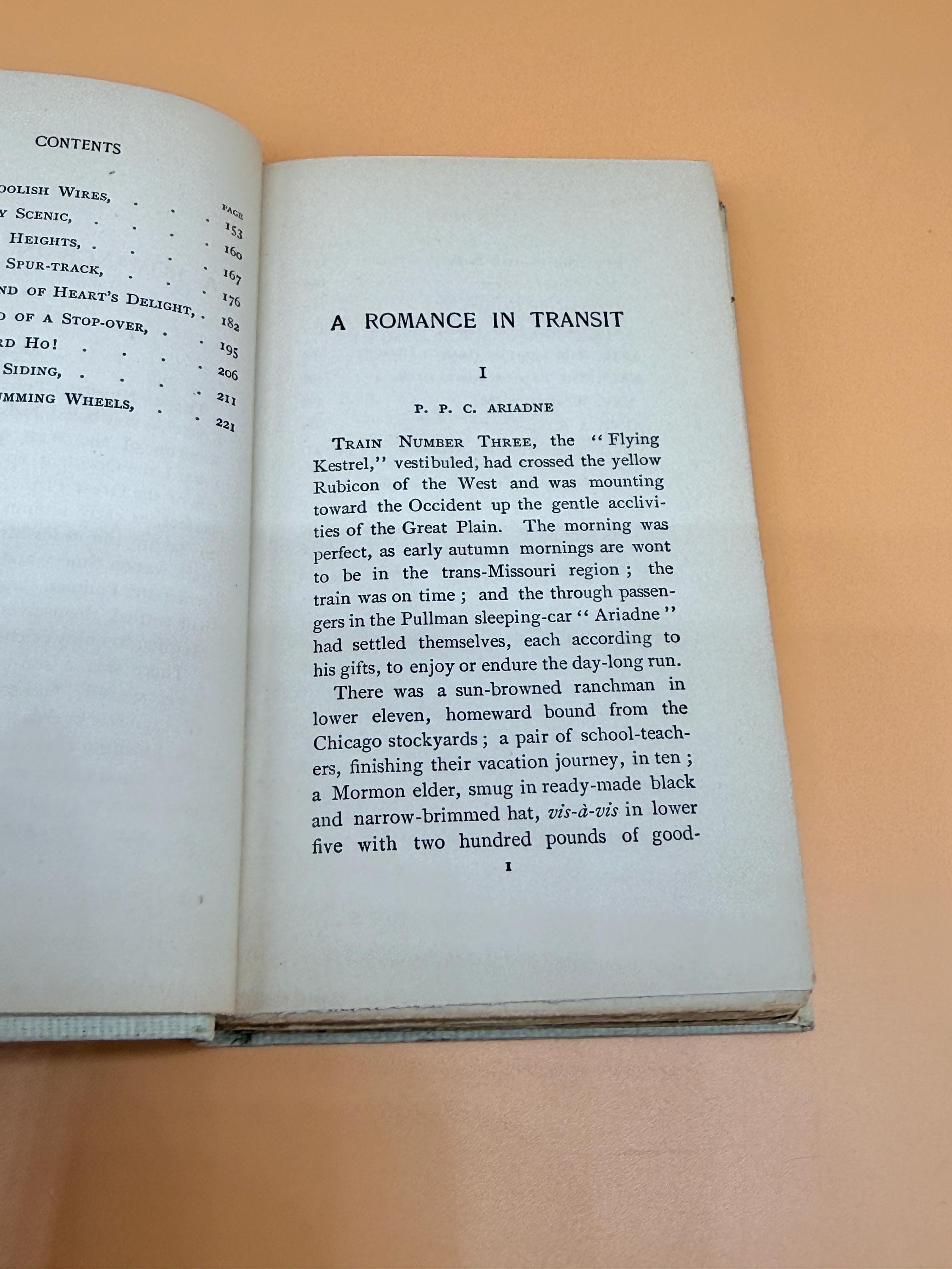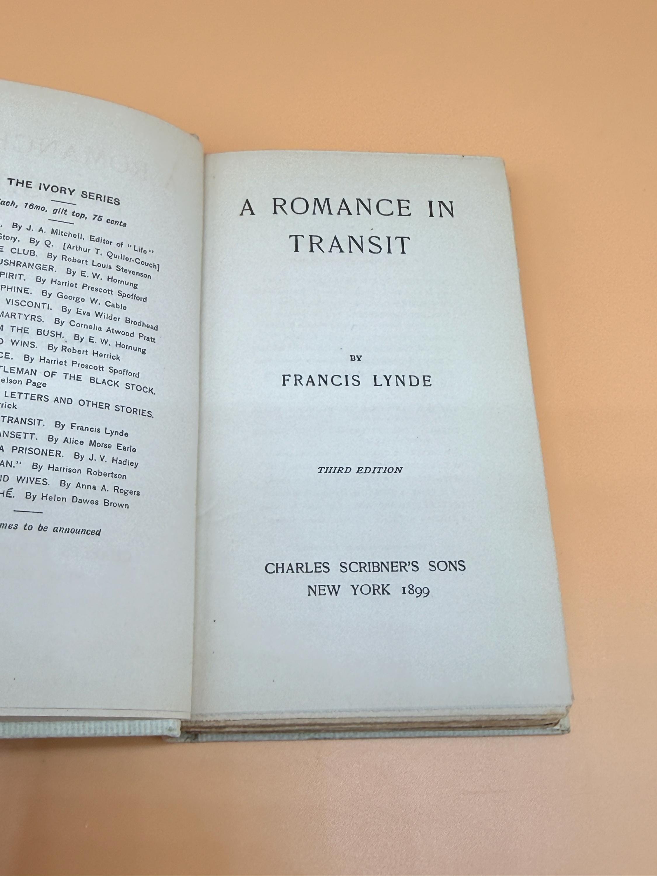 This edition of A Romance in Transit by Francis Lynd is the third edition from Scribners Publishing who originally published the first edition in 1899. It is one of "The Ivory Series" from Scribners which featured popular classic literature titles in handsome small books, 16mo, gilt tops or top page edges tipped in gilt, and were priced at .75 cents each. Second and third edition books were generally printed 5-10 years after initial First Editions if the books were successful so we have dated this approx. 1910.