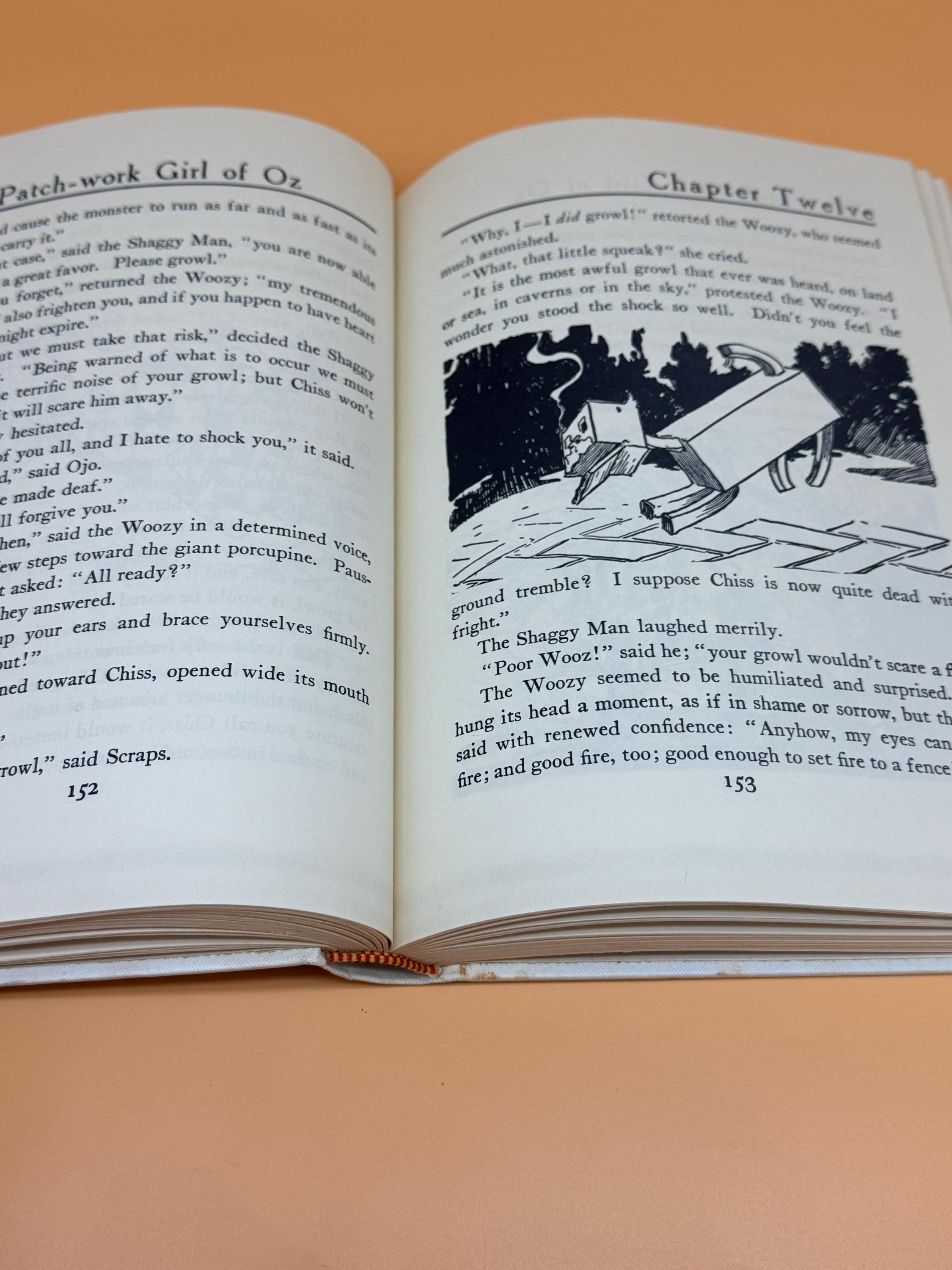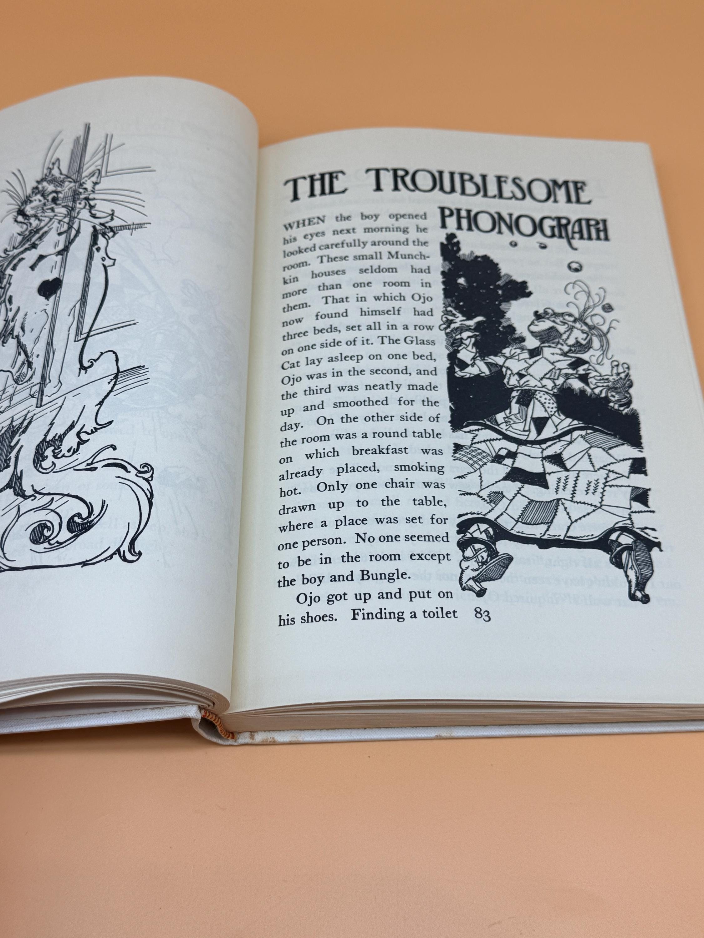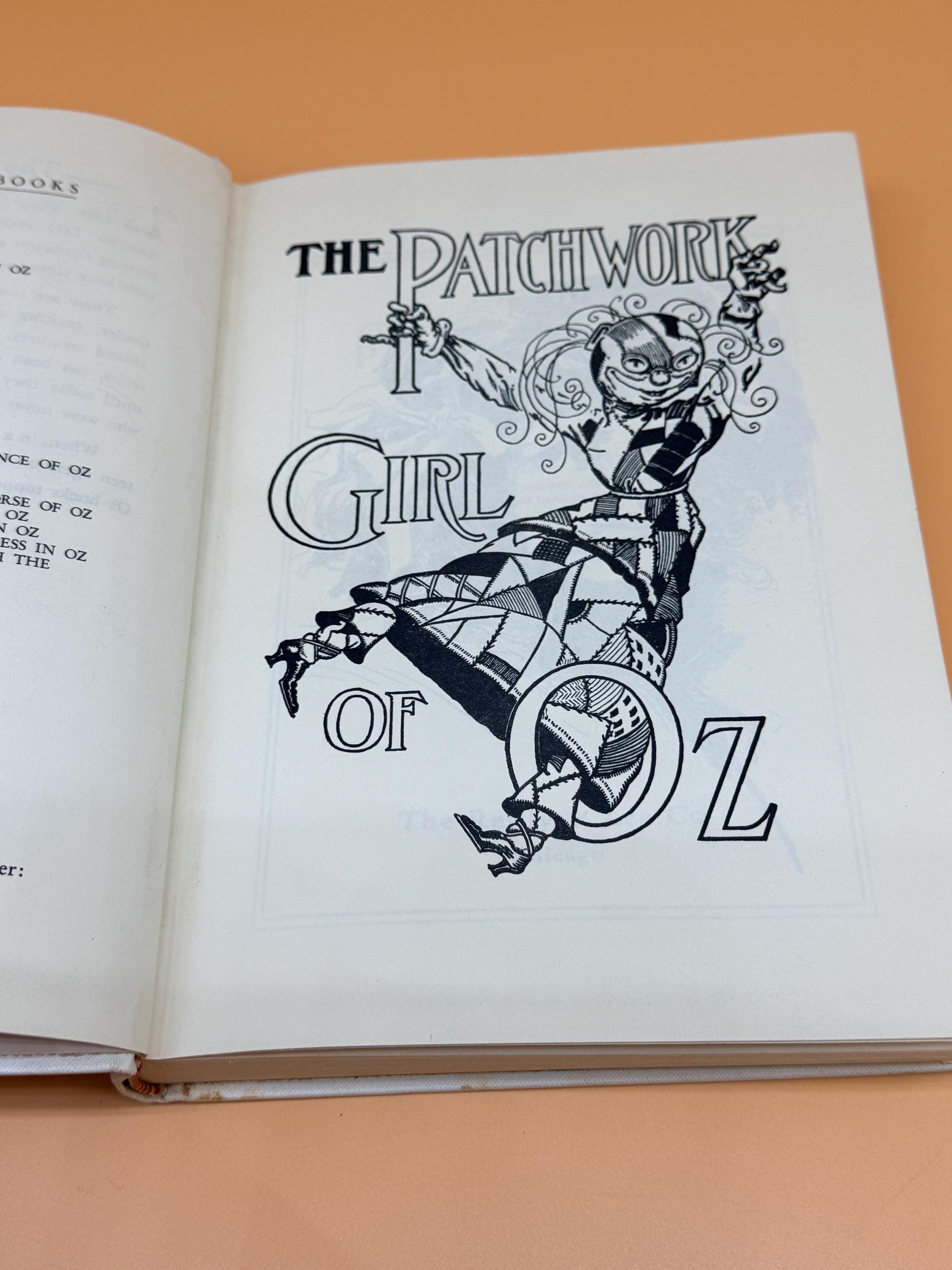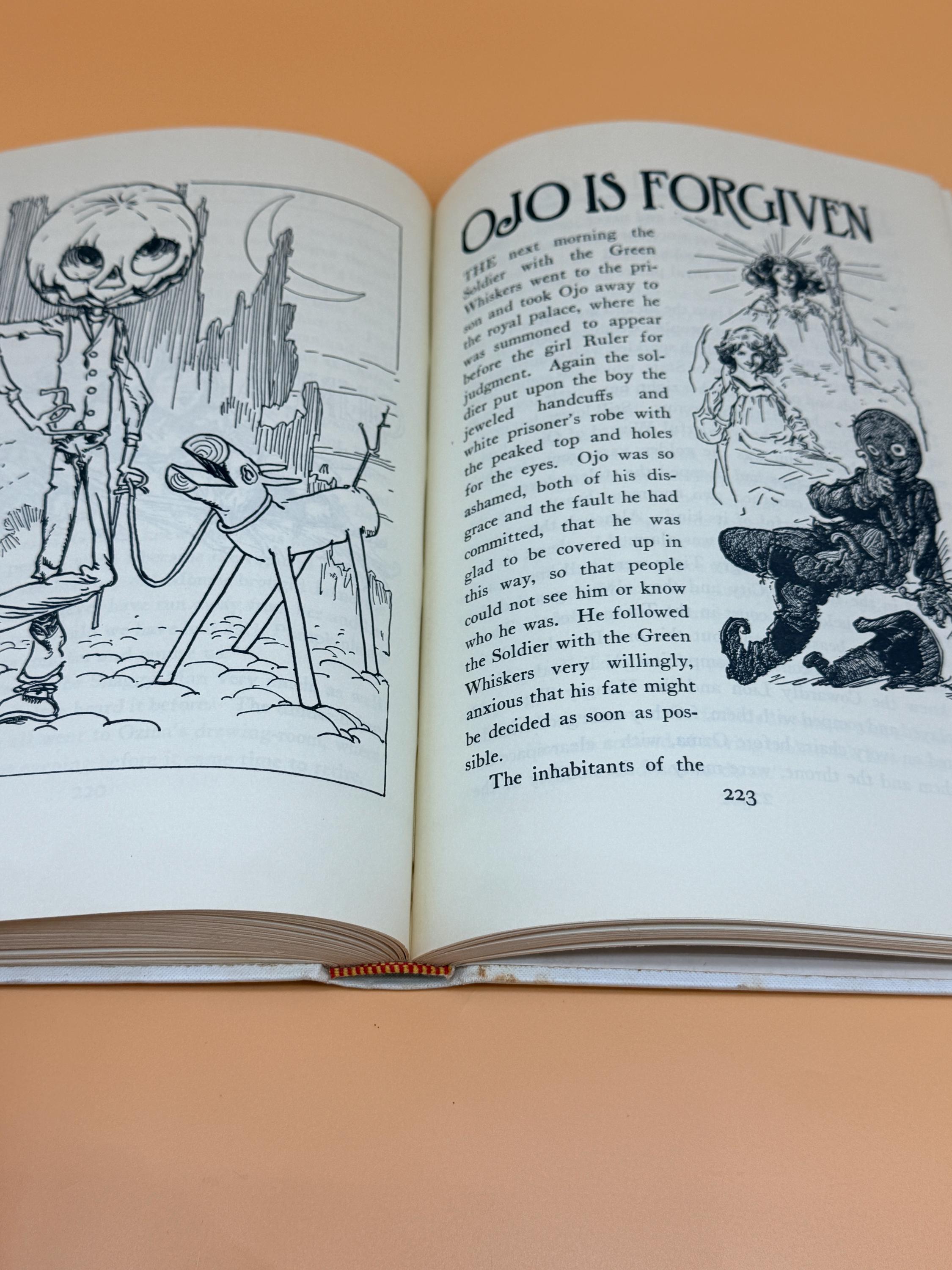 This is a very good hardcover, one of the White Spine editions, with minor caveats. See continued description for White Spine Oz books history. This copy is very good inside and out BUT there is foxing to hardcover boards as shown in photos. The inside pages are very good with the foxing being localized to outside boards. This can occur as the boards are exposed to variations in humidity and general exposure to environment. Usually because of poorer quality white paper with no acid neutral qualities. The inside pages of this copy are actually very good and clean. The binding is tight and straight. Medium octavo book size or 7" x 9".