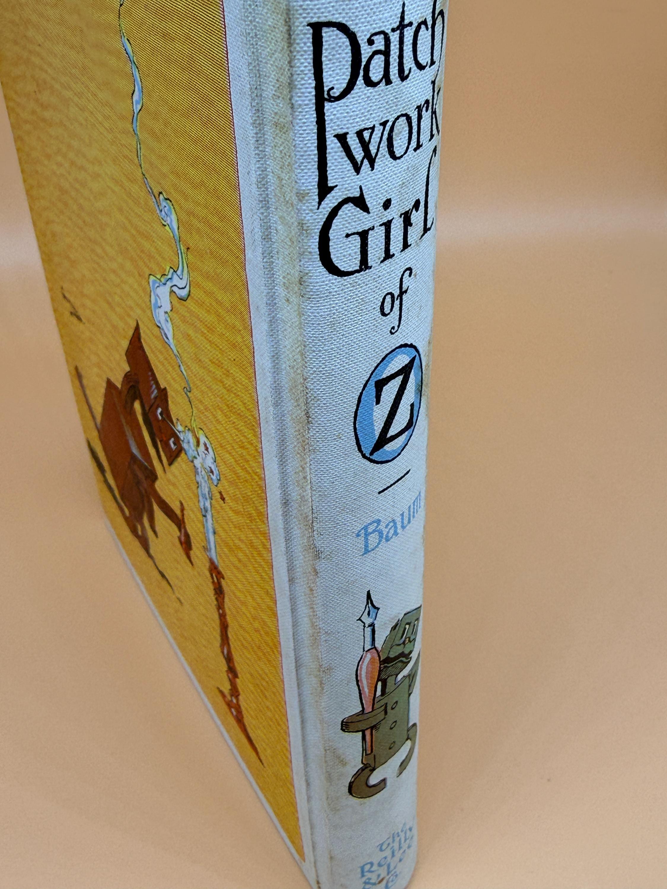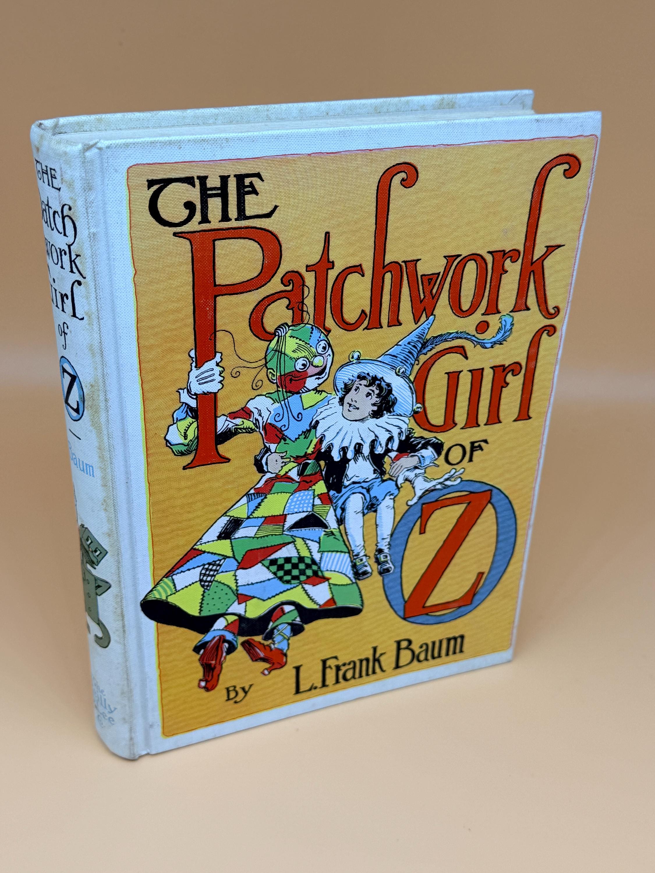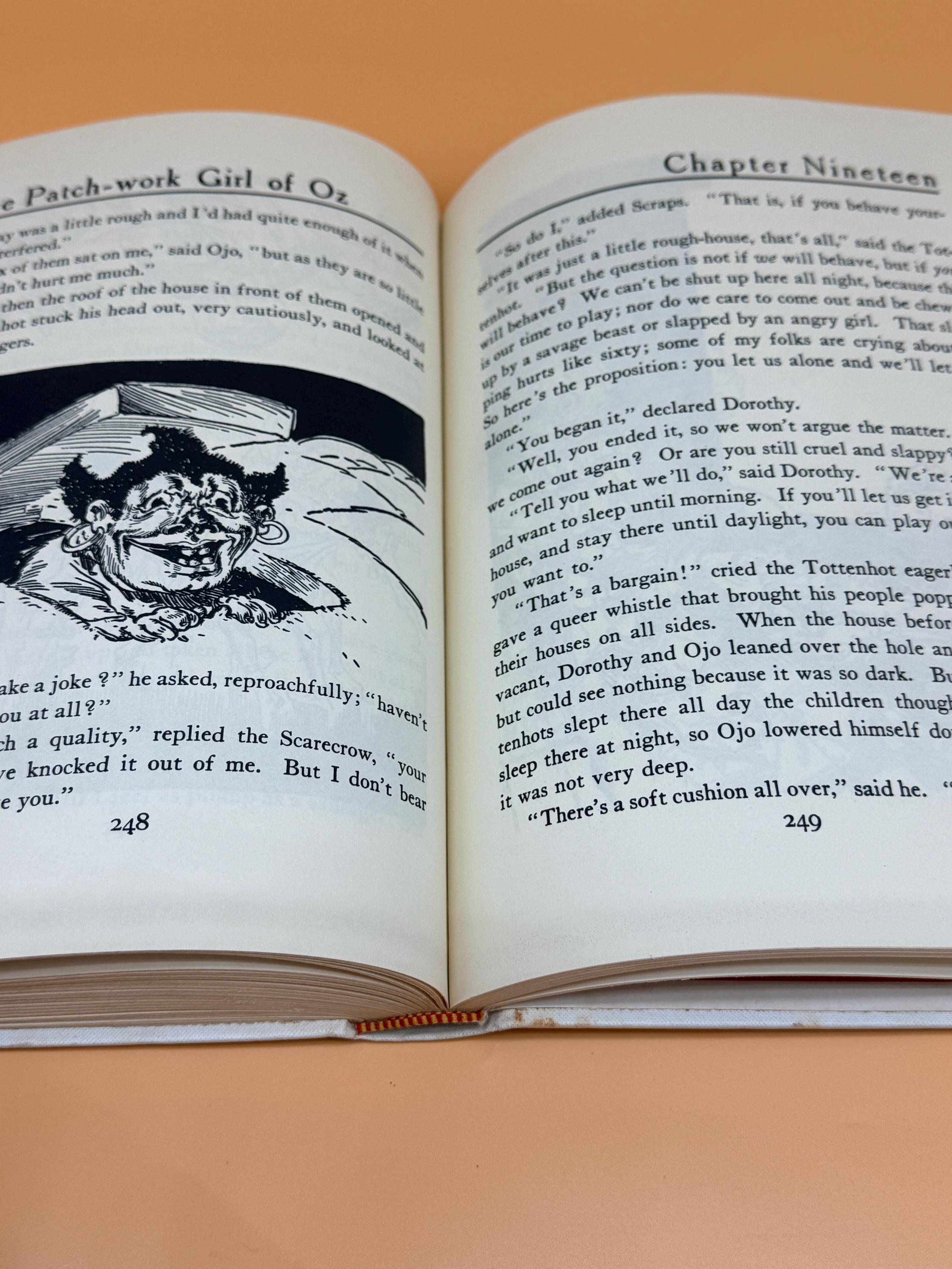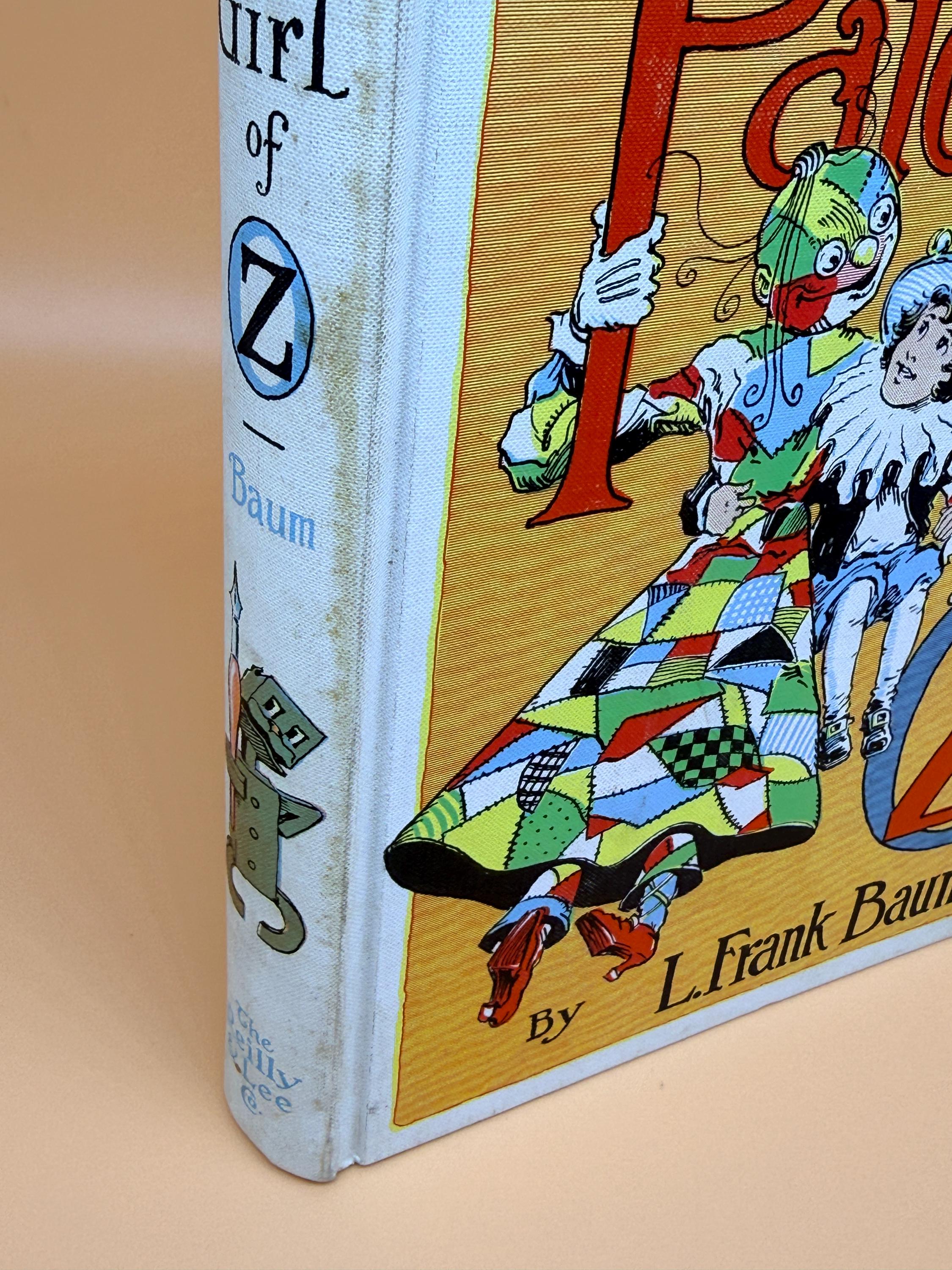This is a very good hardcover, one of the White Spine editions, with minor caveats. See continued description for White Spine Oz books history. This copy is very good inside and out BUT there is foxing to hardcover boards as shown in photos. The inside pages are very good with the foxing being localized to outside boards. This can occur as the boards are exposed to variations in humidity and general exposure to environment. Usually because of poorer quality white paper with no acid neutral qualities. The inside pages of this copy are actually very good and clean. The binding is tight and straight. Medium octavo book size or 7" x 9".