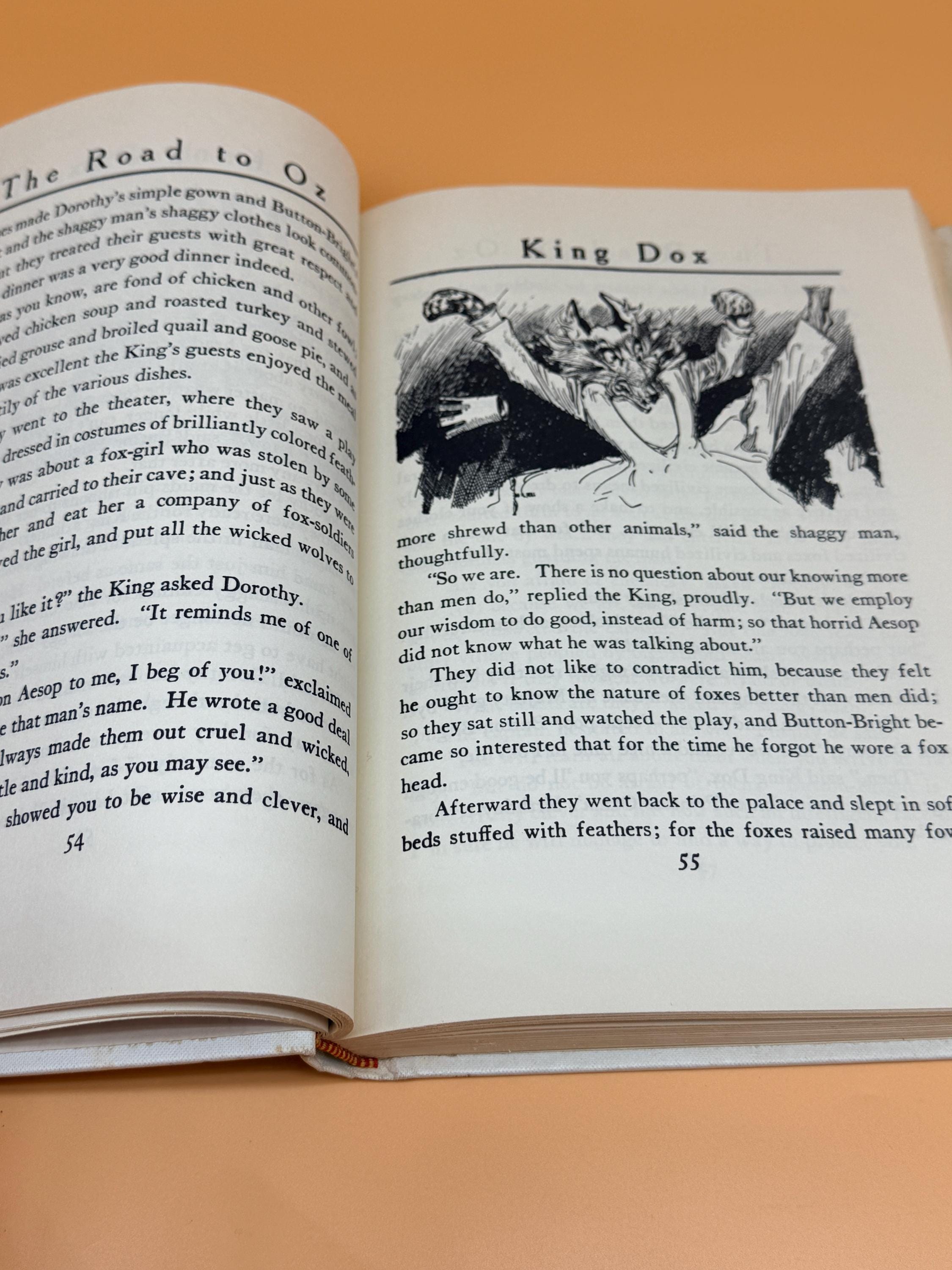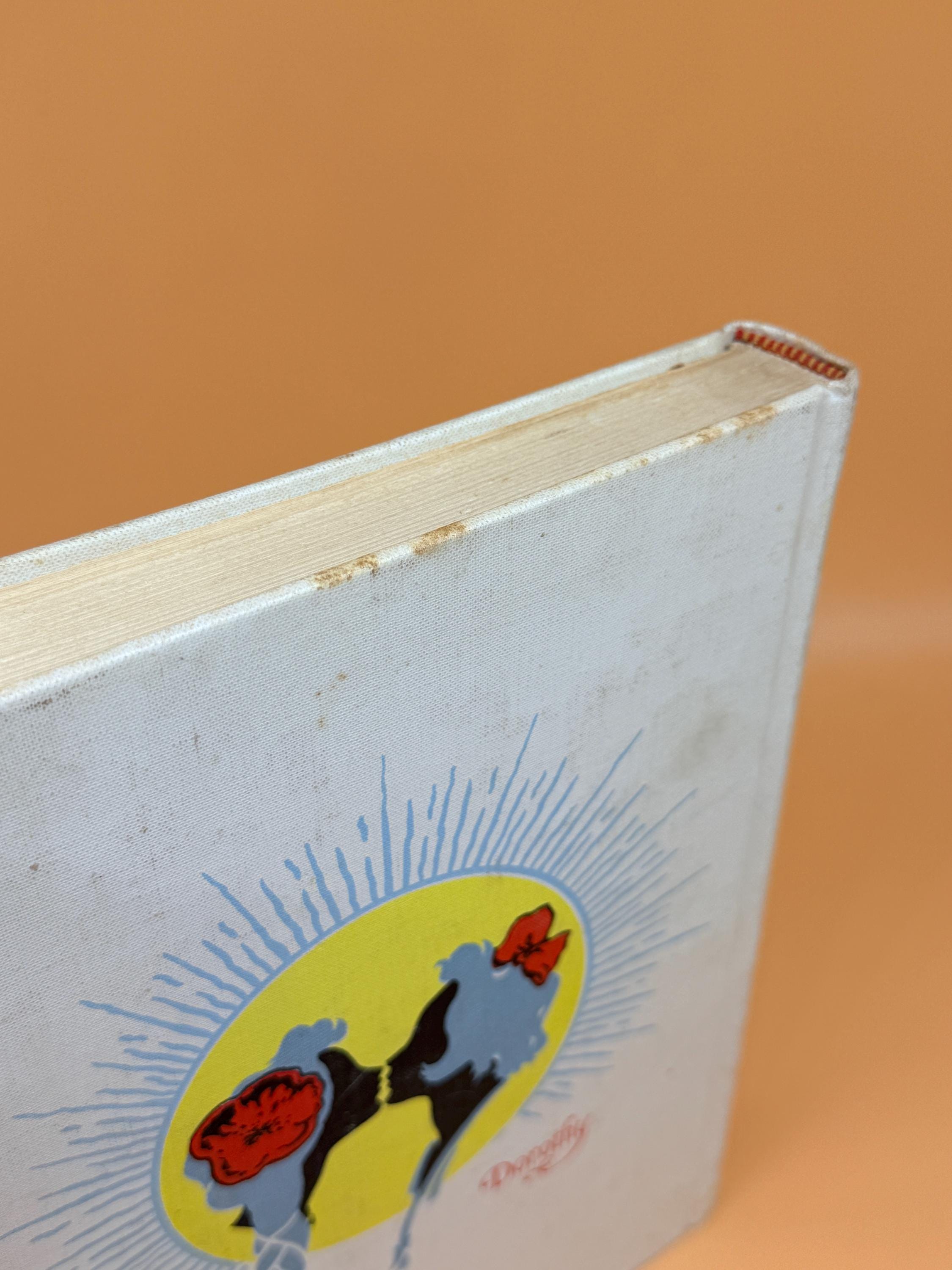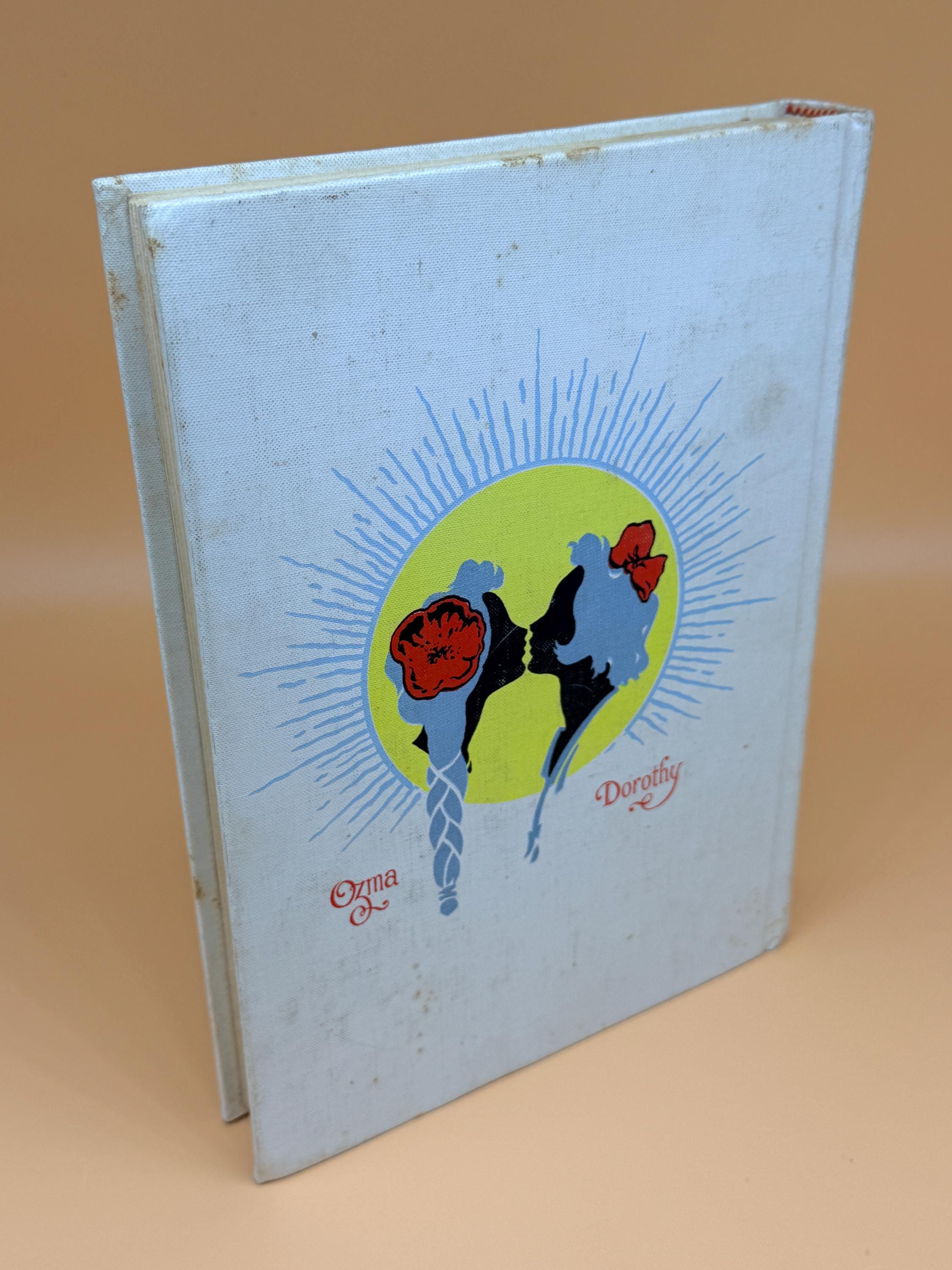 This is a very good hardcover, one of the White Spine editions, with minor caveats. See continued description for White Spine Oz books history. This copy is very good inside and out BUT there is foxing to hardcover boards as shown in photos. The inside pages are very good with the foxing being localized to outside boards. This can occur as the boards are exposed to variations in humidity and general exposure to environment. Usually because of poorer quality white paper with no acid neutral qualities. The inside pages of this copy are actually very good and clean. NOTE: on "This book belongs to" page, previous owners name neatly written in the block. Rest of pages very clean. The binding is tight and straight. Medium octavo book size or 7" x 9".