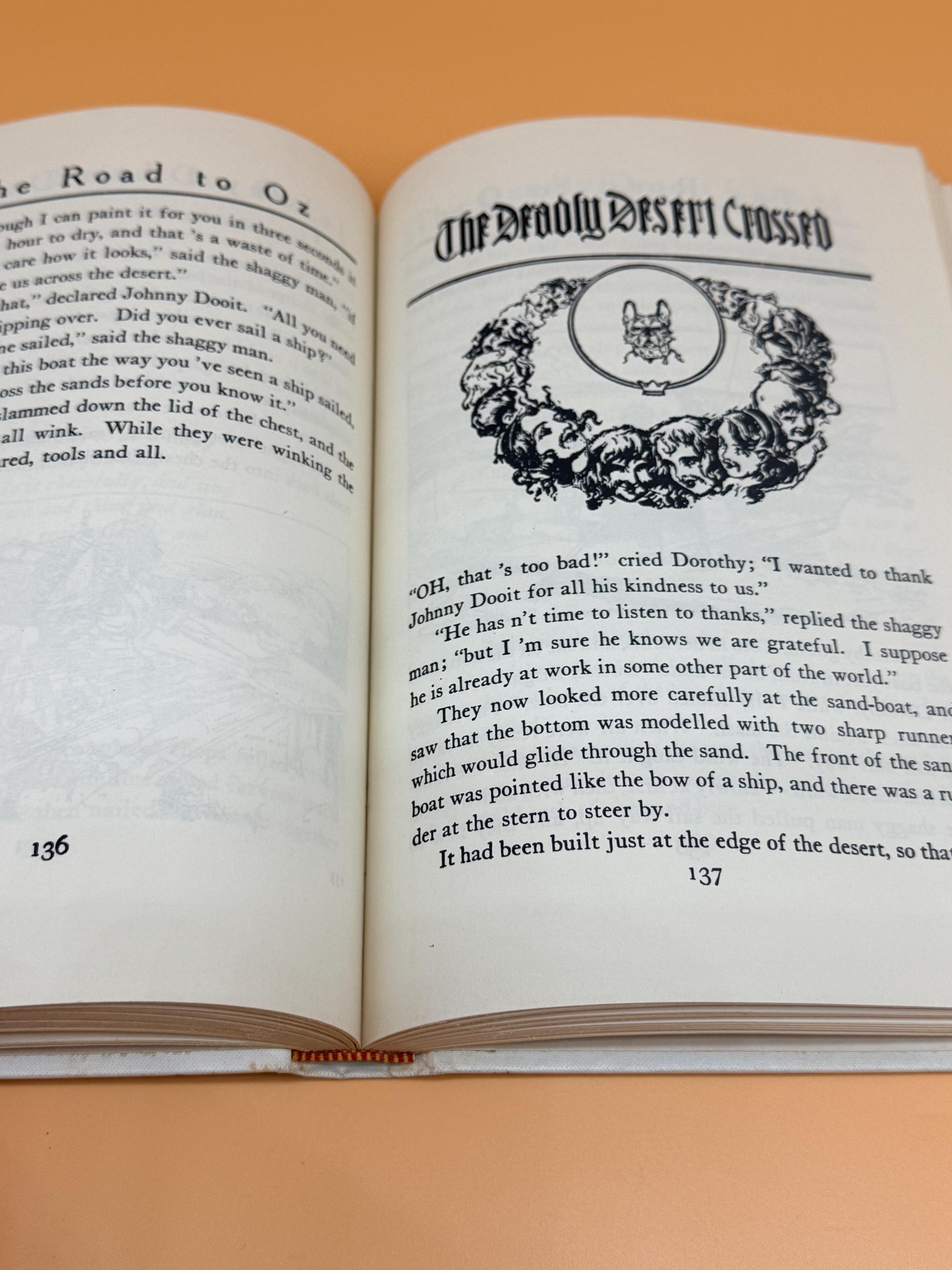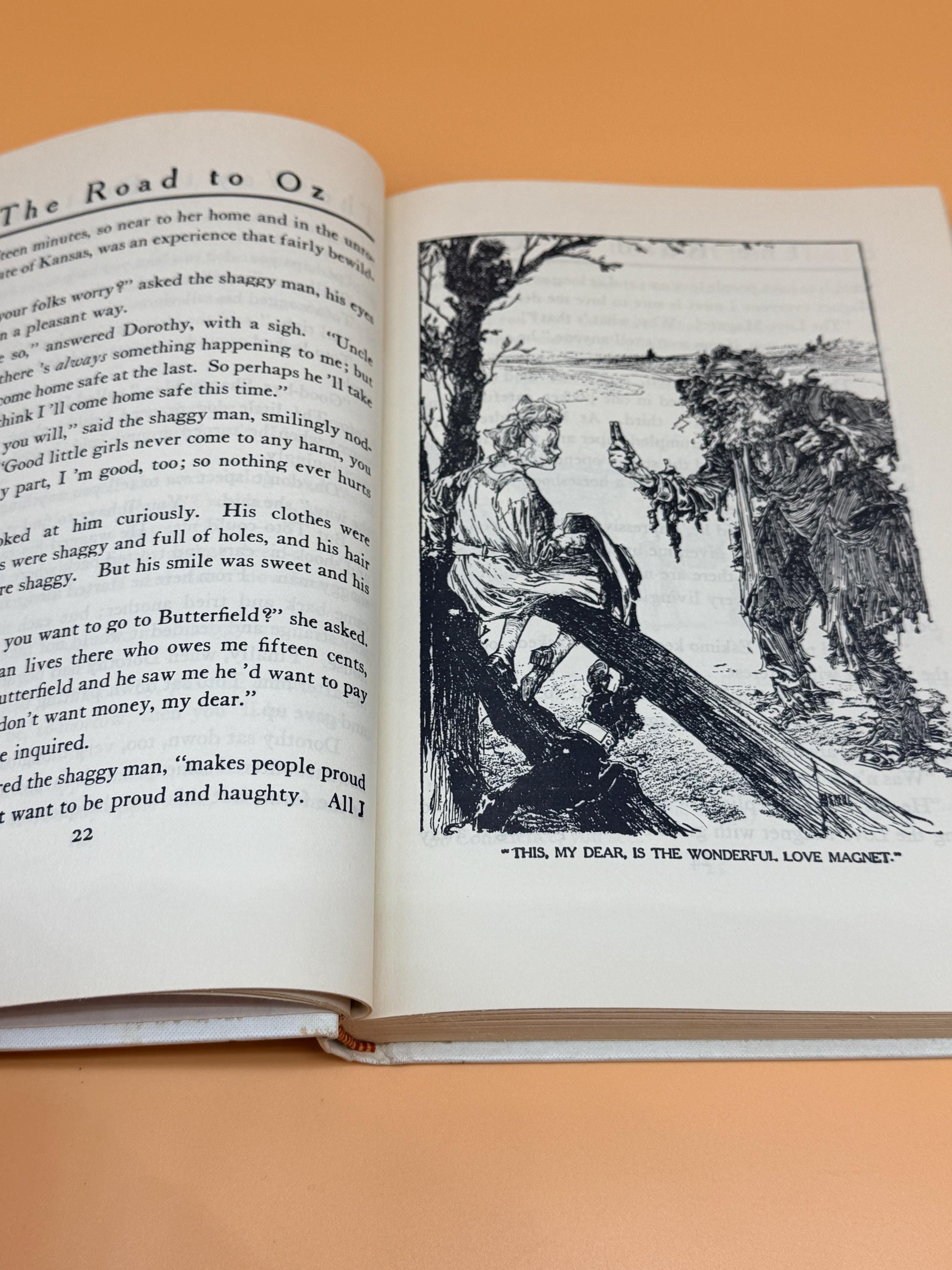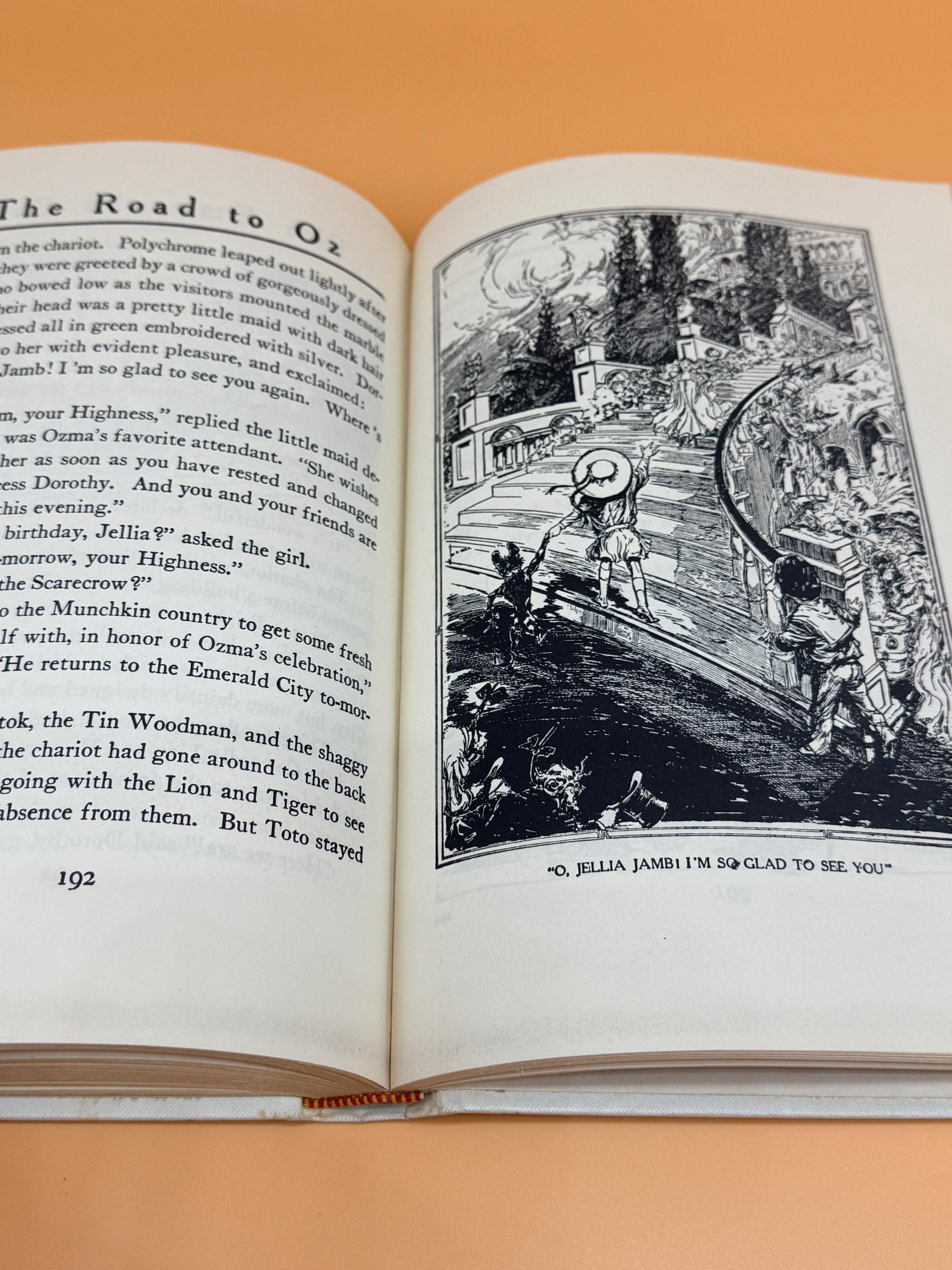 This is a very good hardcover, one of the White Spine editions, with minor caveats. See continued description for White Spine Oz books history. This copy is very good inside and out BUT there is foxing to hardcover boards as shown in photos. The inside pages are very good with the foxing being localized to outside boards. This can occur as the boards are exposed to variations in humidity and general exposure to environment. Usually because of poorer quality white paper with no acid neutral qualities. The inside pages of this copy are actually very good and clean. NOTE: on "This book belongs to" page, previous owners name neatly written in the block. Rest of pages very clean. The binding is tight and straight. Medium octavo book size or 7" x 9".