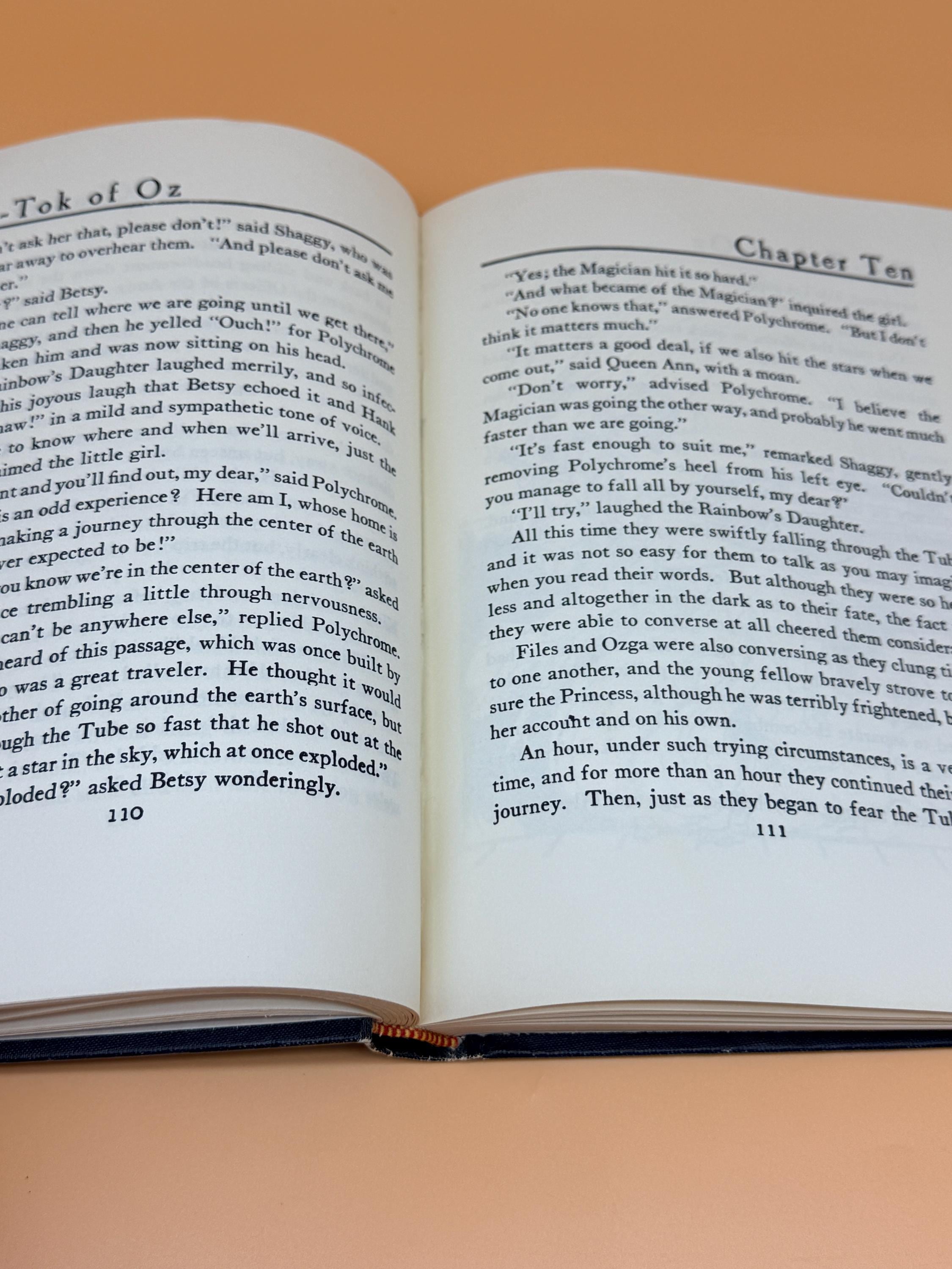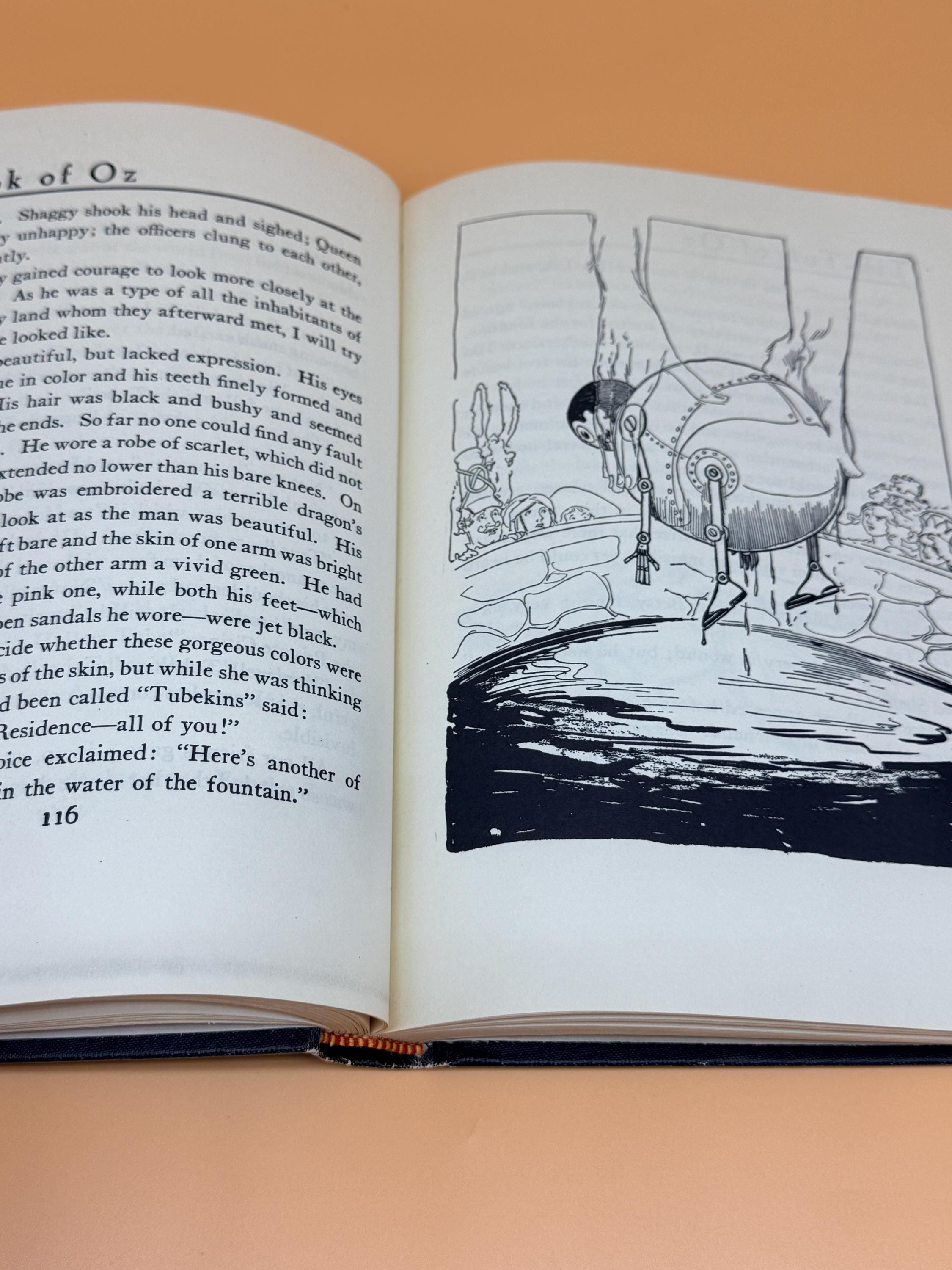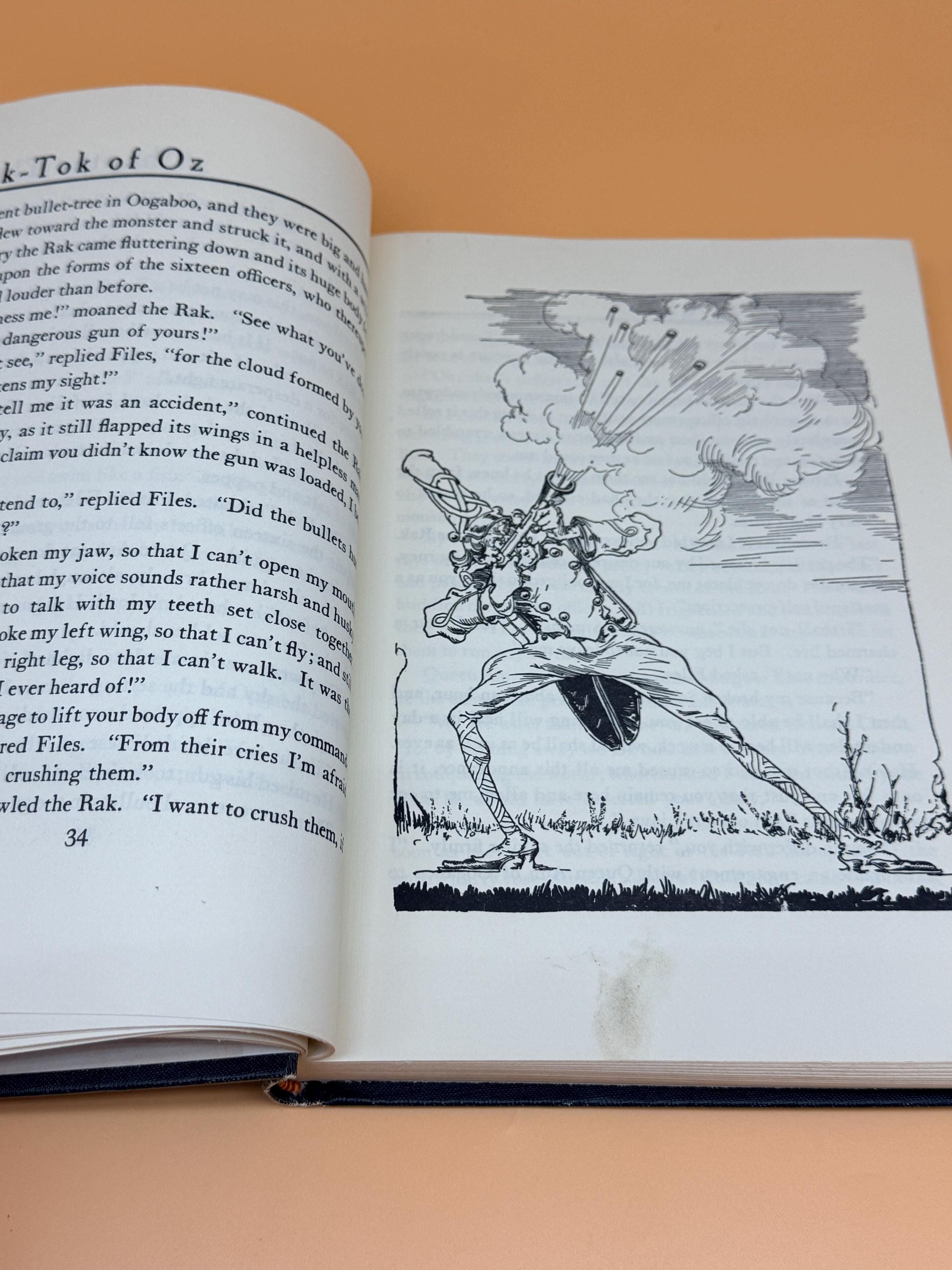 This is a very good hardcover, one of the White Spine editions, with minor caveats. See continued description for White Spine Oz books history. This copy is very good inside and out BUT there is foxing to hardcover boards as shown in photos. The inside pages are very good with the foxing being localized to outside boards. This can occur as the boards are exposed to variations in humidity and general exposure to environment. Usually because of poorer quality white paper with no acid neutral qualities. The inside pages of this copy are actually very good and clean. The binding is tight and straight. Medium octavo book size or 7" x 9".