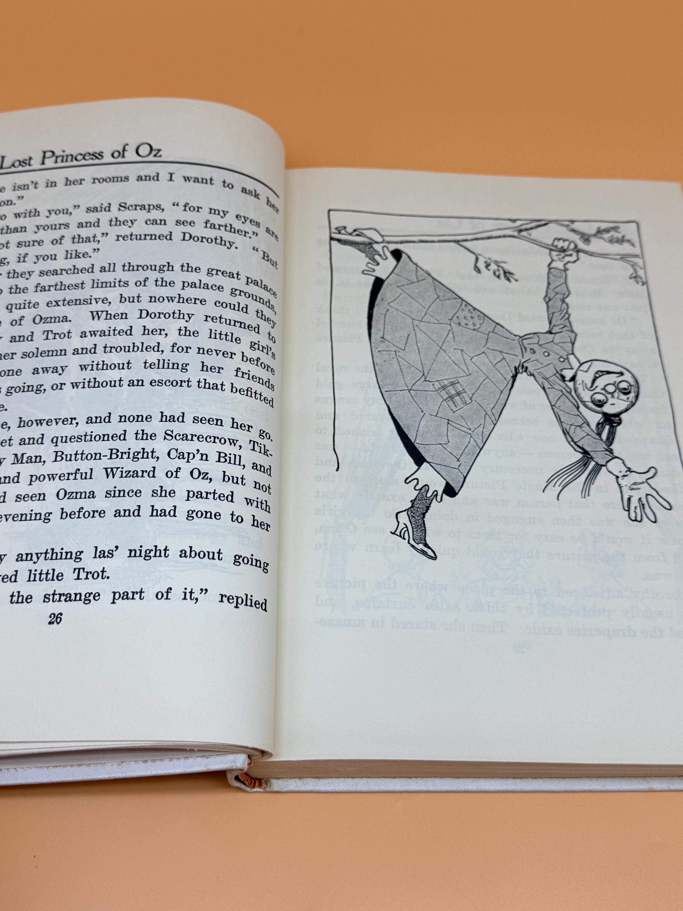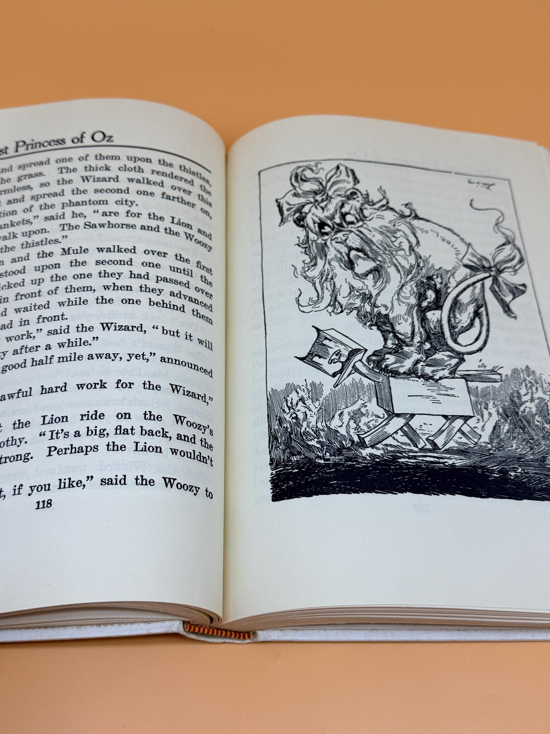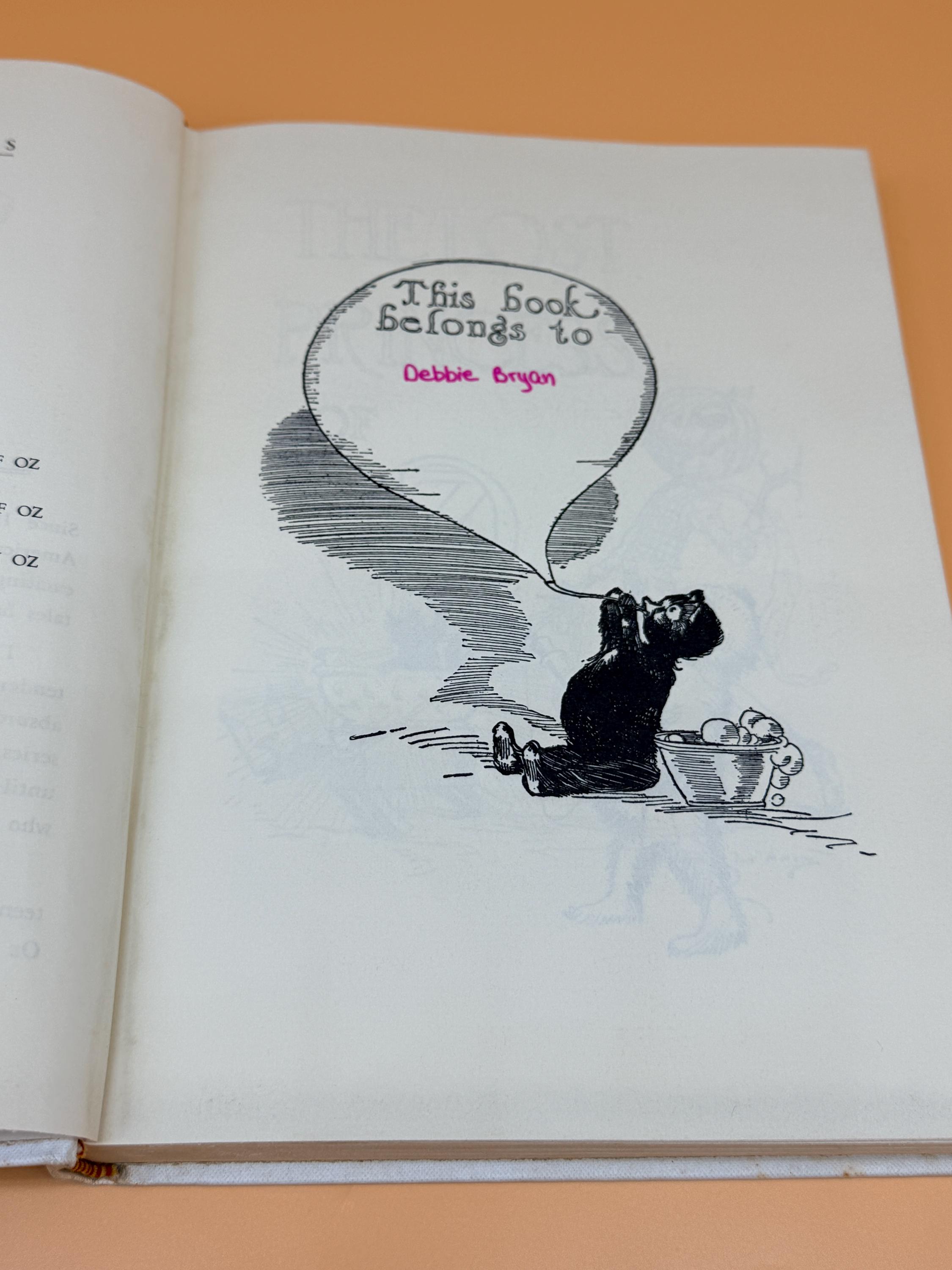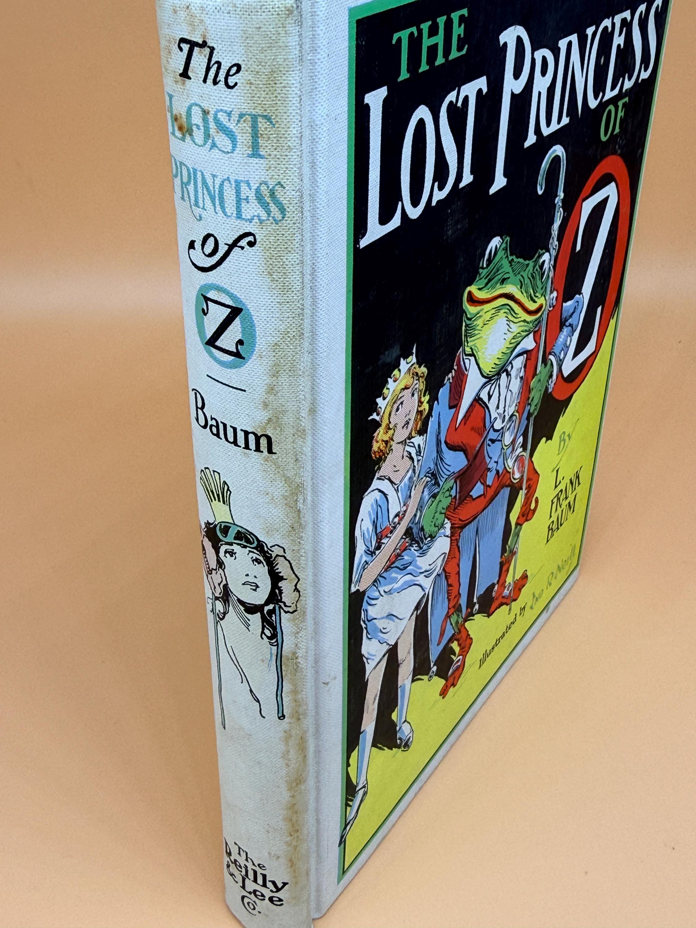 This is a very good hardcover, one of the White Spine editions, with minor caveats. See continued description for White Spine Oz books history. This copy is very good inside and out BUT there is foxing to hardcover boards as shown in photos. The inside pages are very good with the foxing being localized to outside boards. This can occur as the boards are exposed to variations in humidity and general exposure to environment. Usually because of poorer quality white paper with no acid neutral qualities. The inside pages of this copy are actually very good and clean. NOTE: on the "This Book Belongs To" page, previous owners name neatly written in the block. The binding is tight and straight. Medium octavo book size or 7" x 9".