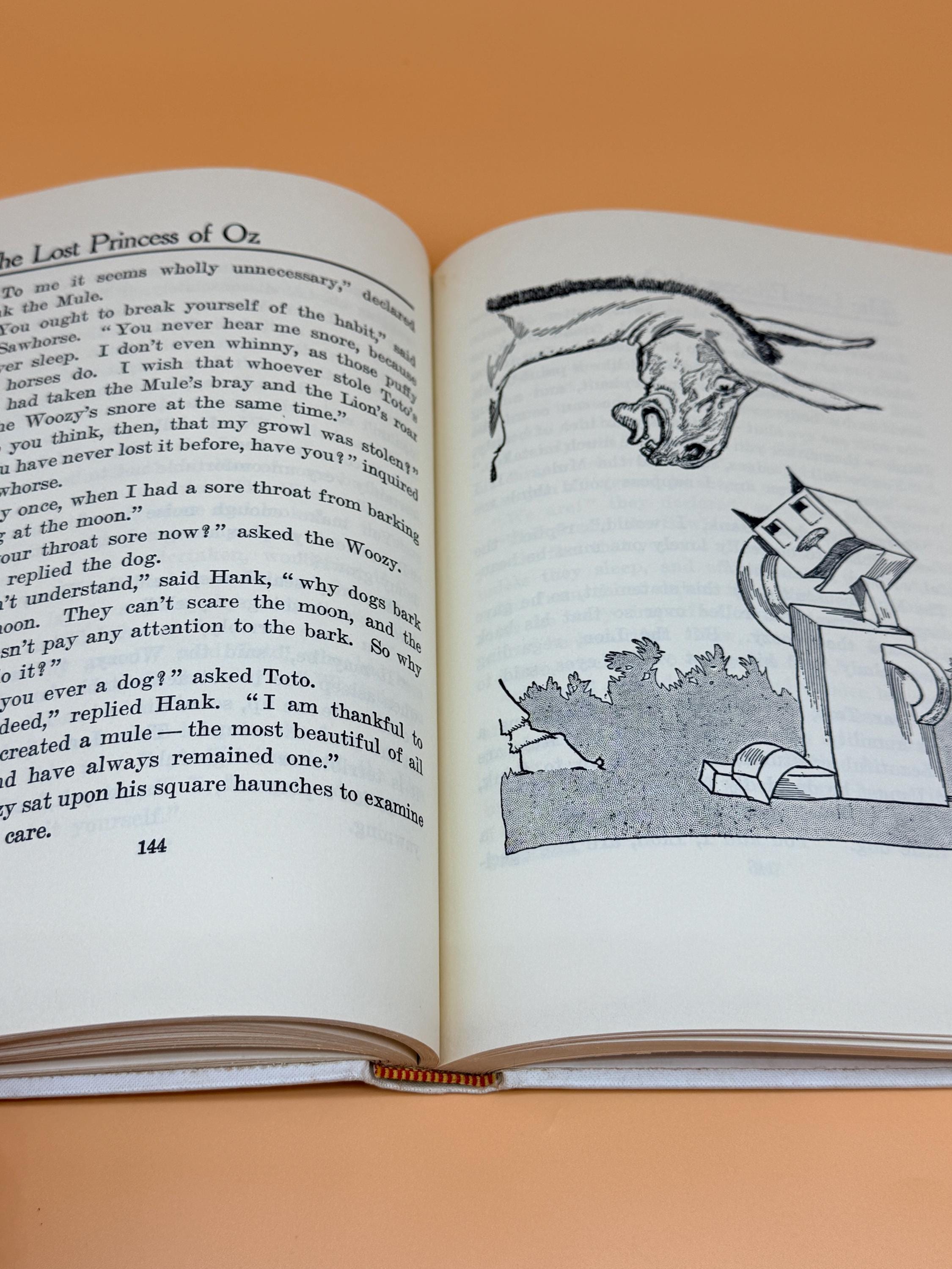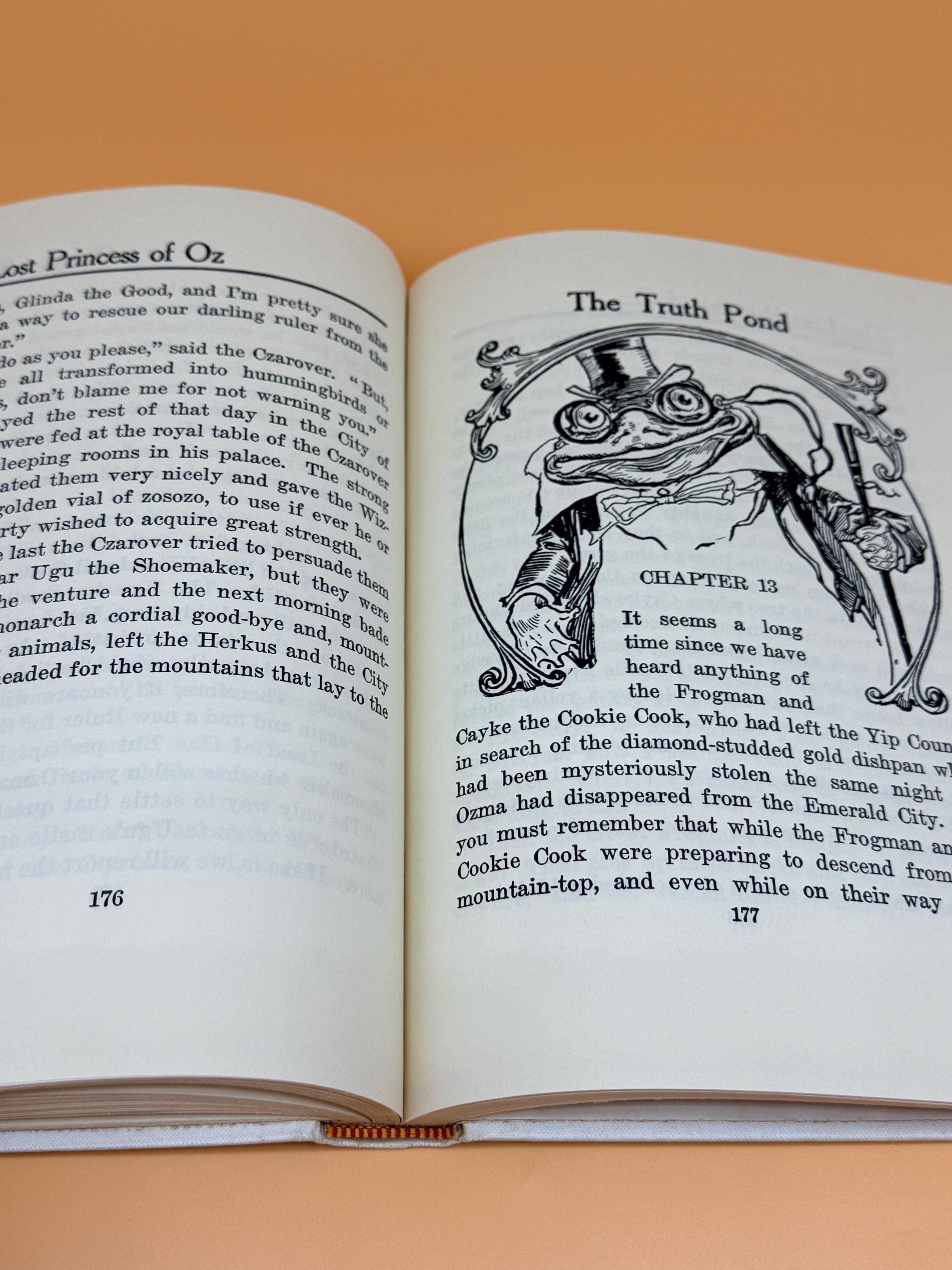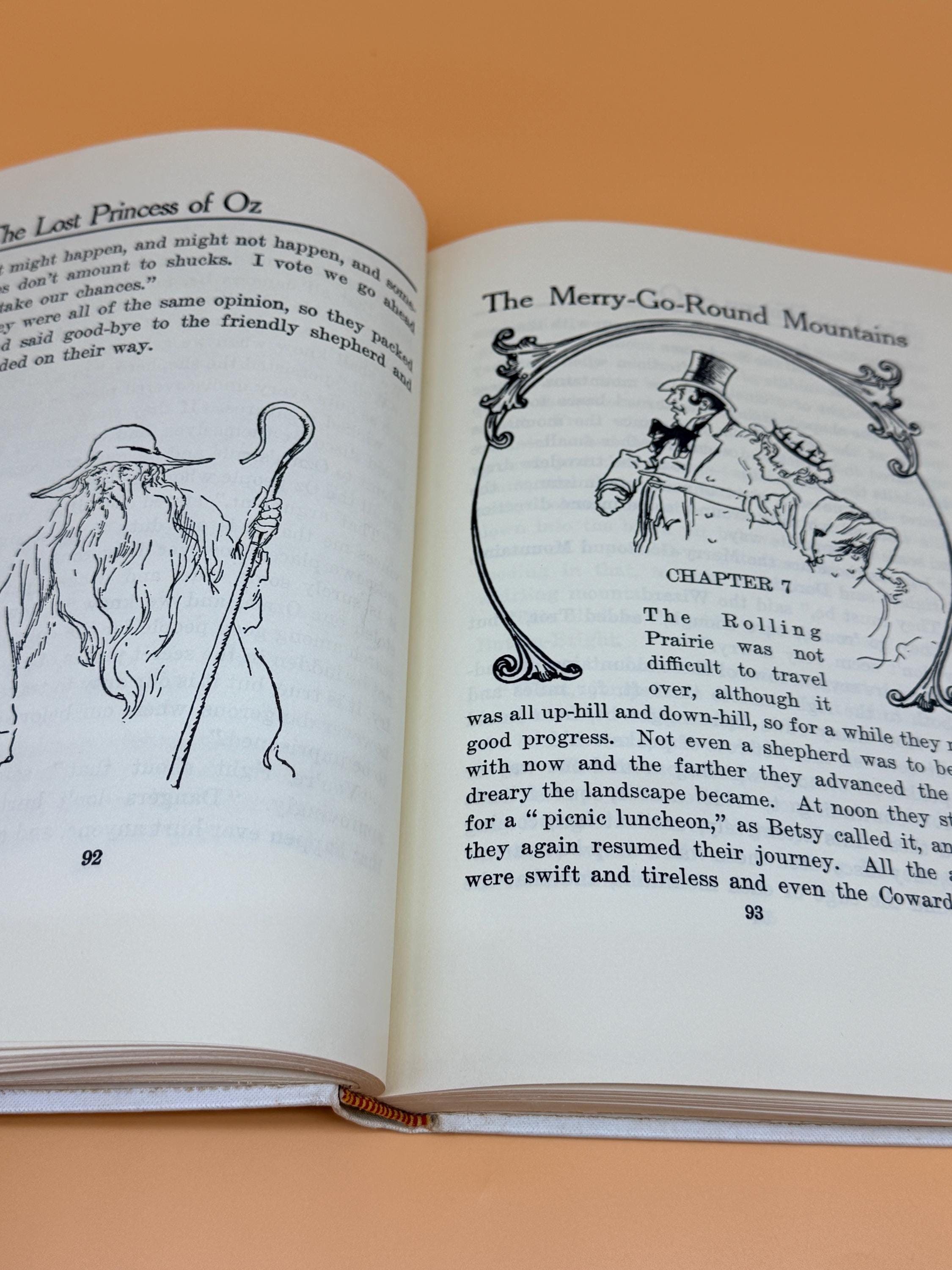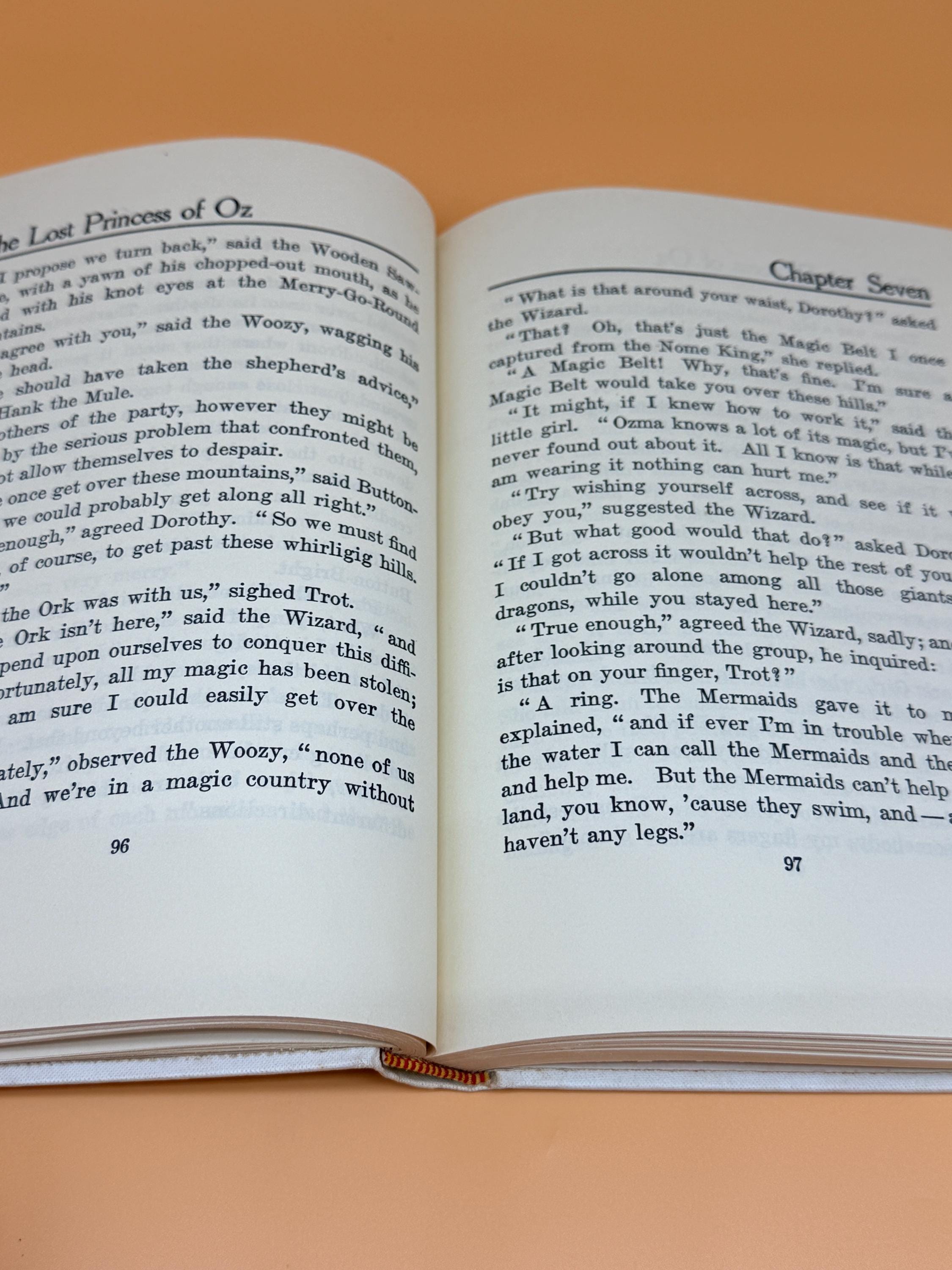 This is a very good hardcover, one of the White Spine editions, with minor caveats. See continued description for White Spine Oz books history. This copy is very good inside and out BUT there is foxing to hardcover boards as shown in photos. The inside pages are very good with the foxing being localized to outside boards. This can occur as the boards are exposed to variations in humidity and general exposure to environment. Usually because of poorer quality white paper with no acid neutral qualities. The inside pages of this copy are actually very good and clean. NOTE: on the "This Book Belongs To" page, previous owners name neatly written in the block. The binding is tight and straight. Medium octavo book size or 7" x 9".