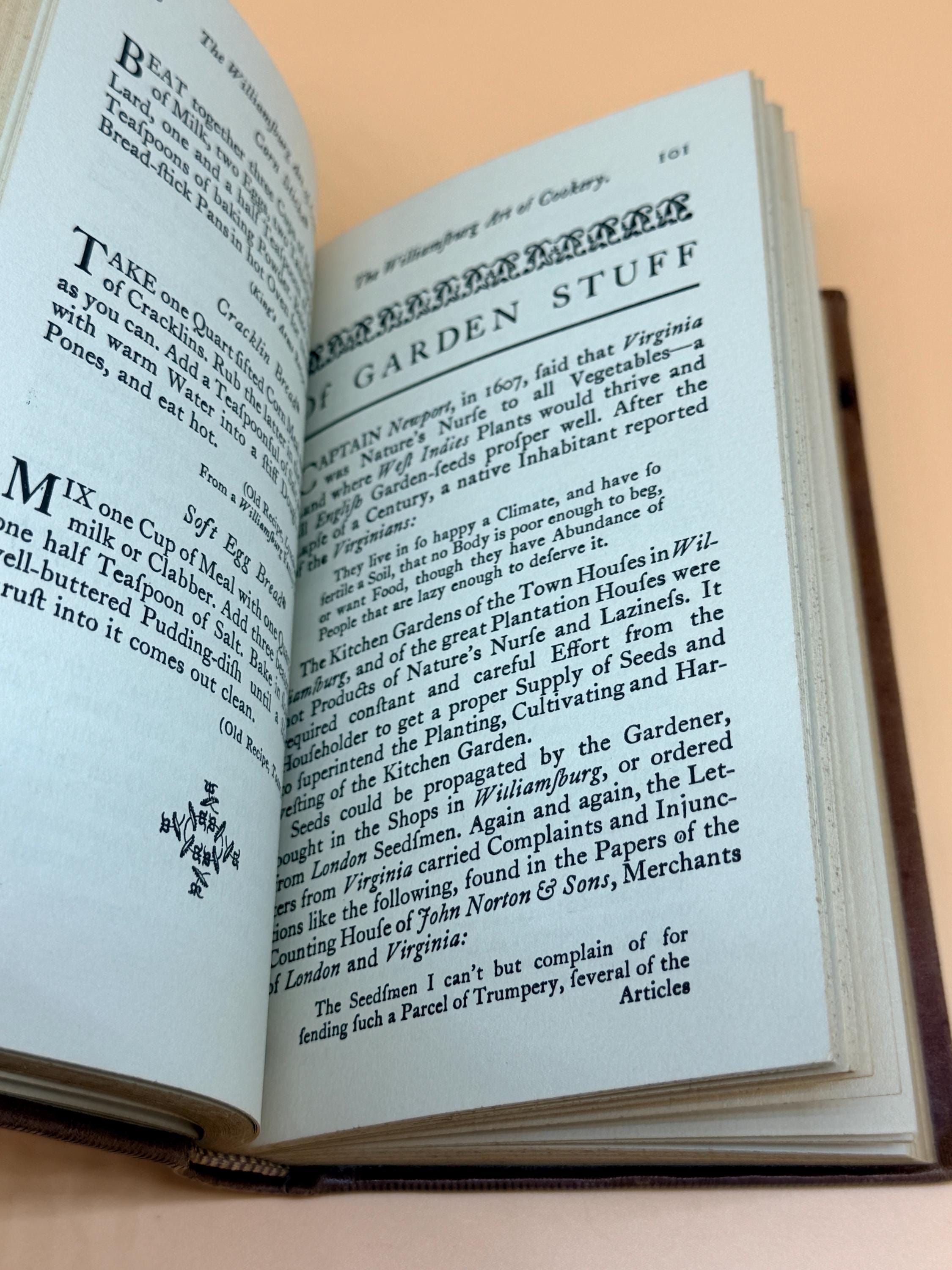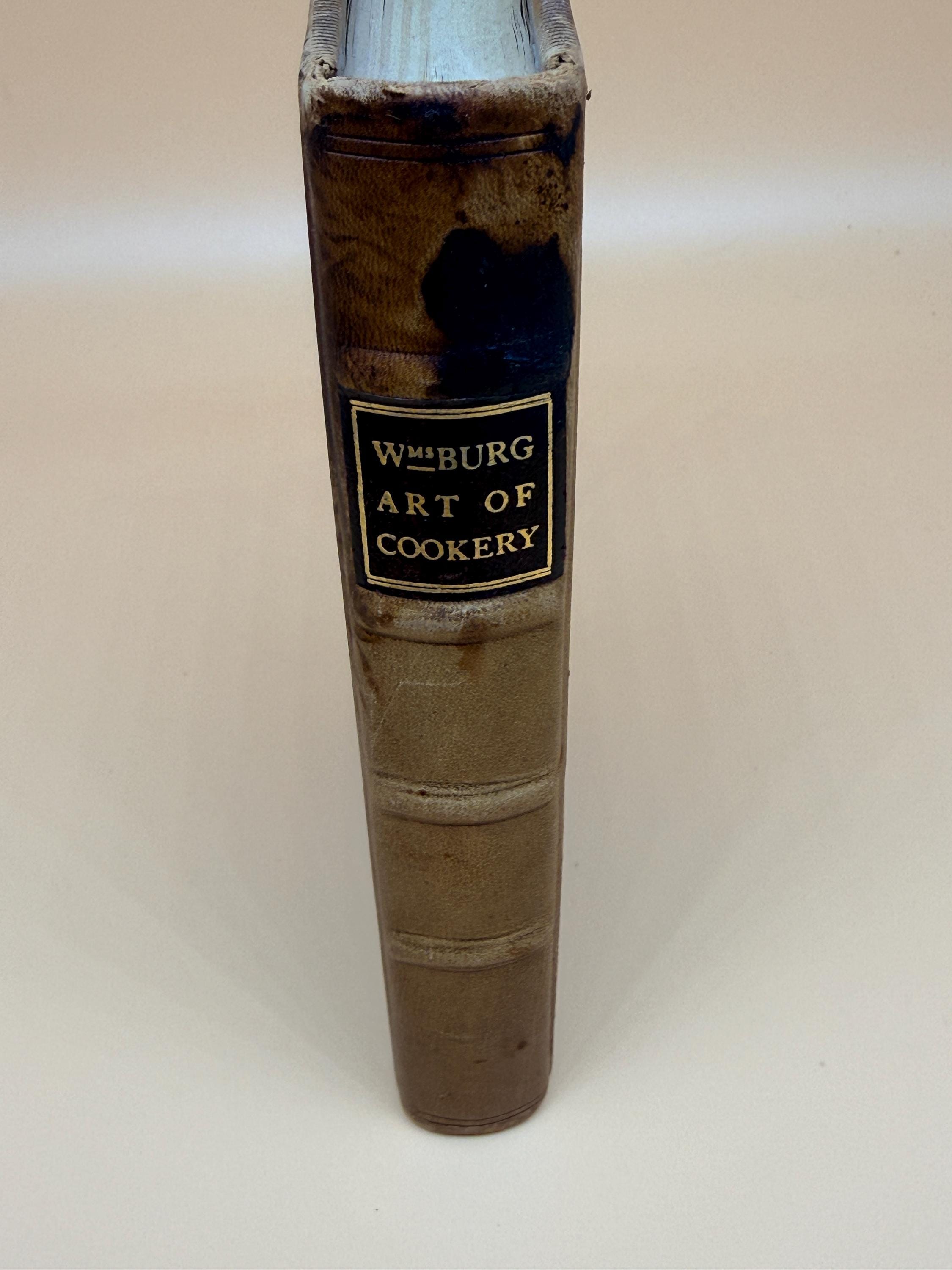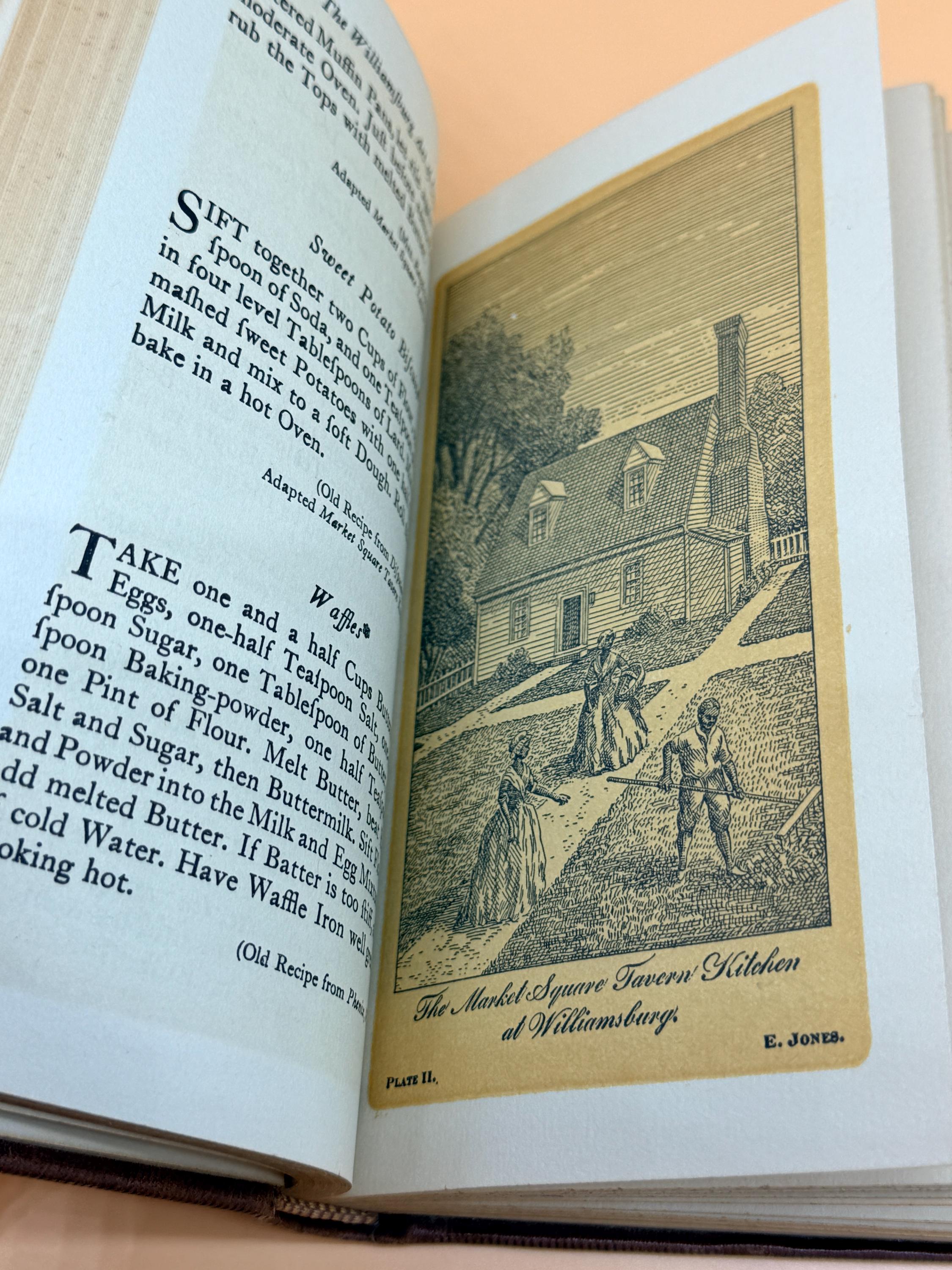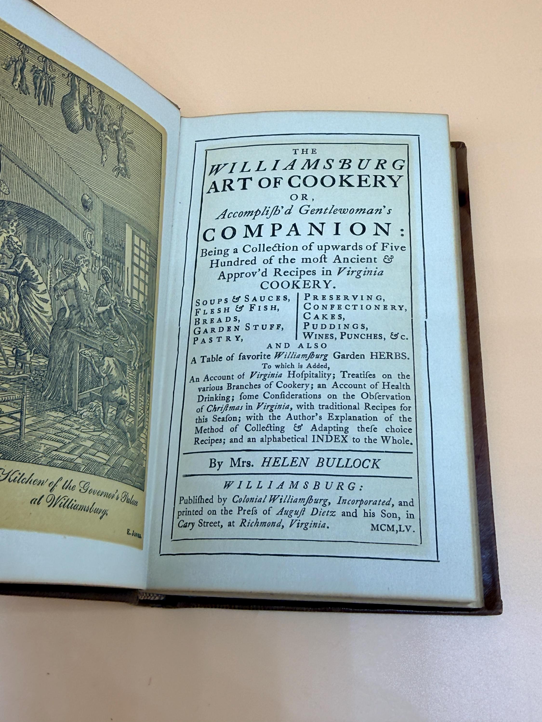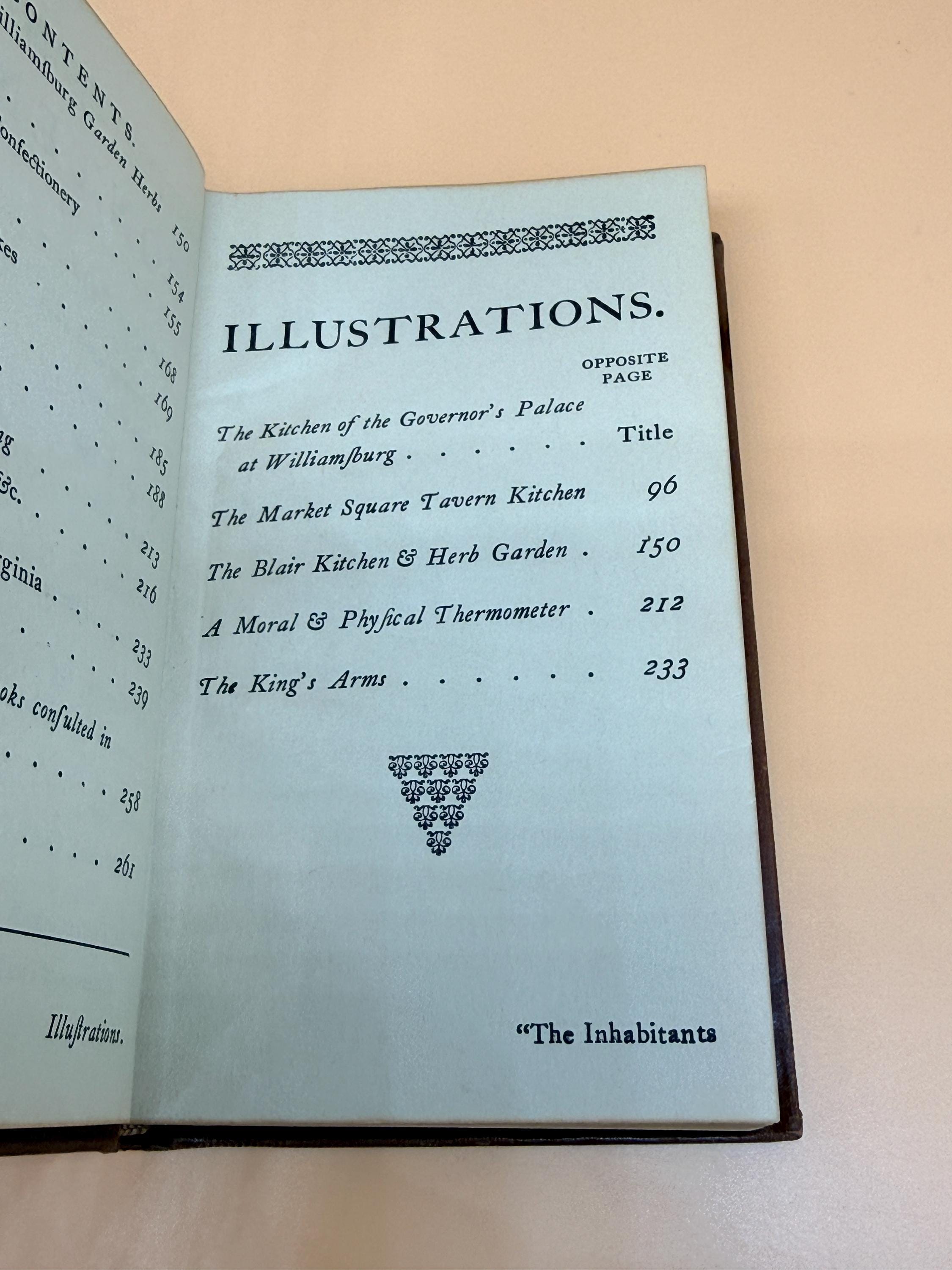 Originally published in 1938, this is the 7th printing of The Williamsburg Art of Cookery, 1955. The book is subtitled "Accomplished Gentlewoman's Companion Being a Collection of the Most Ancient and Approved Recipes in Virginia". Five illustrations highlight historic Virginia scenes. Contents include: Of Virginia Hospitality, Observations Upon Soup, Of Flesh and Fish, Of Bread, Of Garden Stuff, Of Pastry, Of Preserving and Pickling, Favorite Williamsburg Garden Herbs, Confectionary, Of Cakes, Of Desserts, Of Health Drinking, Of Christmas in Virgina, and An Account of Books Consulted in This Work. It is a wonderful historic cookbook and collectible in fine leather binding.
