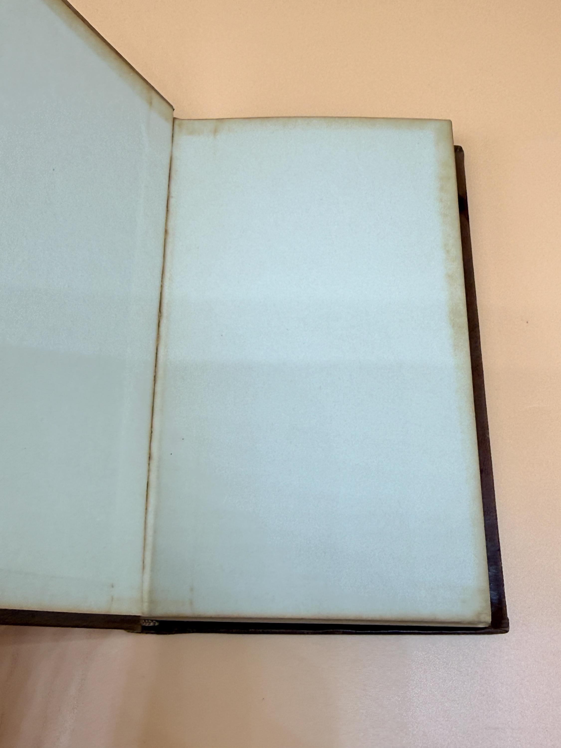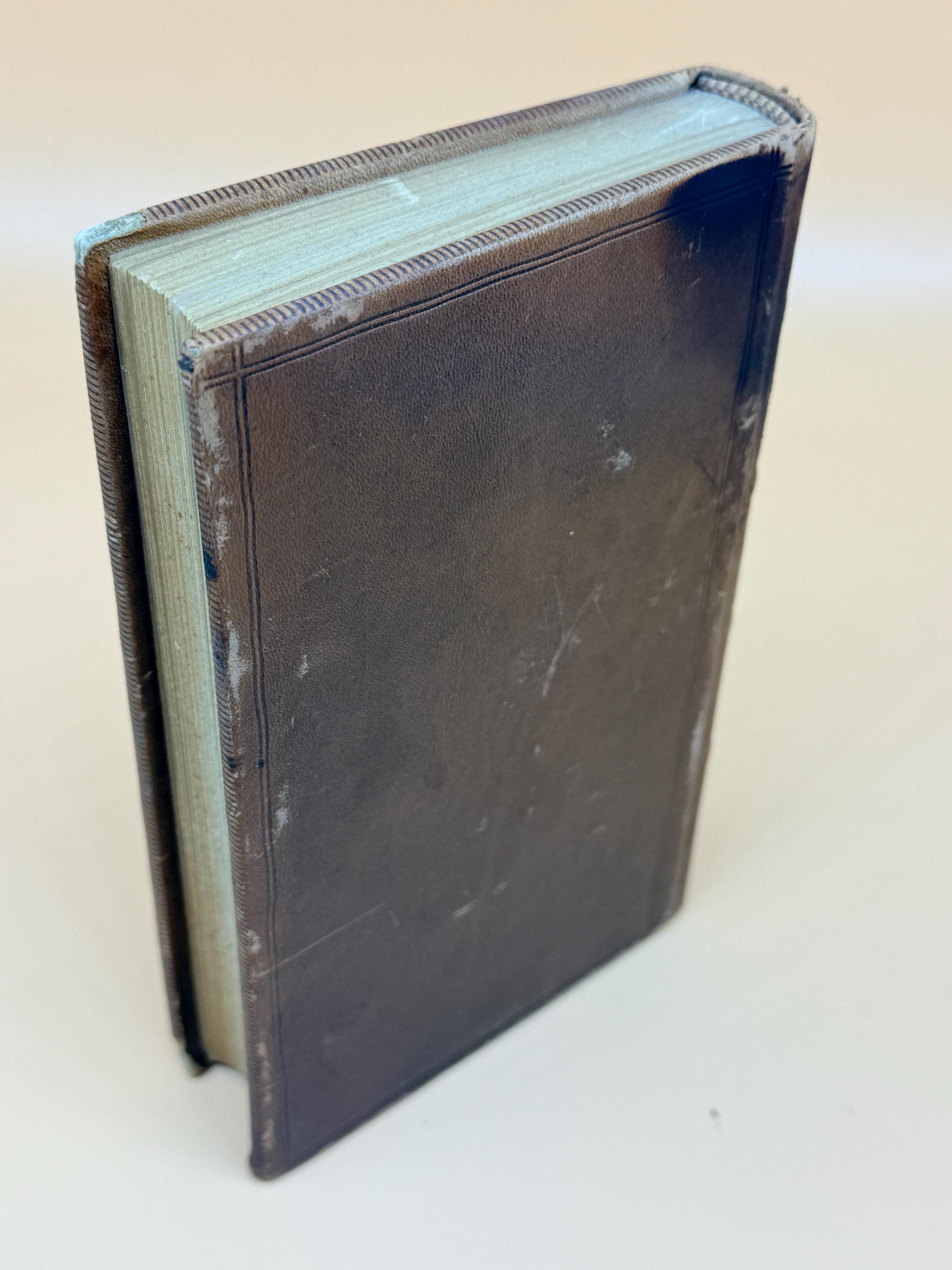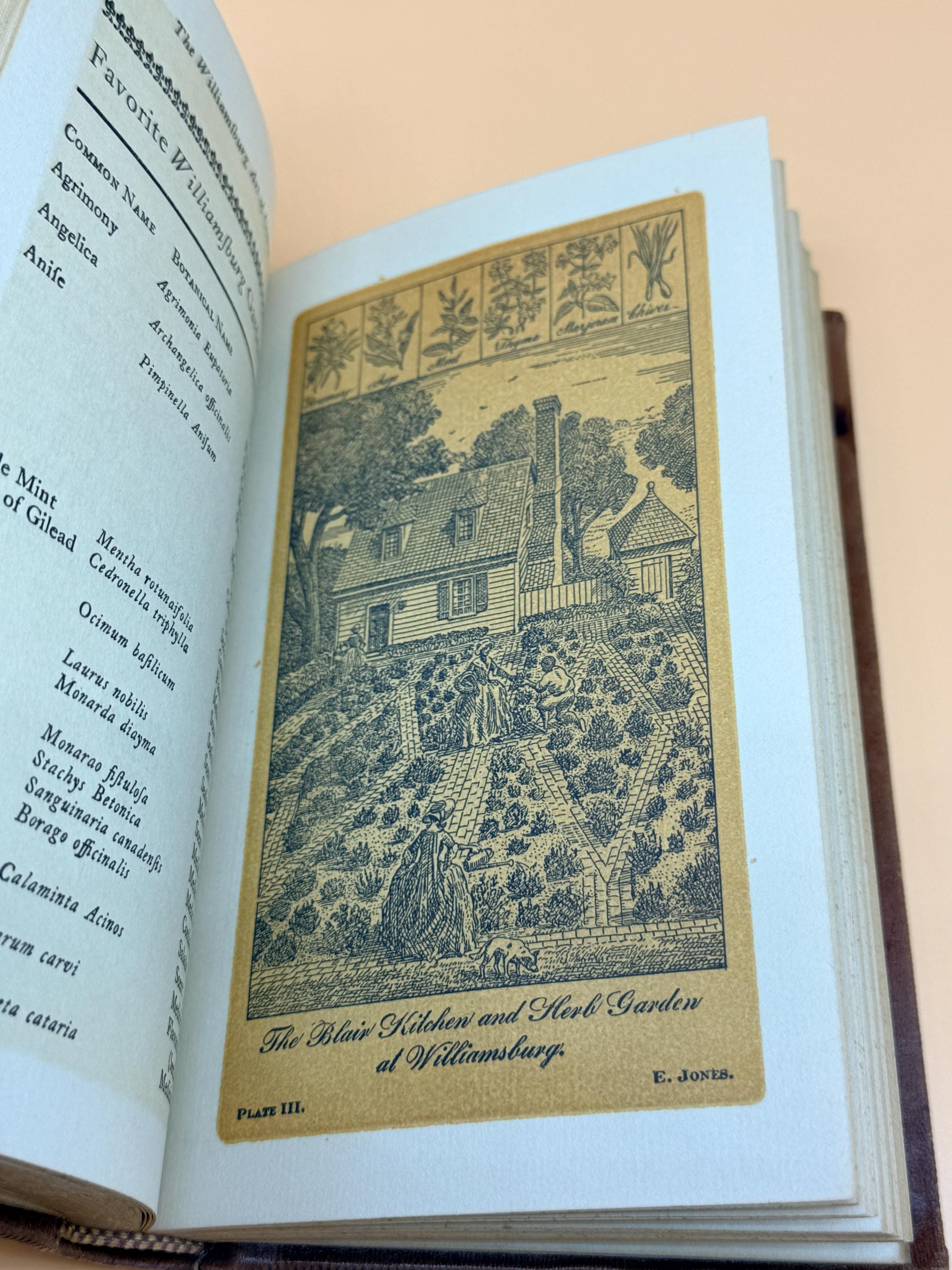This is a very good leather-bound hardcover. 7th Printing 1955 Colonial Williamsburg. This copy is very good inside and out. The inside pages are very good, clean with only very light natural tanning from age. The binding is very tight and straight. Bound in brown leather, the leather hardcover boards are also very good with only light shelf wear and some darkening spots as seen in photos. It is bound with a fine sewn binding for durability and aesthetics and the fine binding is finished off with hubbed spine. Smaller size book, 12mo book size or 5" x 7" with 276 pages.