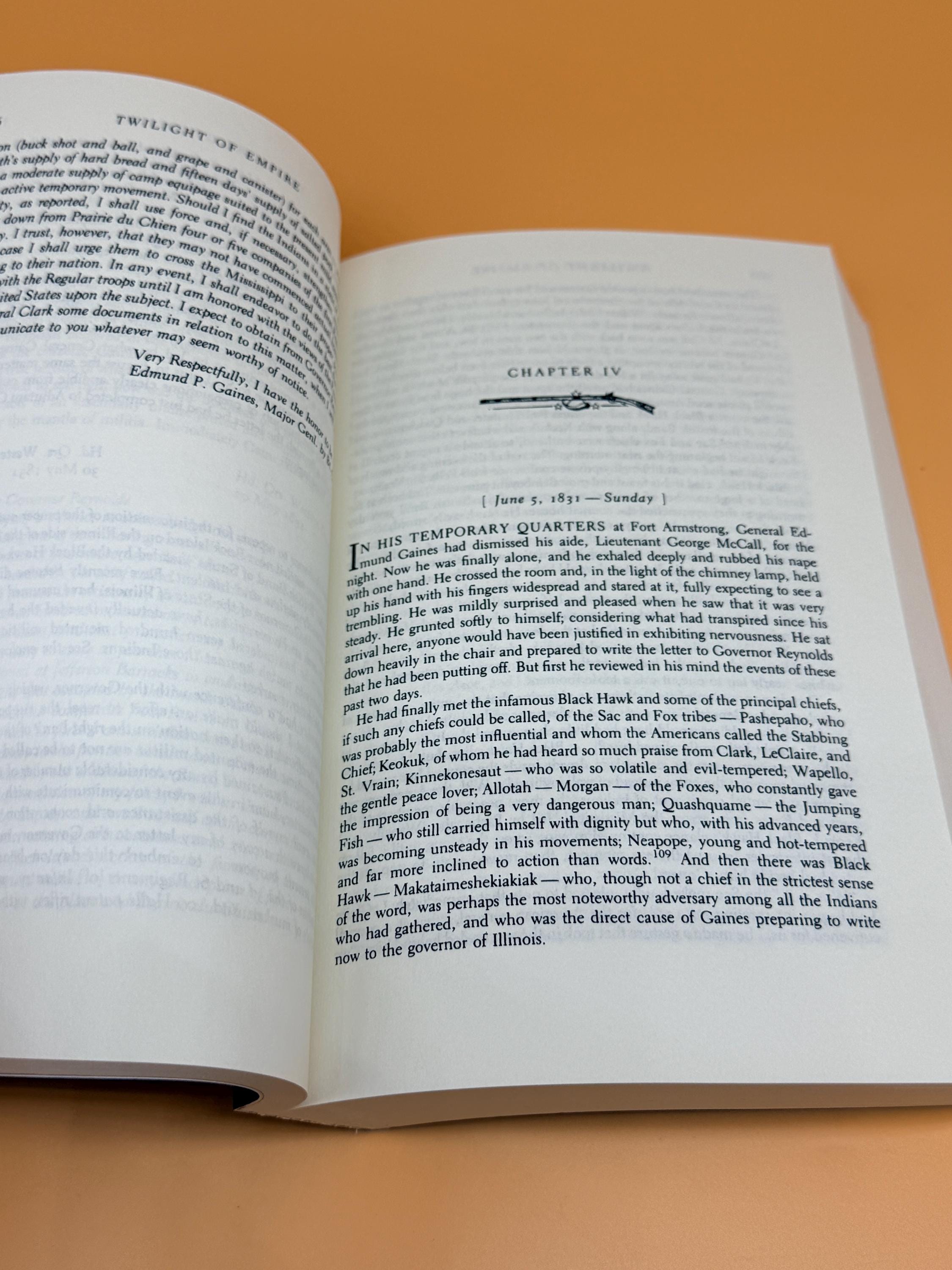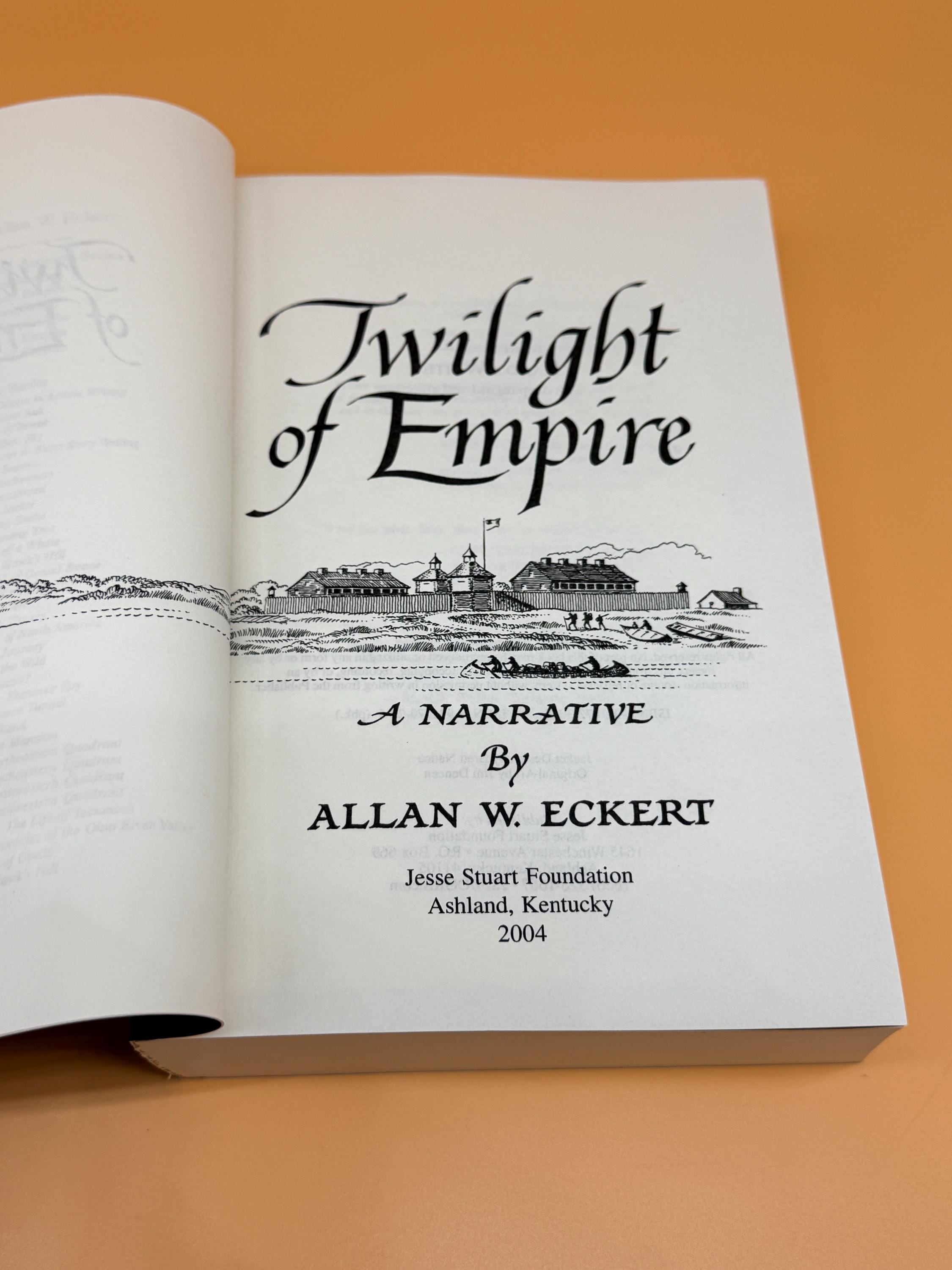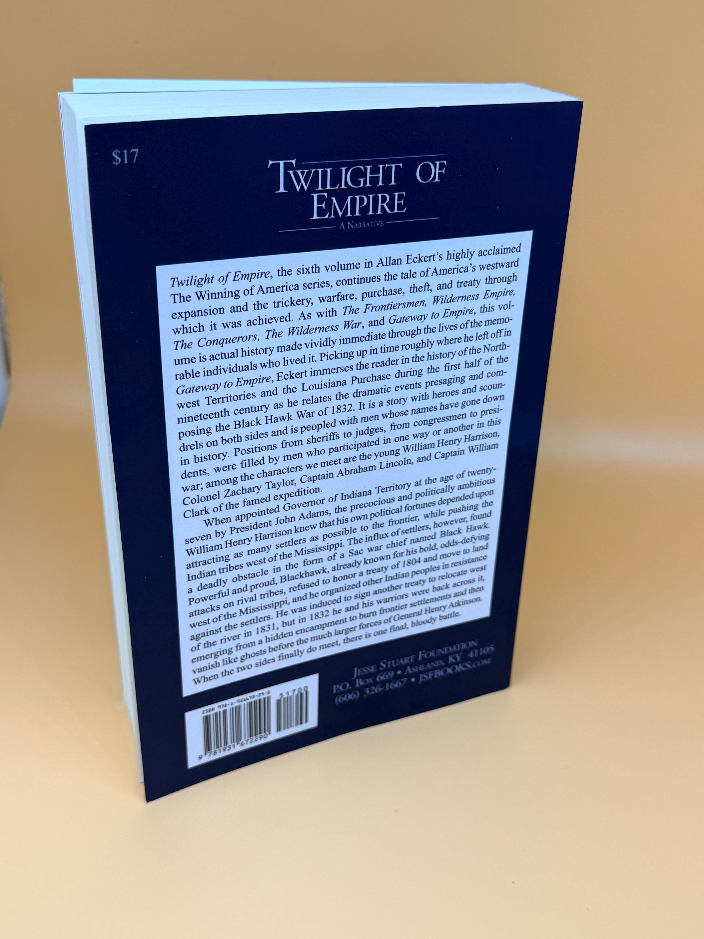 Twilight of Empire a Narrative by Allan Eckert is considered narrative historical fiction or a non-fiction novels. It was meticulously researched and based on real people and events during the Black Hawk War. The book creates dialogue and scenes that create a continuous narrative rather than a strict academic history. It is the sixth book in his acclaimed "The Winning of America" series. It continues the tale of American westward expansion and the warfare, purchases and treaties through which is was achieved. The book picks up where Gateway to Empire left off and takes the readers to the history of the Northwest Territories and The Louisiana Purchase while relating the dramatic events composing the Black Hawk War of 1832.