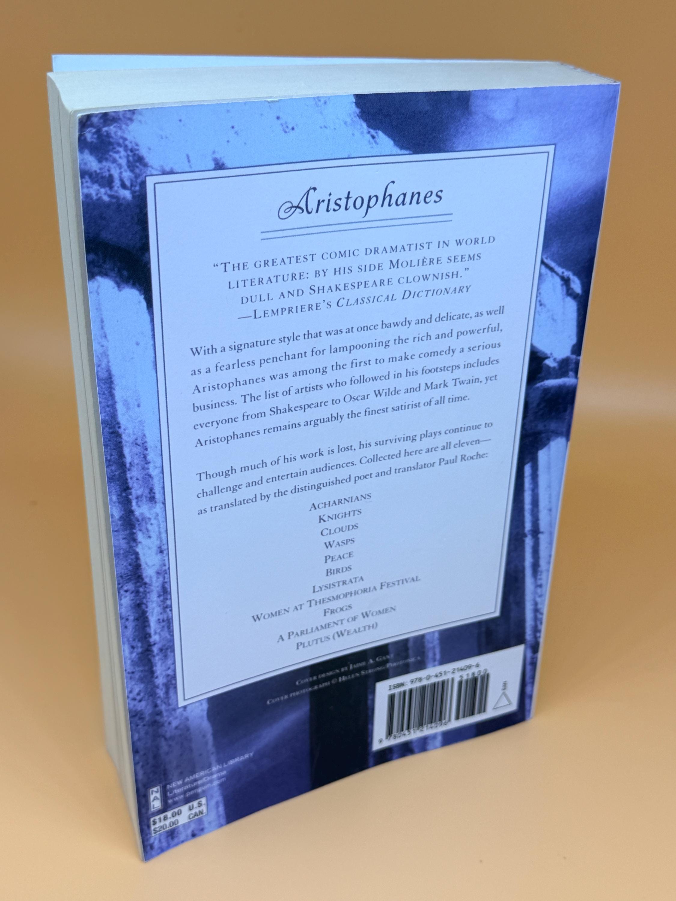 Aristophanes The Complete Plays by New American Library features new translations by Paul Roche. Aristophanes, the Ancient Greek playwright, was among the first to lampoon the rich and powerful. Other great authors followed in his footsteps from Shakespeare to Oscar Wilde, Mark Twain and more. Thought much of his work was lost, remaining plays continue to challenge readers and this edition contains all eleven known complete plays.
