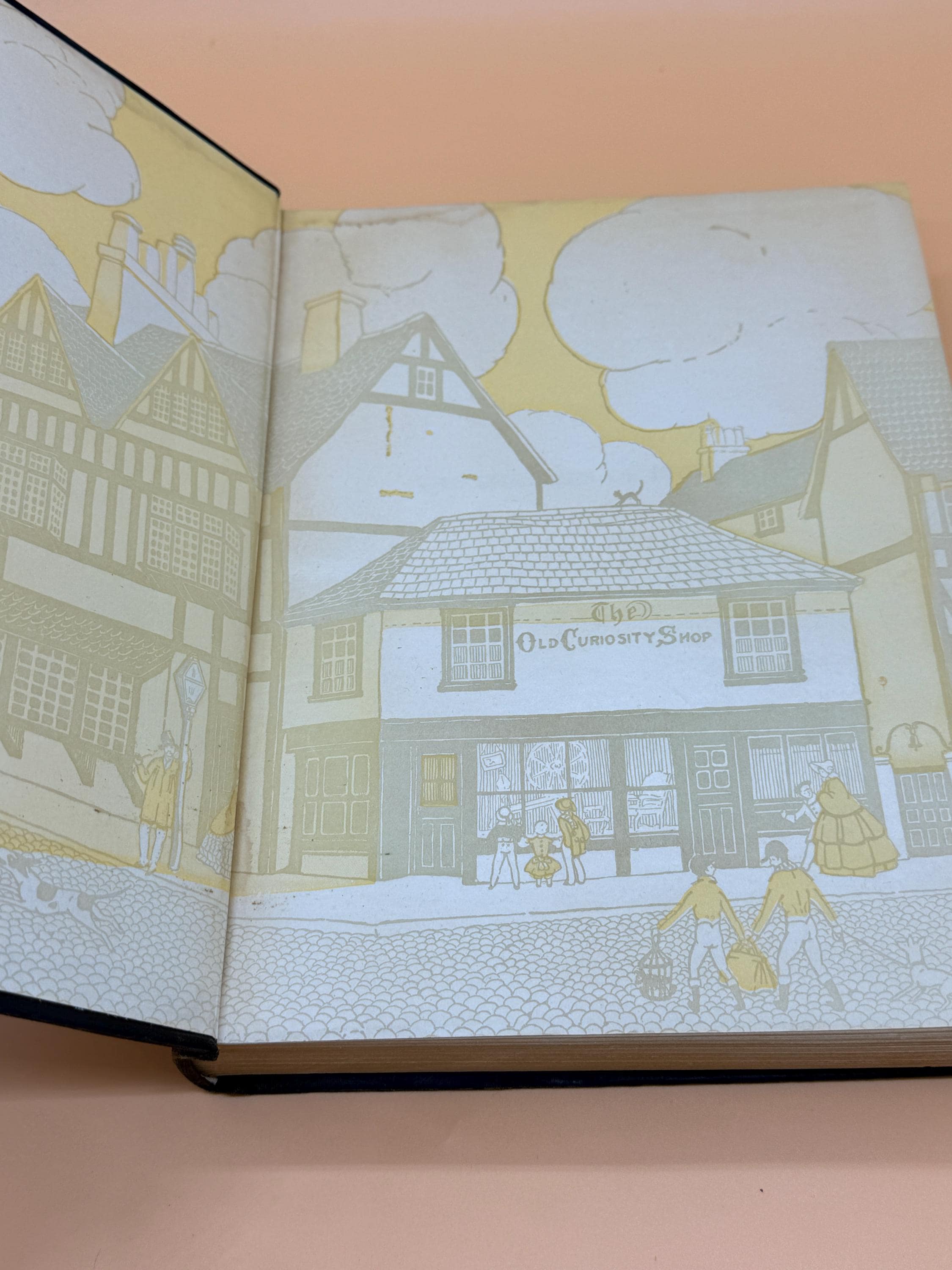 The hardcover boards are very good overall given age, with light shelf wear. The front features the original color paste-down of Tiny Tim.